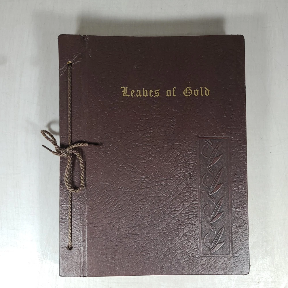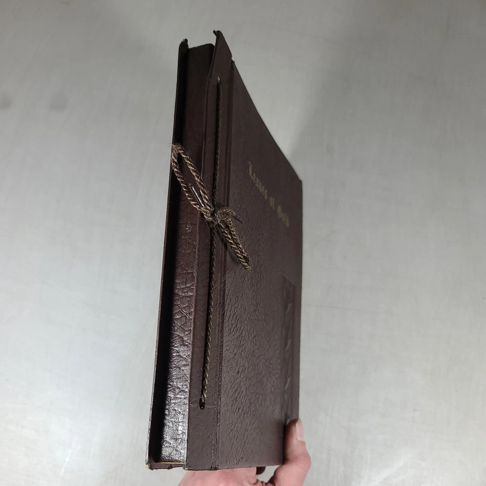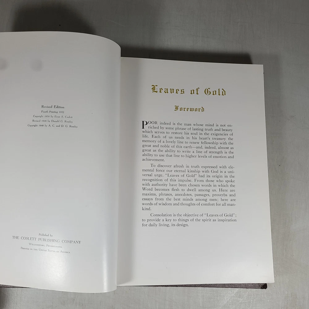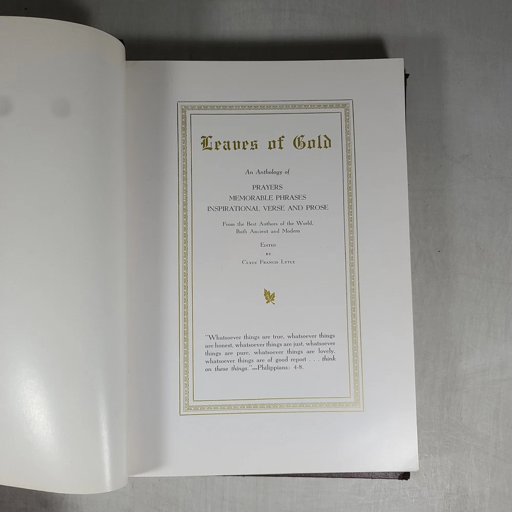 A leather-bound fourth edition of "Book Leaves of Gold" by Clyde Francis Lytle from 1952. Published by Grosset & Dunlap in the United States, this vintage hardcover book features a phrase book subject with large print. It is an original print in English, with no modifications or signatures. Leather bound and corded.
