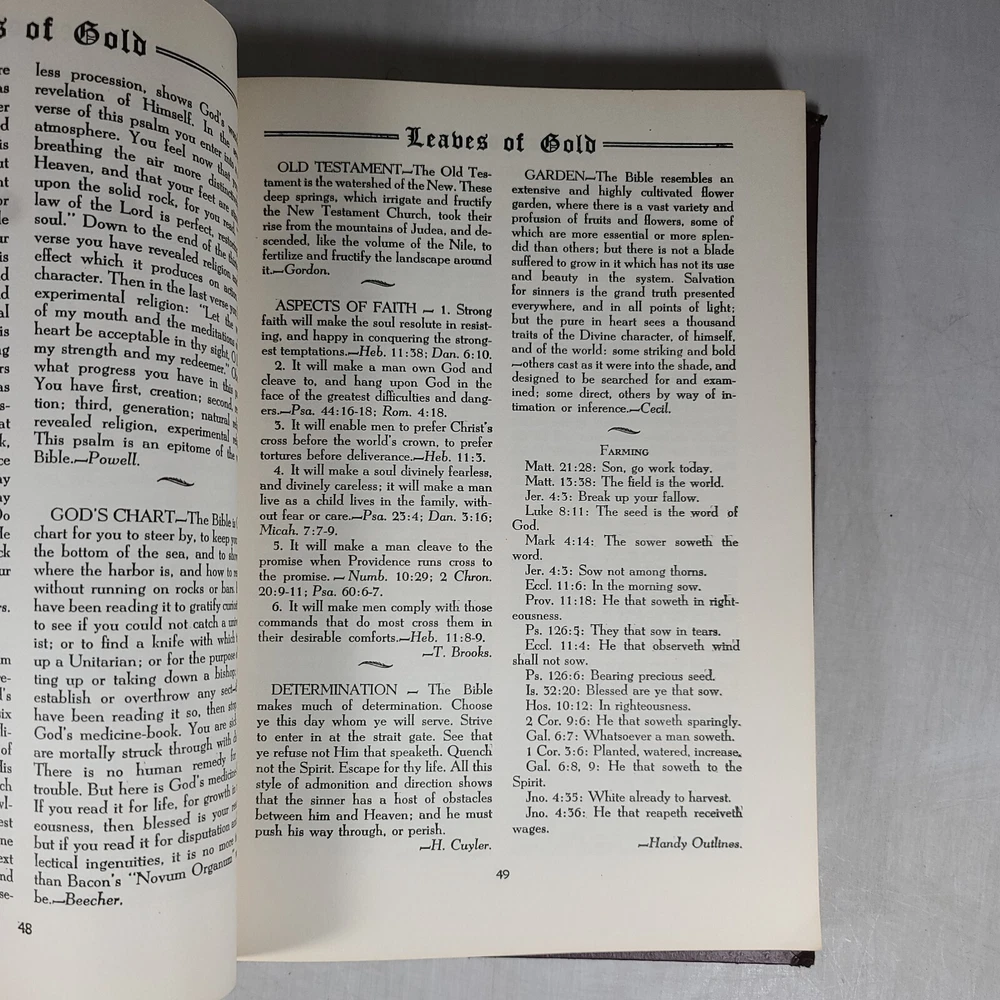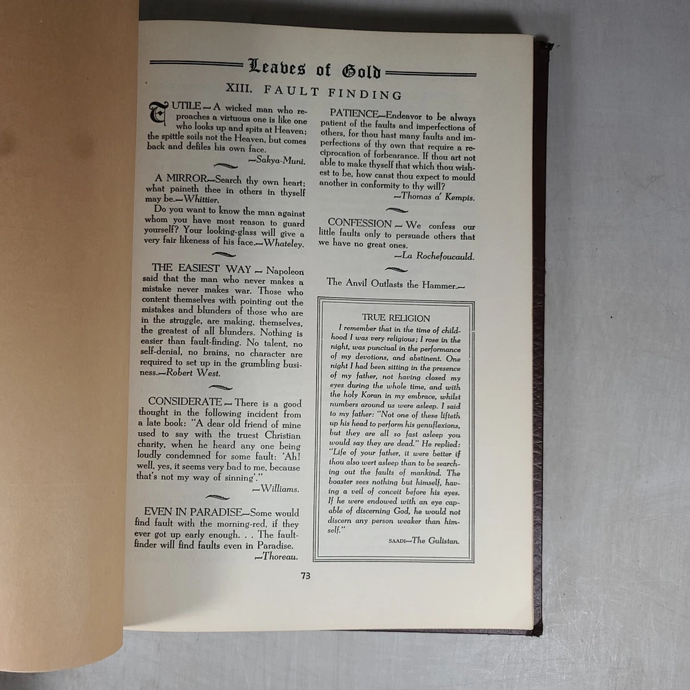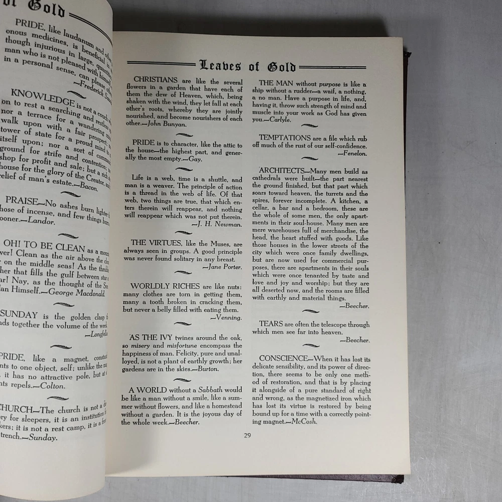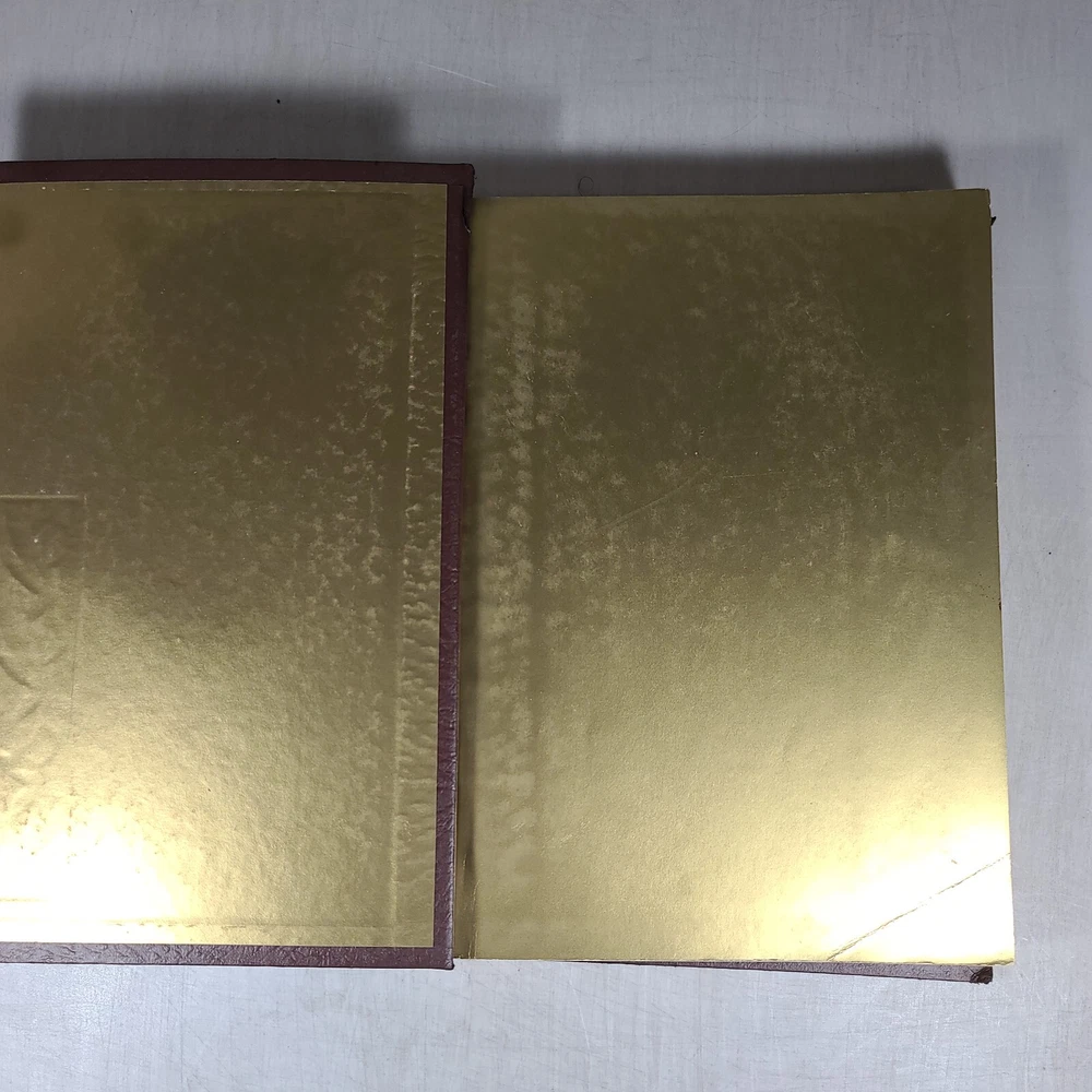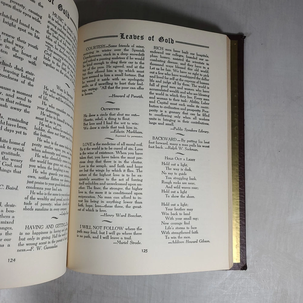 A leather-bound fourth edition of "Book Leaves of Gold" by Clyde Francis Lytle from 1952. Published by Grosset & Dunlap in the United States, this vintage hardcover book features a phrase book subject with large print. It is an original print in English, with no modifications or signatures. Leather bound and corded.