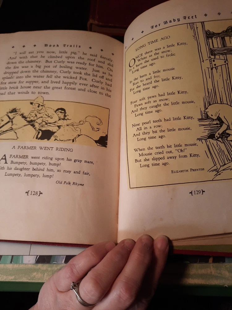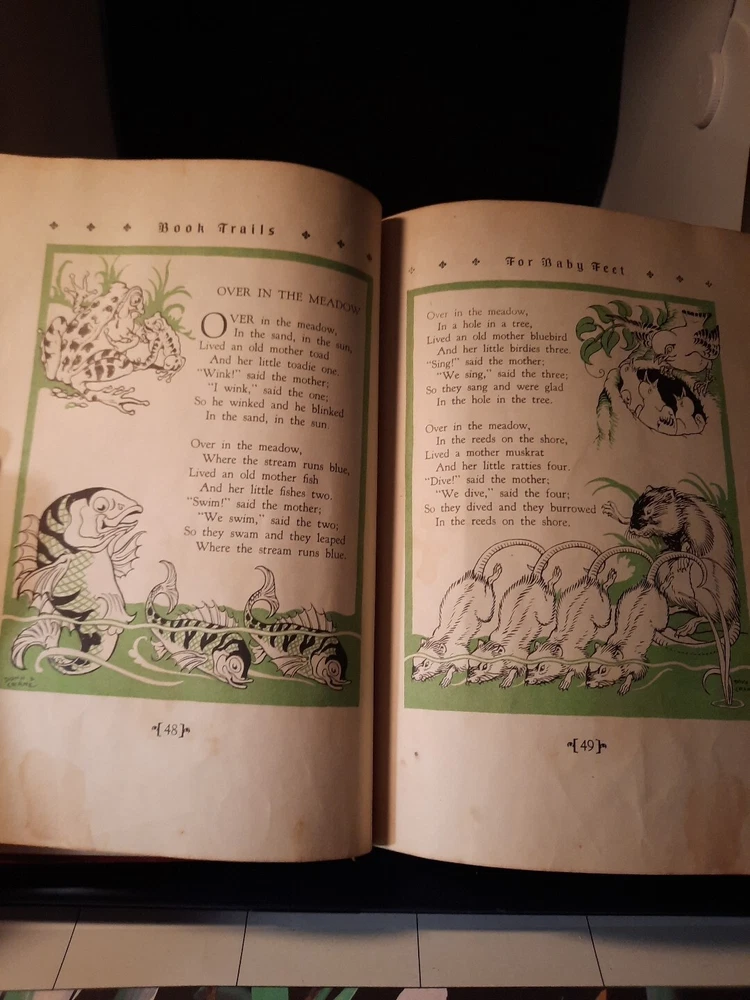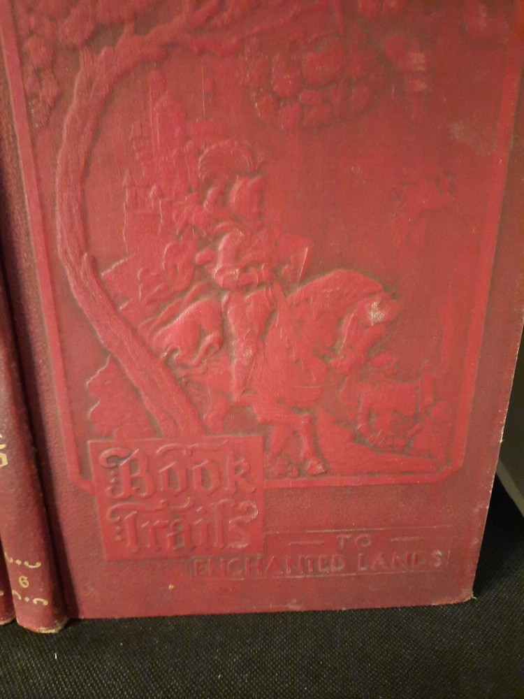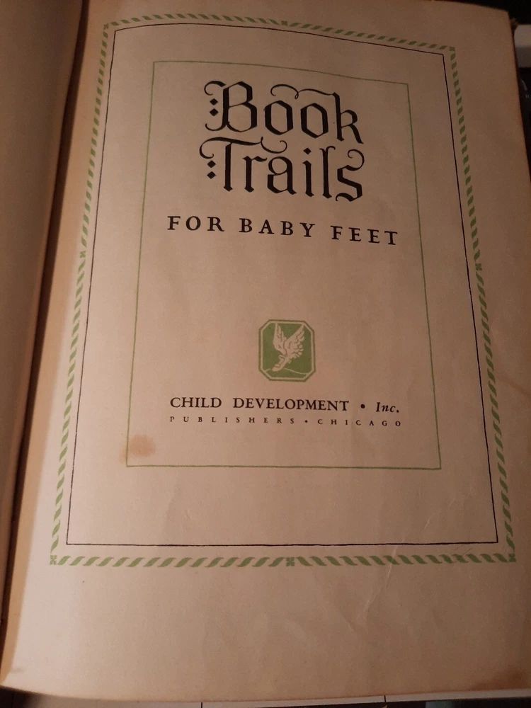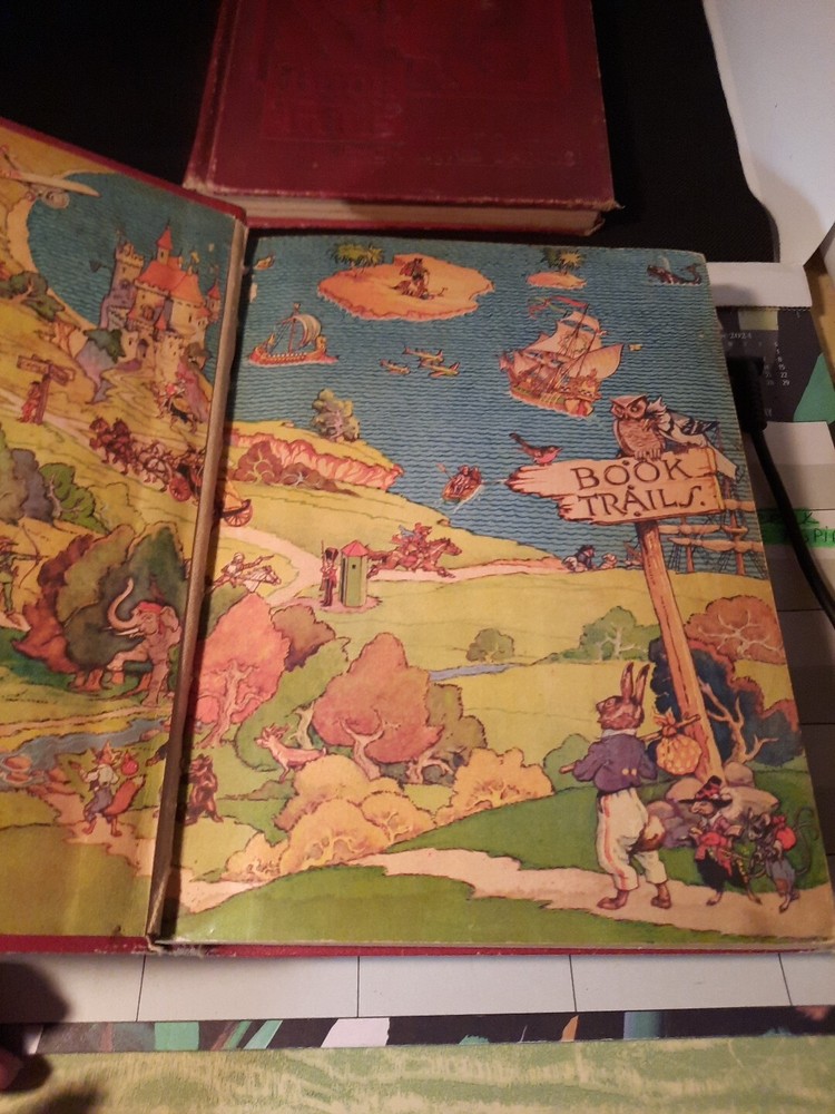 Book Trails Children's Series Volumes 1 and 6 are a pair of children's books published in 1946 by Child Development Inc. The books are illustrated in color and contain stories from multiple authors. The books are bound in leather and are part of a series of children's literature. The books are focused on enchanted and baby stories and were published in Lake Bluff, IL. They have been loved and used. No torn pages or marks but show wear, see pictures for condition.