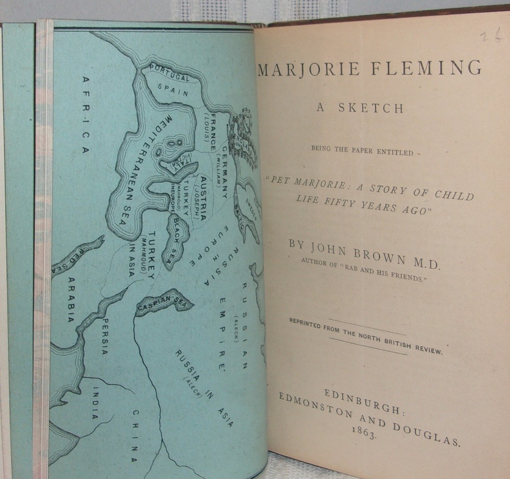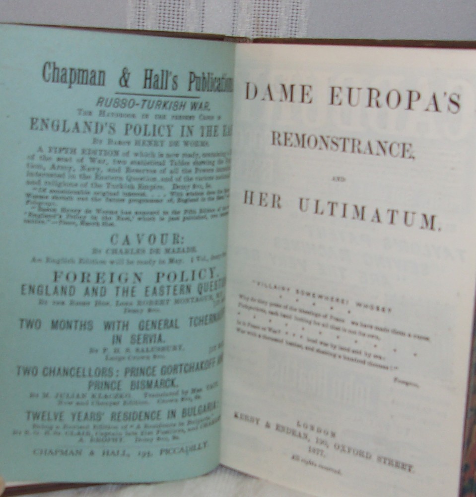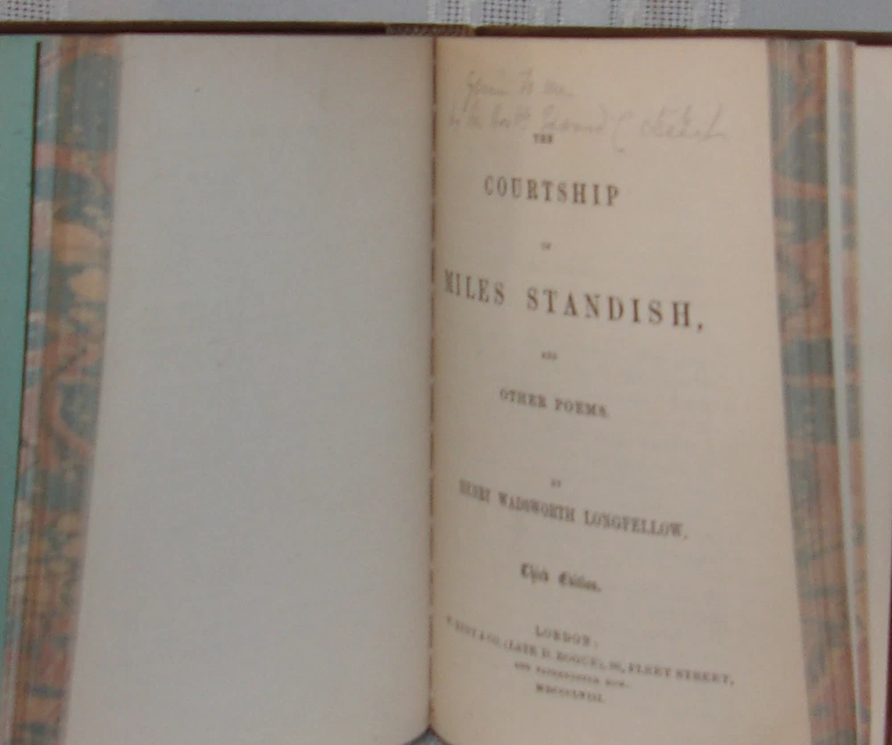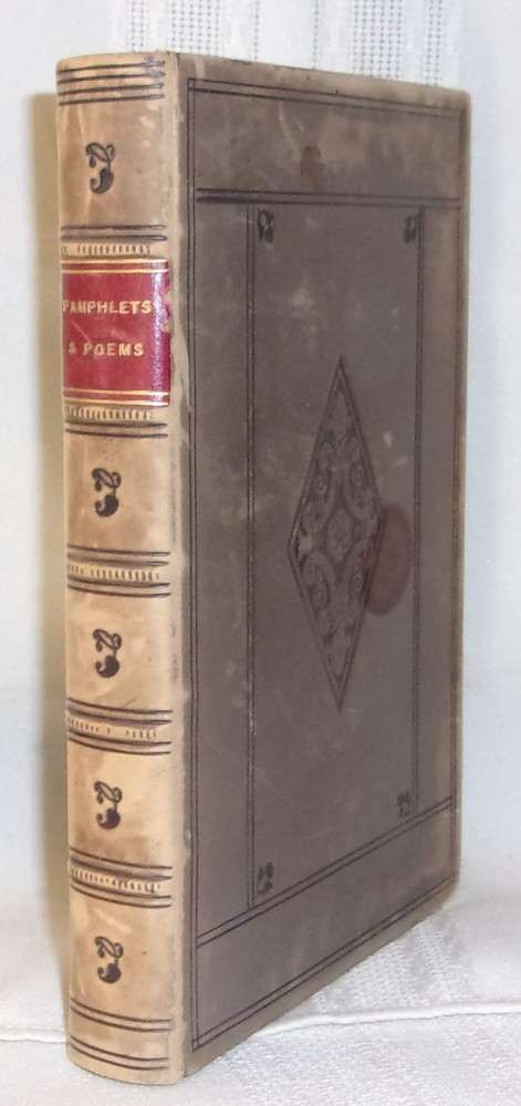 Pamphlets & Poems Bound collection of six individual publications Various publishers, circa 1885 Bound in full soft calfskin with a six-compartment spine with raised bands; titles on a maroon leather label with stamped black rules and fleur des lis to spine, embossed rules and decoration, with a diamond-shaped design to both covers; marbled endpapers and page edges. A very good copy with moderate rubbed wear and scuffing to the covers, front hinge cracked but holding. 12mo; total of 355 pages. A bound collection of the following publications: Dame Europa's Remonstrance, and Her Ultimatum ; anonymous [James Russell Endean]; London: Kerby & Endean, 1877 (Russo-Turkish War 1877-78). First edition. Wraps bound in. Marjorie Fleming: A Sketch ; John Brown, M.D.; Edinburgh: Edmonston and Douglas, 1863. First edition. Essay on Human Happiness ; C.B. Adderley, M.P.; London: John Ollivier, 1849. Probable first edition. Les Propos de Labienus ; A. Rogeard; Bruxelles: Chez Tous les Libraires, 1865. First edition. The Courtship of Miles Standish, and Other Poems ; Henry Wadsworth Longfellow; London: W. Kent & Co., 1858. (Third edition). Easy Lessons on Dairying ; Rev. Canon Bagot, LL.D; London and Dublin: W.H. Smith & Sons, 1883. First edition. Someone with means had an affinity for these particular publications and had them bound into a one-of-a-kind book. Most of the works bound in this volume are first editions. Free shipping to U.S.A. PLEASE VIEW OUR STORE FOR MORE GREAT FIRST EDITION BOOKS THANKS!