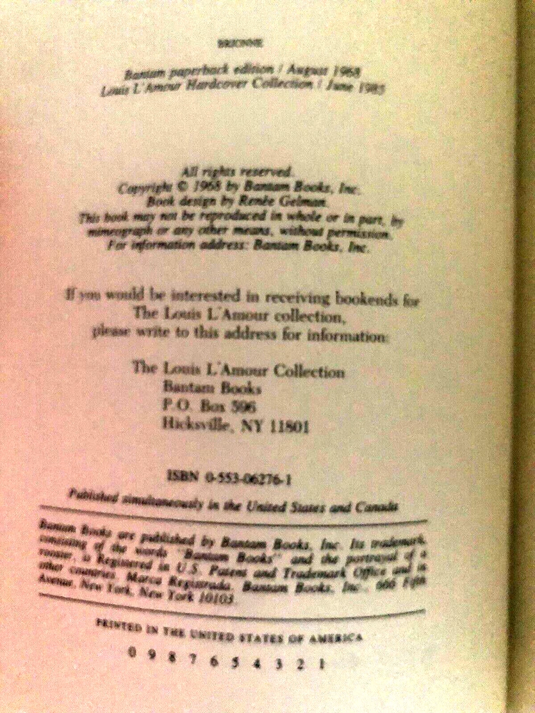 1968 imitation leather bound book, 133 pages; contains no photos. Book weighs approximately 1 pound; 9 1/4" x 6 1/4" x 3/4". Will be shipped in a box, mailed via Media Mail. Have other Louis L'Amour b...