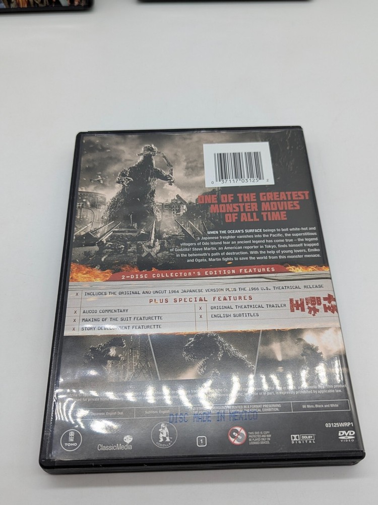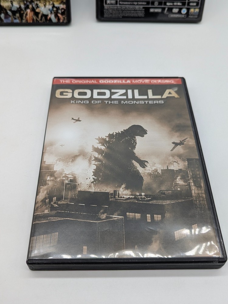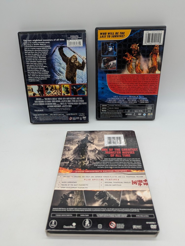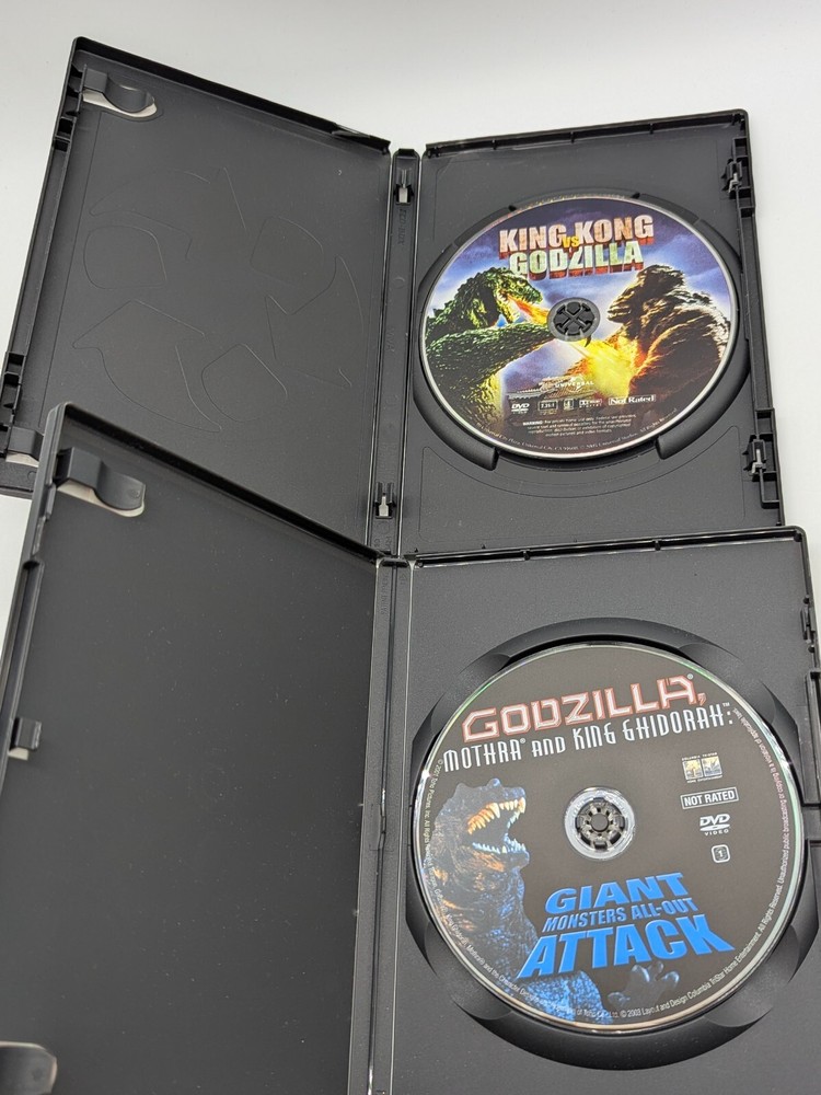 Bundle up with this collection of 3 vintage Godzilla DVDs, featuring iconic monsters King Kong, Mothra, and King Ghidorah. Immerse yourself in the thrilling world of monster battles with this action-packed set, complete with English and Japanese language options and English subtitles. Enjoy special features like commentary and original versions, all housed in classic tall DVD cases. Perfect for fans of the Godzilla franchise, this DVD bundle is a must-have addition to any movie collection. This lot includes Godzilla King of the Monsters, King Kong vs Godzilla, and Godzilla Giant Monsters all out Attack. This item is as seen in the photos. If you have any questions about the item please reach out. Be sure to check out our other listings for awesome & eclectic collectibles and more!