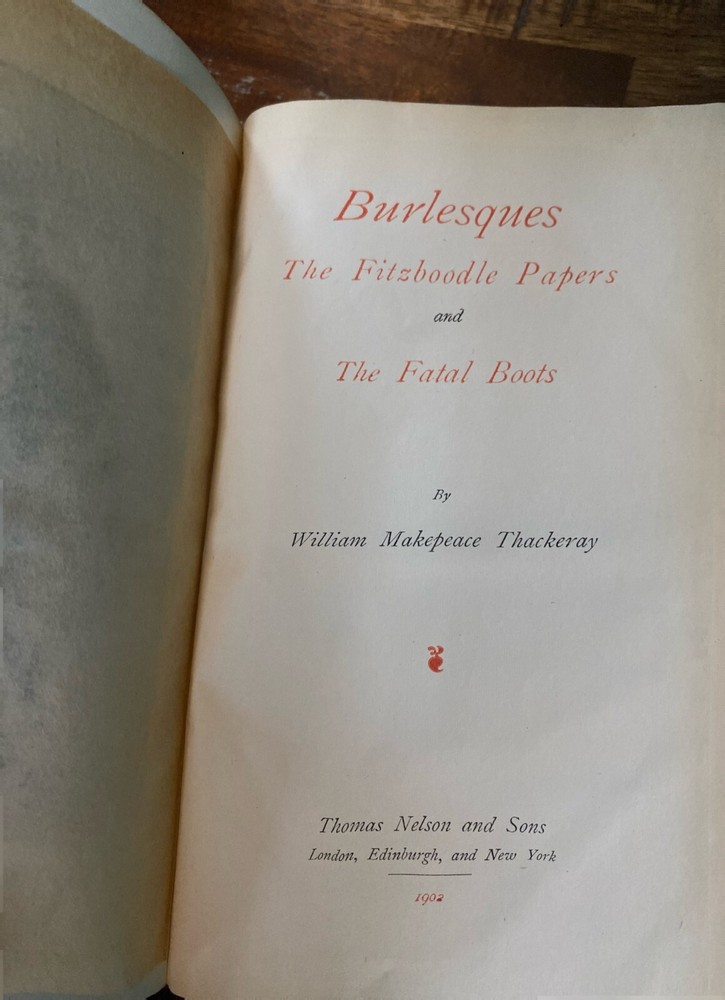 Burlesques, the Fitzboodle Papers and the Fatal Boots by W.M. (William Makepeace) Thackeray 1902 Thomas, Nelson and Sons leatherbound. New Century Library Volume VII. We use the industry standards when grading our books. New- Brand spanking new, an unread, uncirculated copy. Like New- A book with minimal wear all around, possibly unread. Very Good- A book with some minor cosmetic defects. A remainder mark may be present. Minimal writing, if any, on the interior. Good- A book that is completely intact but may show signs of heavier wear, especially the spine. May have writing on the interior, though not extensive throughout. Acceptable- A book that is intact but shows signs of heavy wear. May have extensive writing or highlights throughout. The book is complete, but that may be all that it has going for it. Though we strive for our books to all be in very good to like new condition, some rare and eclectic volumes may be lower condition. I am happy to answer any questions you may have about printings, publication years, bindings, etc. If you would like to see a picture, or additional pictures, just ask me and I will prioritize your request. Combined shipping on books! An extra $1.00 per additional book past the first. I am constantly getting new books, comics, and other ephemera. Check out my other items!