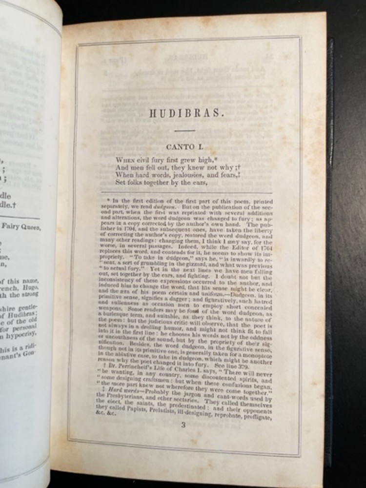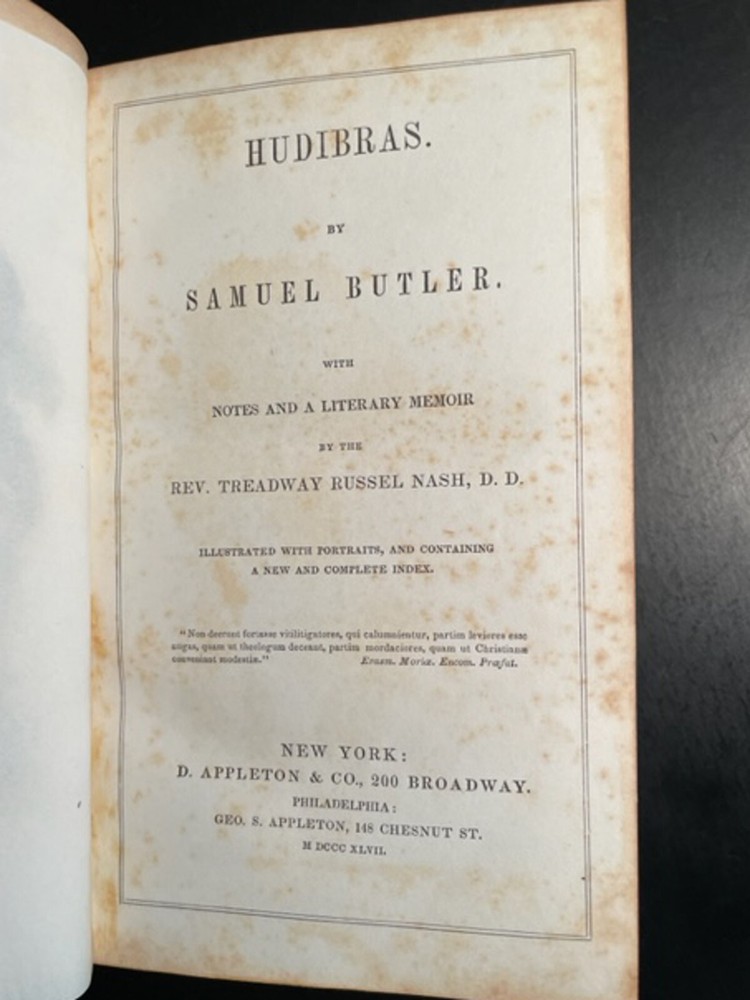 Butler,Samuel. HUDIBRAS. New York:D. Appleton,1847 . With notes and a literary memoir by Rev. Rev. Treadway Russell Nash. Illustrated with portraits and containing a new and complete Index. Frontis of Charles the First under tissue. 498 pp. about 5"x7". Bound in three-quarter blue leather, gilt ruled, five slightly raised bands, decorations in compartments, all edges gilt, marbled endpapers, CONDITION: Slight foxing to frontis, slight external edge wear, front pastedown has a faint staining perhaps from a bookplate removal. all else near fine with a nice shelf appearance. TERMS: By bidding you are agreeing to settle the transaction within three business days. Shipping is $5.00 to U.S. bidders via media rate. Tracking will be provided. International bidders please use eBay's Global shipping program. Returns accepted within thirty days for any reason with prior approval. You must be pleased. The book in the photograph is the item you will receive.