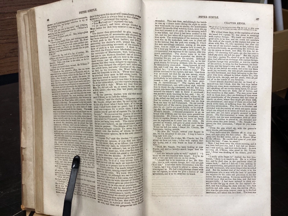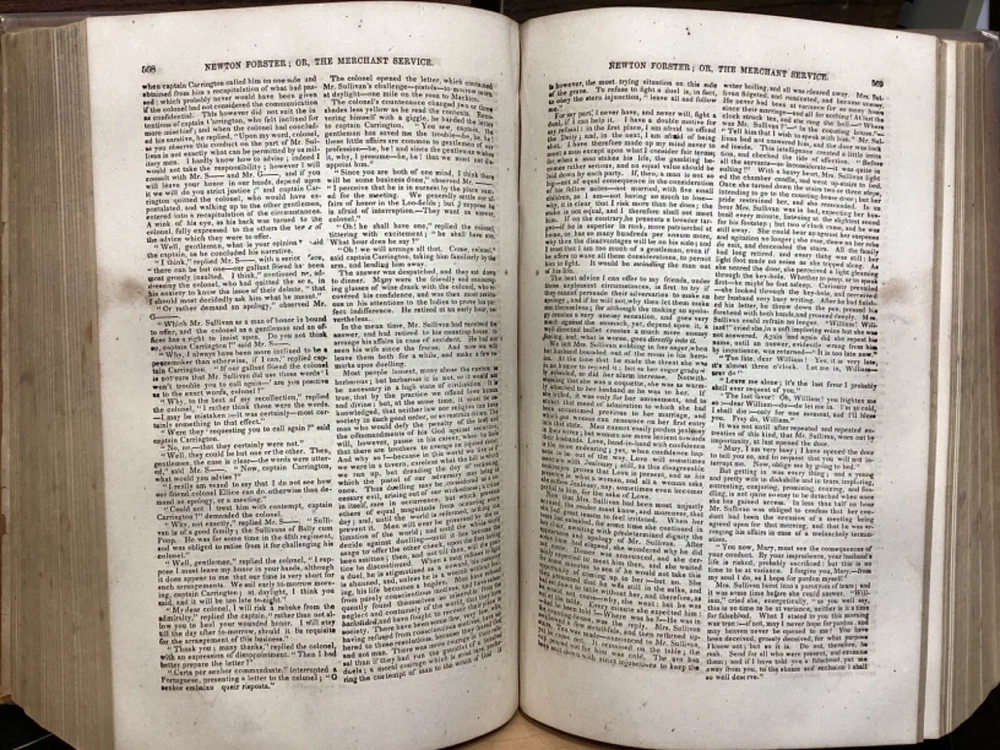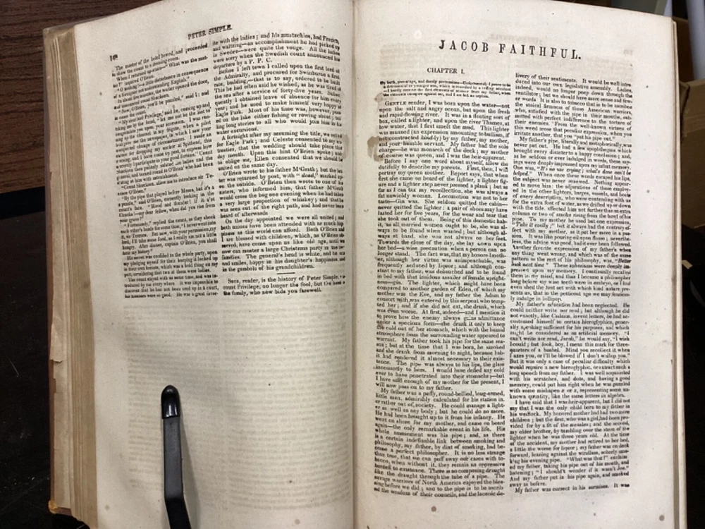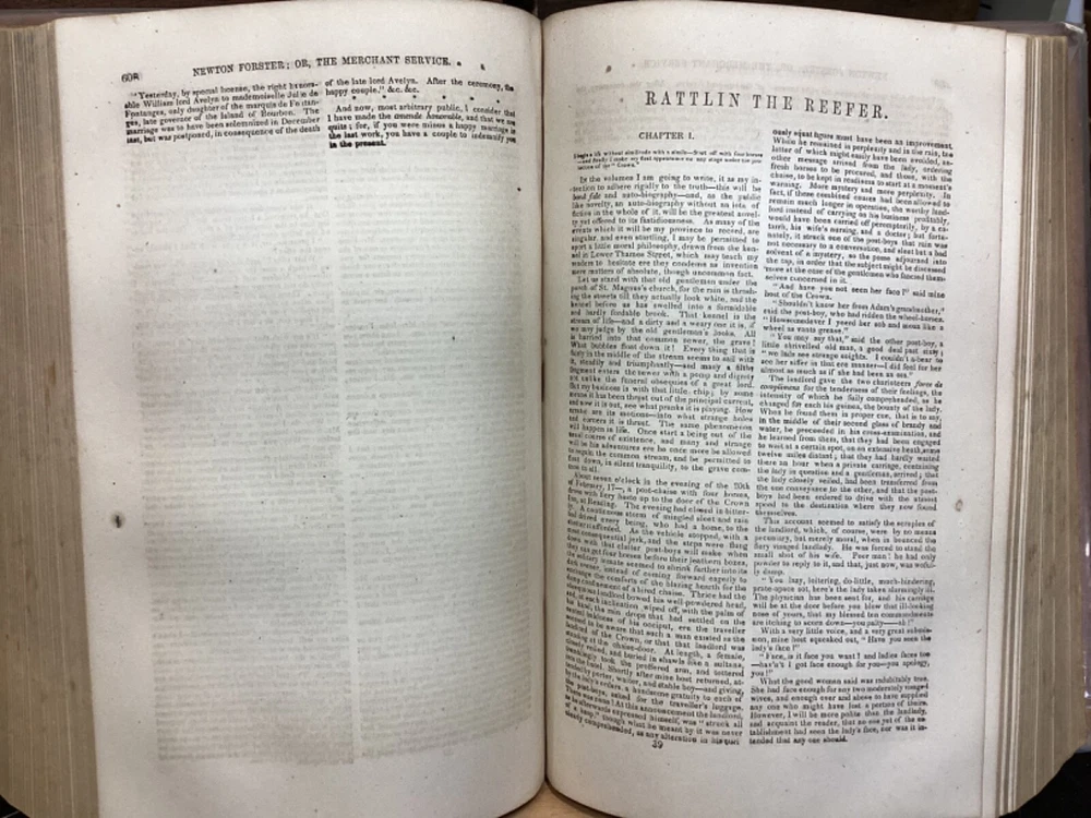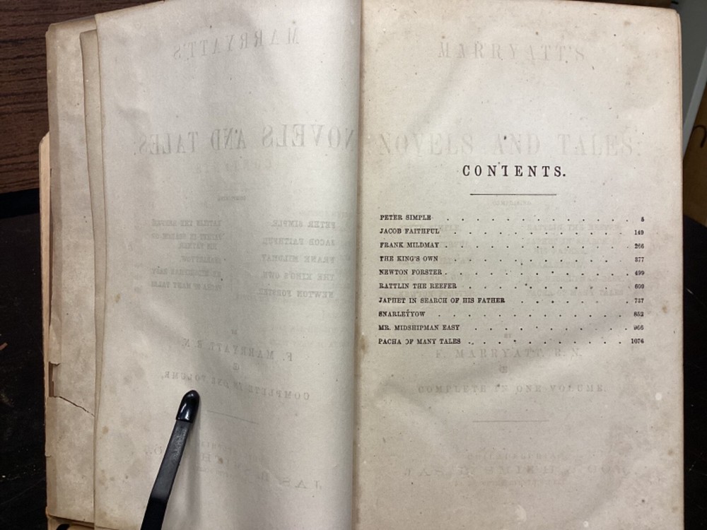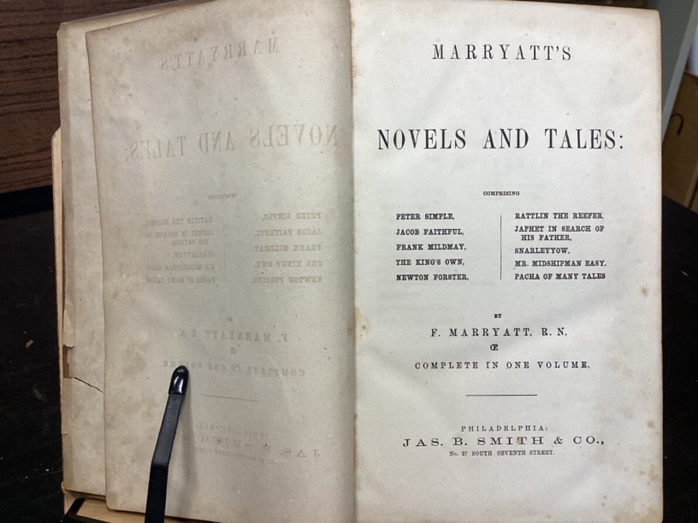 Marryatt's Novels and Tales by F. Marryatt, R.N., Complete in One Volume, Jas. B. Smith & Co., Philadelphia, c. 1840, 1183pp, leather, 6 x 9.5", 8vo Fair condition. Wear to front and rear boards. Tips are bumped. Title compartment of spine still legible. First compartment is lacking. Protective plastic cover secured with tape on pastedowns. Marbling to fore edges. Provenance on flyleaf; no other known marginalia. Front hinge is cracked. Toning, age-staining, tea-staining, and finger-staining throughout textblock. Please see photos. Captain Frederick Marryat (10 July 1792 - 9 August 1848) was a Royal Navy officer and a novelist. He is noted today as an early pioneer of nautical fiction, particularly for his semi-autobiographical novel Mr. Midshipman Easy (1836). He is remembered also for his children's novel The Children of the New Forest (1847). In addition, he developed a widely used system of maritime flag signaling, known as Marryat's Code. FORN-MSB-0424-TUB0021-JC452