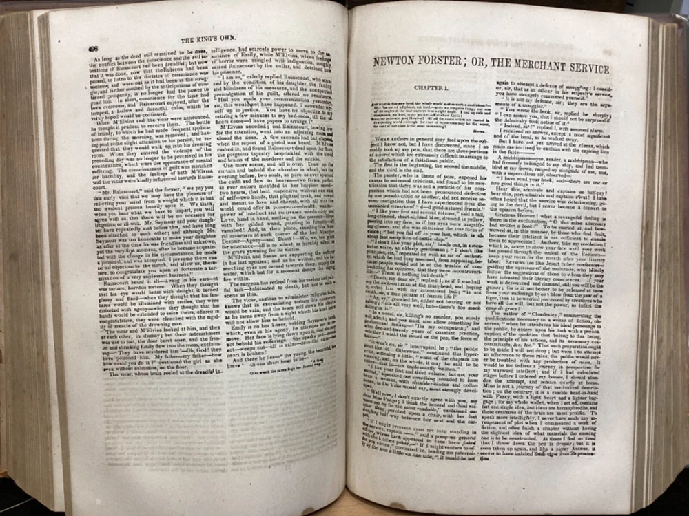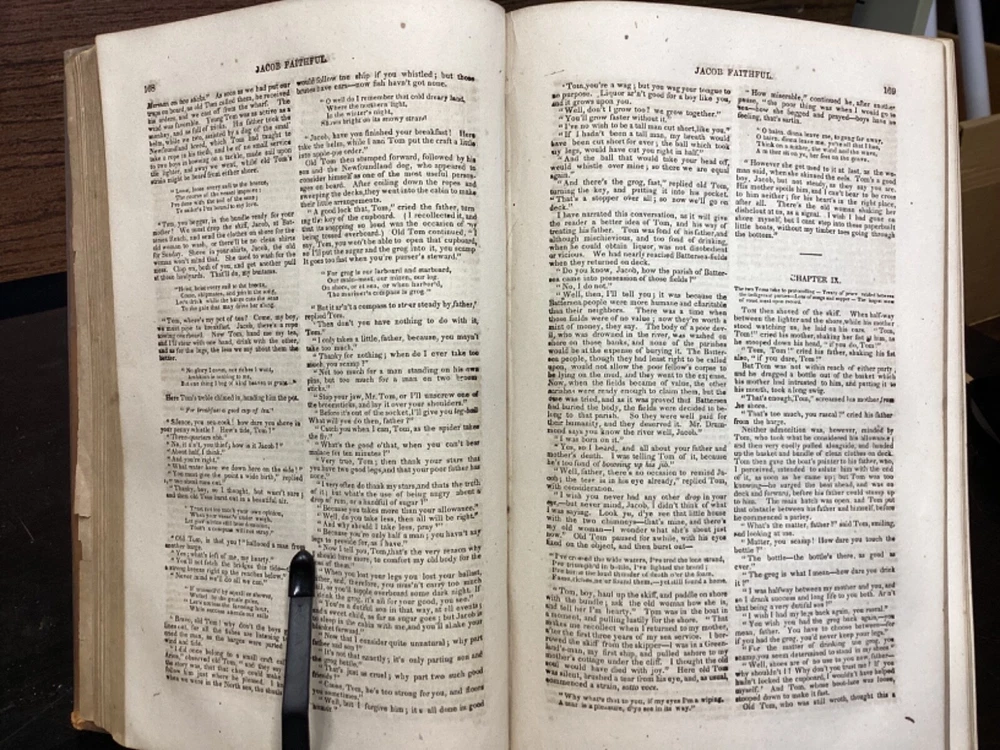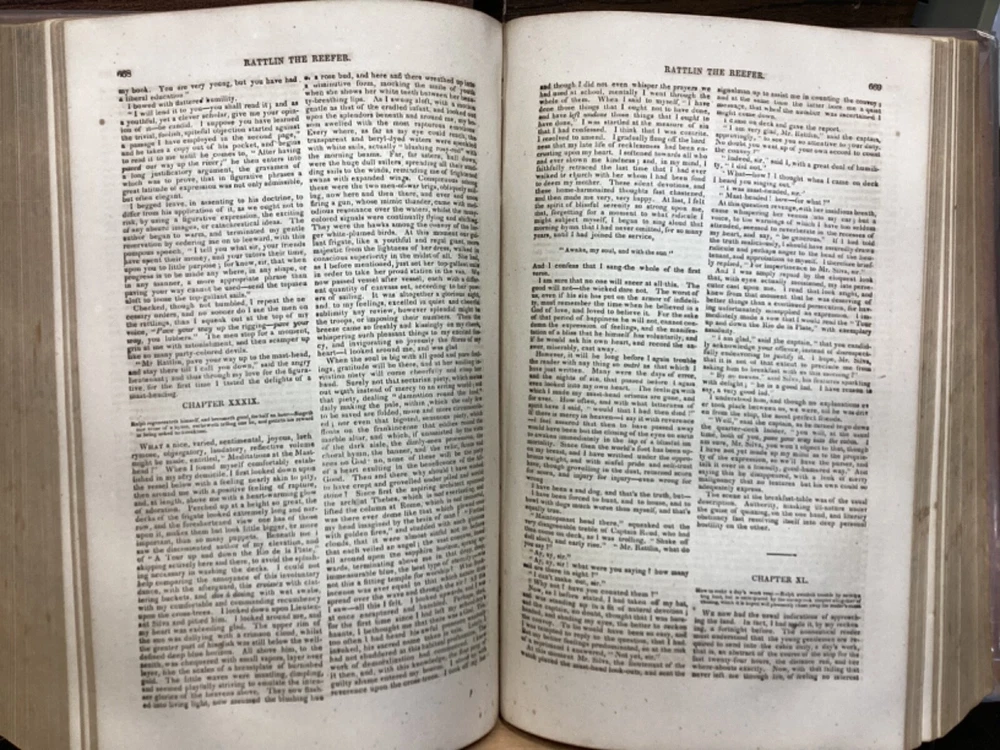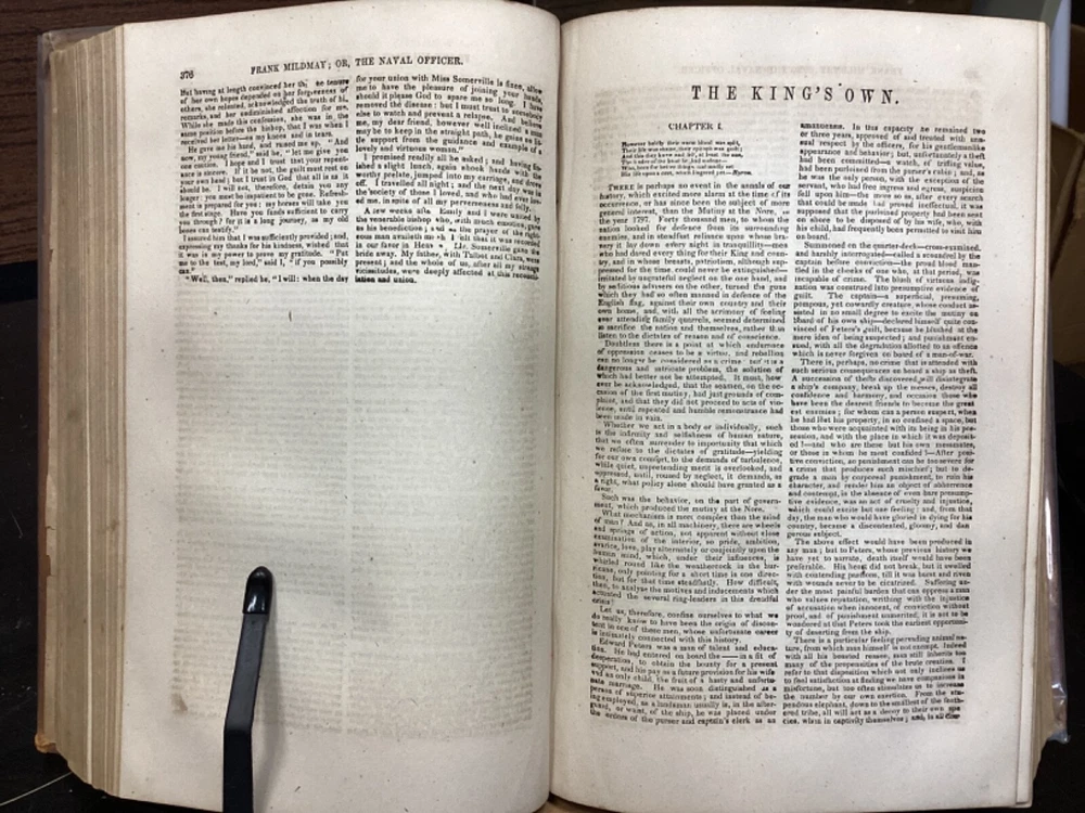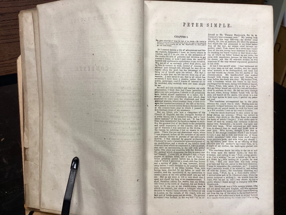 Marryatt's Novels and Tales by F. Marryatt, R.N., Complete in One Volume, Jas. B. Smith & Co., Philadelphia, c. 1840, 1183pp, leather, 6 x 9.5", 8vo Fair condition. Wear to front and rear boards. Tips are bumped. Title compartment of spine still legible. First compartment is lacking. Protective plastic cover secured with tape on pastedowns. Marbling to fore edges. Provenance on flyleaf; no other known marginalia. Front hinge is cracked. Toning, age-staining, tea-staining, and finger-staining throughout textblock. Please see photos. Captain Frederick Marryat (10 July 1792 - 9 August 1848) was a Royal Navy officer and a novelist. He is noted today as an early pioneer of nautical fiction, particularly for his semi-autobiographical novel Mr. Midshipman Easy (1836). He is remembered also for his children's novel The Children of the New Forest (1847). In addition, he developed a widely used system of maritime flag signaling, known as Marryat's Code. FORN-MSB-0424-TUB0021-JC452