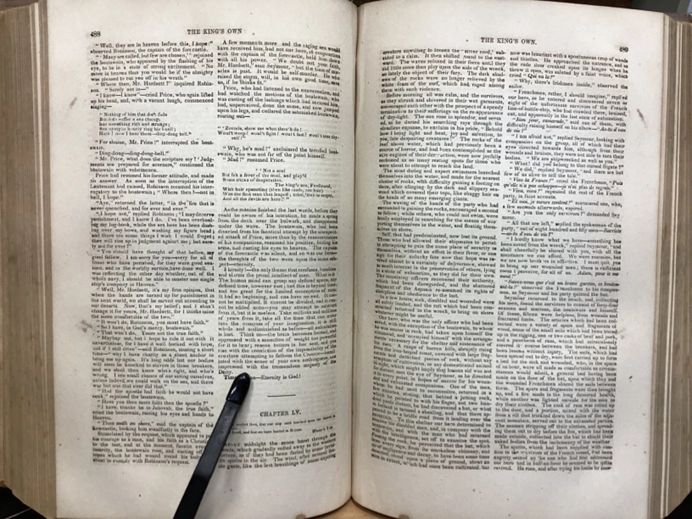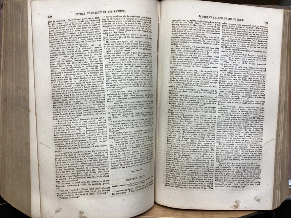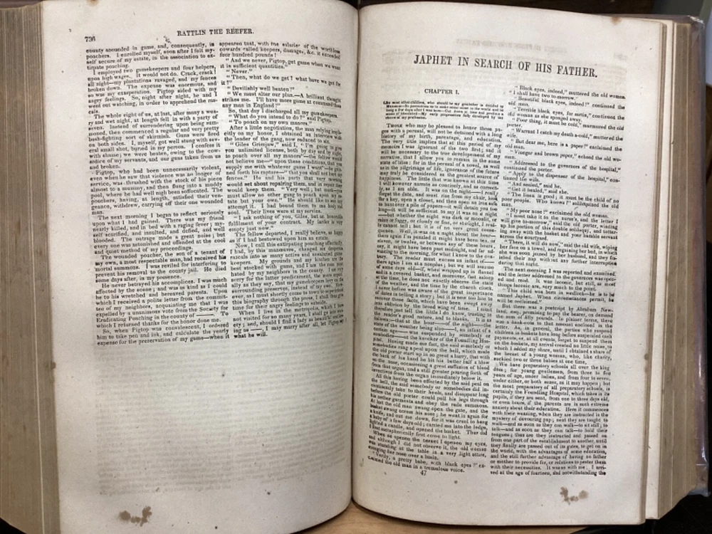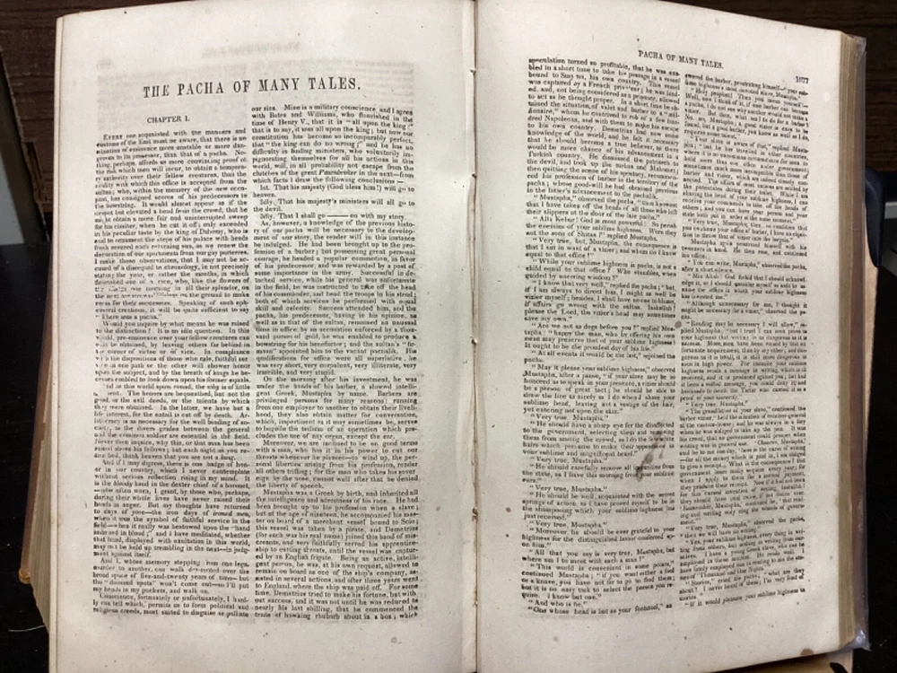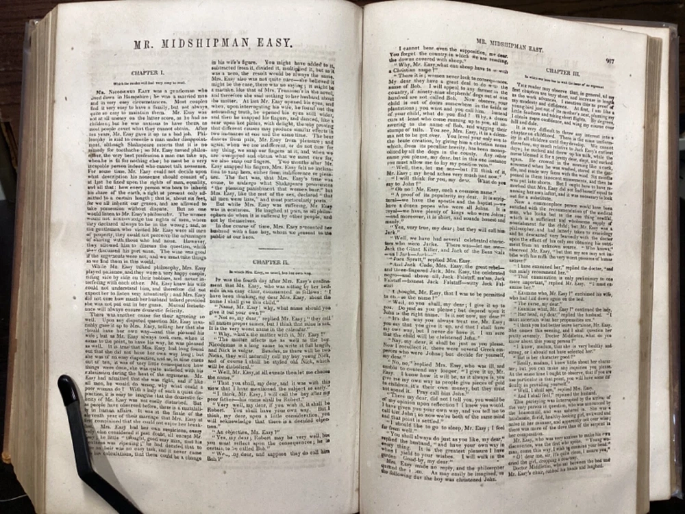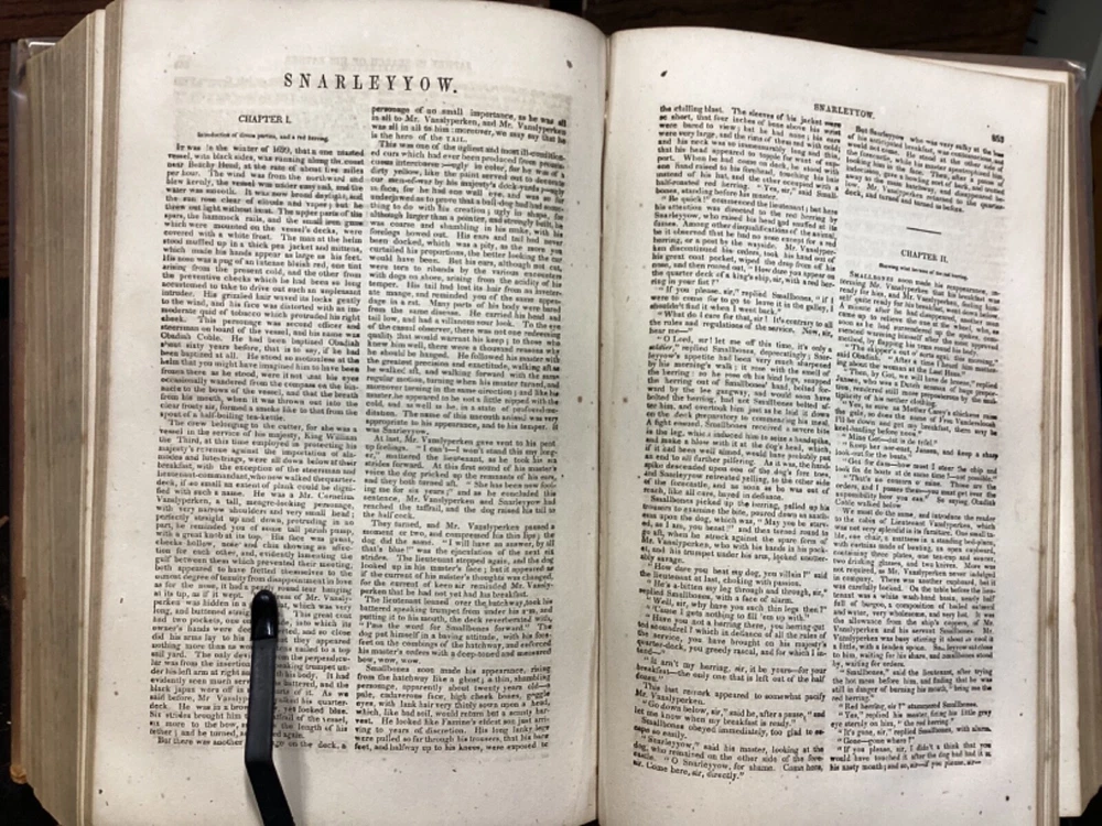 Marryatt's Novels and Tales by F. Marryatt, R.N., Complete in One Volume, Jas. B. Smith & Co., Philadelphia, c. 1840, 1183pp, leather, 6 x 9.5", 8vo Fair condition. Wear to front and rear boards. Tips are bumped. Title compartment of spine still legible. First compartment is lacking. Protective plastic cover secured with tape on pastedowns. Marbling to fore edges. Provenance on flyleaf; no other known marginalia. Front hinge is cracked. Toning, age-staining, tea-staining, and finger-staining throughout textblock. Please see photos. Captain Frederick Marryat (10 July 1792 - 9 August 1848) was a Royal Navy officer and a novelist. He is noted today as an early pioneer of nautical fiction, particularly for his semi-autobiographical novel Mr. Midshipman Easy (1836). He is remembered also for his children's novel The Children of the New Forest (1847). In addition, he developed a widely used system of maritime flag signaling, known as Marryat's Code. FORN-MSB-0424-TUB0021-JC452