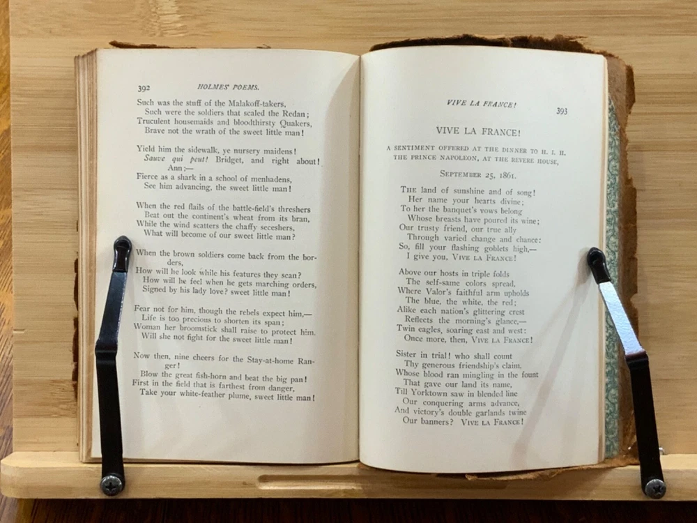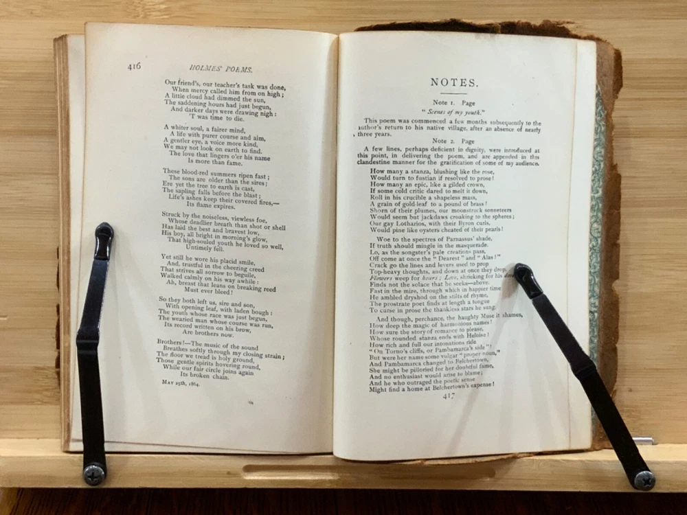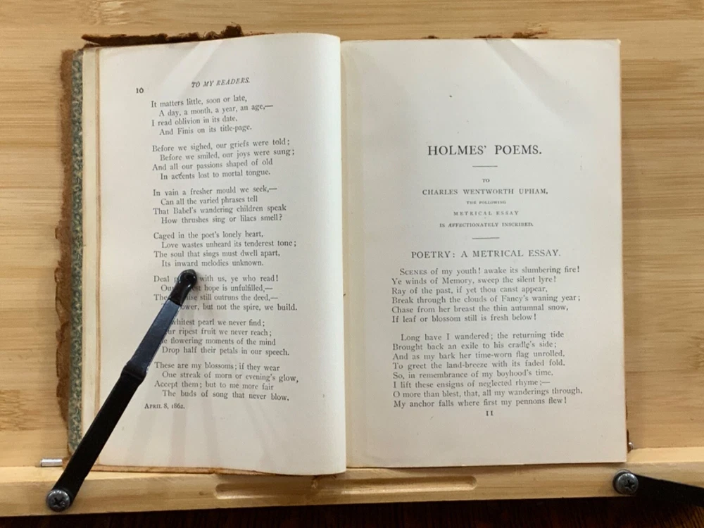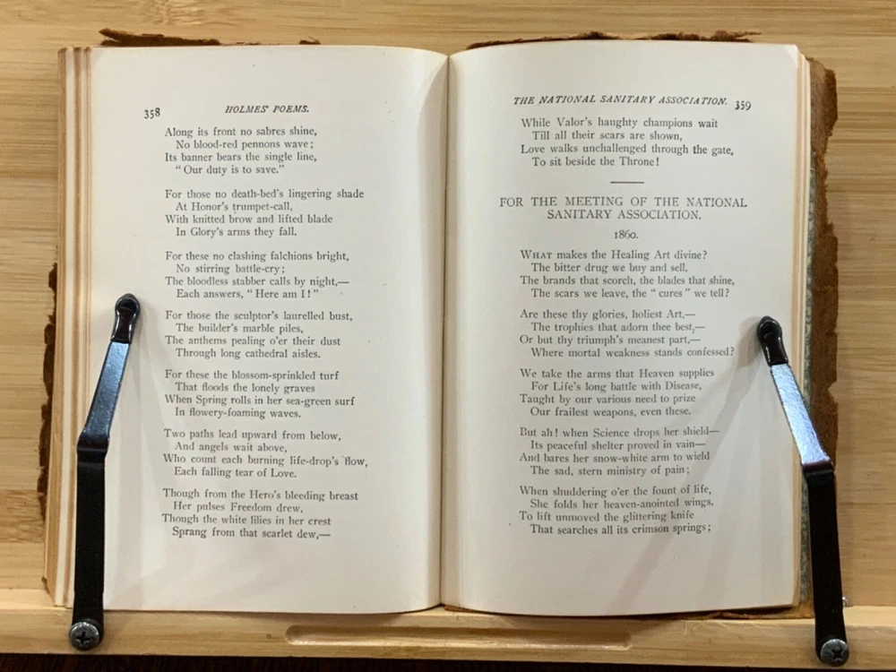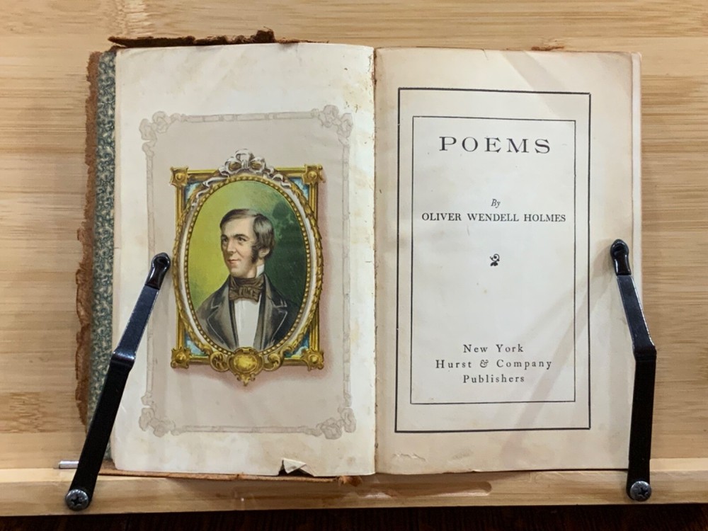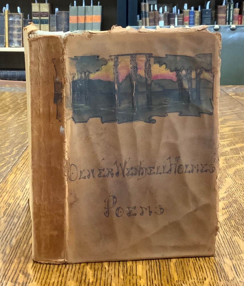 Poems by Oliver Wendell Holmes, New York: Hurst & Company Publishers, C. 1860, paper-back leather, 420 pp, 7 x 5", 12mo. In fair condition. Paper boards are covered in leather, possibly hand-bound. Head and tail of spine collapsed, binding exposed. Leather is chipped and bent at edges. Red-rot present. Top edge of text-block gilt. Black painted title lightly dulled, but still legible. Both gutters split, binding mesh exposed. Previous ownership and signature on front fly. Light toning and foxing through text-block. A complete work, all pages present. Some instances of marginalia. Binding intact. Please see photos. Oliver Wendell Holmes Sr. (1809-1894) was a writer, doctor, and educator born in Cambridge, MA. He earned a BA at Harvard University in 1829 and an MD from Harvard Medical School in 1836. He was part of a group of New England based writers called the Fireside Poets, which included William Cullen Bryant, Henry Wadsworth Longfellow, James Russell Lowell, and John Greenleaf Whittier. He also developed a friendship with Ralph Waldo Emerson. FORN-MSB-0823-0738-HK486