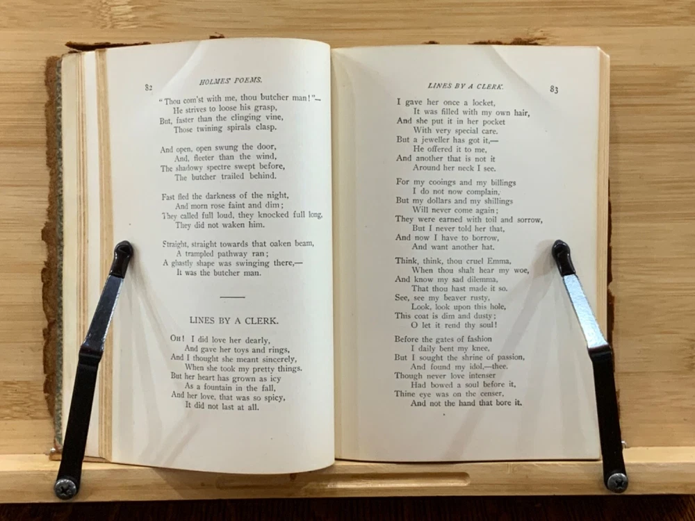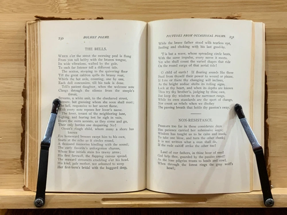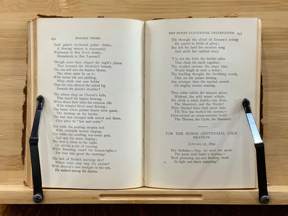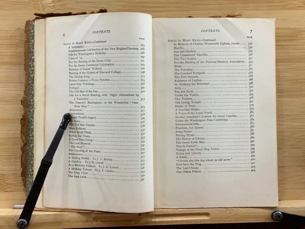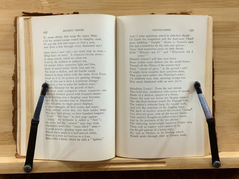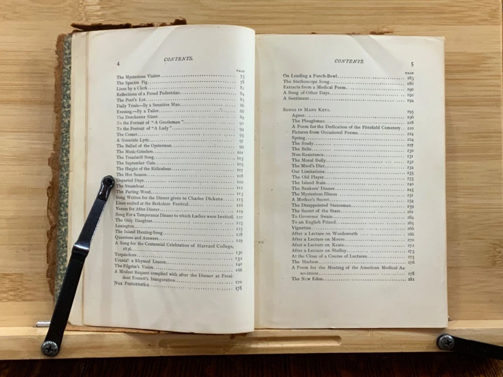 Poems by Oliver Wendell Holmes, New York: Hurst & Company Publishers, C. 1860, paper-back leather, 420 pp, 7 x 5", 12mo. In fair condition. Paper boards are covered in leather, possibly hand-bound. Head and tail of spine collapsed, binding exposed. Leather is chipped and bent at edges. Red-rot present. Top edge of text-block gilt. Black painted title lightly dulled, but still legible. Both gutters split, binding mesh exposed. Previous ownership and signature on front fly. Light toning and foxing through text-block. A complete work, all pages present. Some instances of marginalia. Binding intact. Please see photos. Oliver Wendell Holmes Sr. (1809-1894) was a writer, doctor, and educator born in Cambridge, MA. He earned a BA at Harvard University in 1829 and an MD from Harvard Medical School in 1836. He was part of a group of New England based writers called the Fireside Poets, which included William Cullen Bryant, Henry Wadsworth Longfellow, James Russell Lowell, and John Greenleaf Whittier. He also developed a friendship with Ralph Waldo Emerson. FORN-MSB-0823-0738-HK486