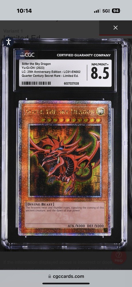 This is a limited edition Slifer the Sky Dragon card from the Yu-Gi-Oh! TCG Legendary Collection: 25th Anniversary Edition. The card is a Quarter Century Secret Rare with a CGC grade of 8.5. It features the Divine-Beast creature type and has 0 defense/toughness and 0 attack/power. The card is in English and has the card number LC01-EN002. Konami manufactured the card and it is an effect type card with divine color attributes.