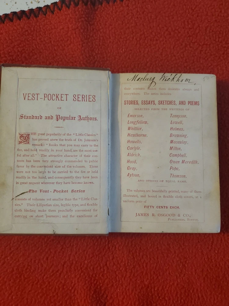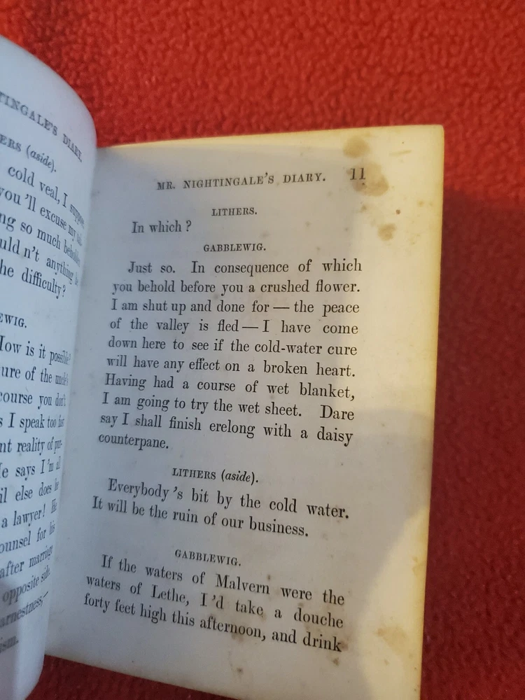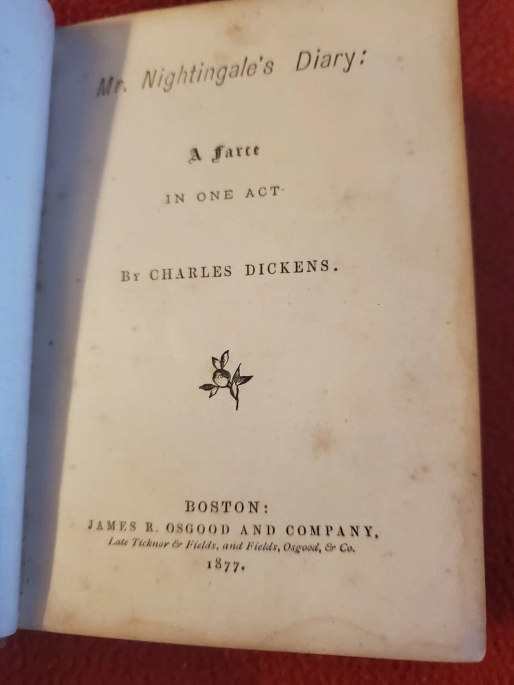 CHARLES DICKENS MR. NIGHTINGALE'S DIARY A Farce in One Act Vest-Pocket Series. Shipped with USPS First Class Mail. For sale we have this extremely rare vest-pocket series 1877 Charles Dickens Play Book. These are very hard to come by. As you can see it shows wear around the edges and some small water marks on some pages. Overall due to the rarity of the book in this small pocket size edition being 143 years old its not in too bad of condition. Happy Bidding. We strive for good feedback and describe our items to the best of our ability. If you have any questions or problems please contact us prior to leaving neutral or negative feedback. Please watch our store as we are always adding unique items. We ship our items within one day of cleared payment excluding weekends.