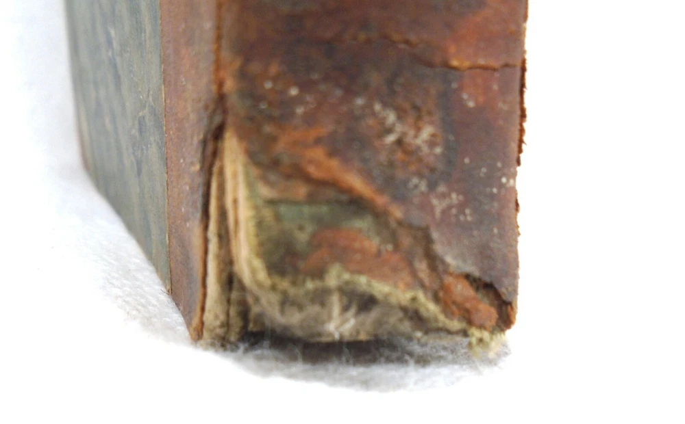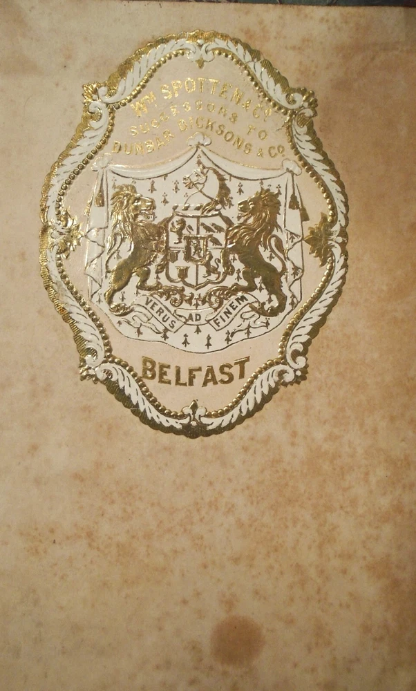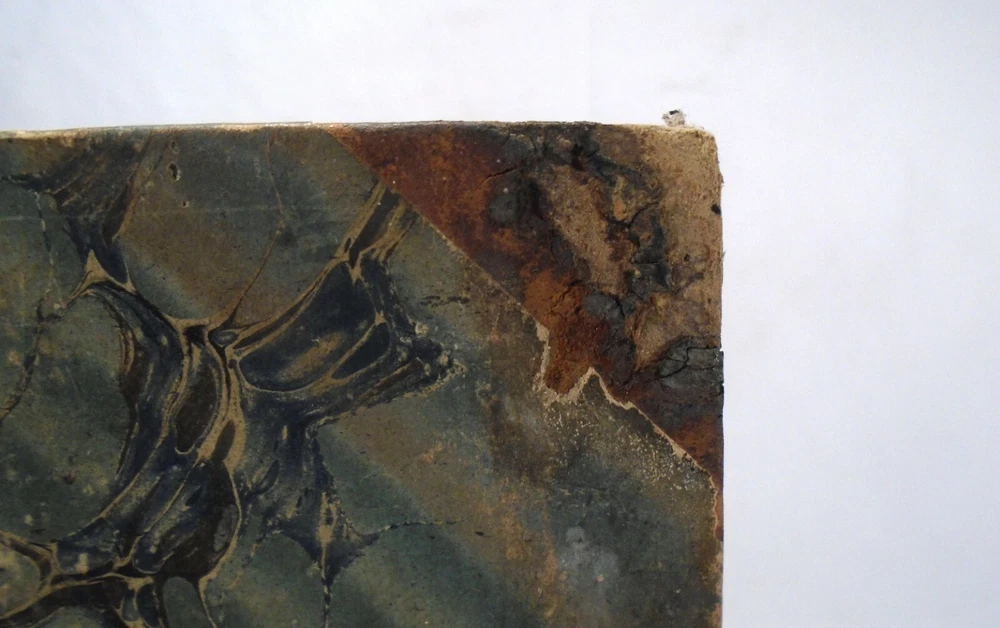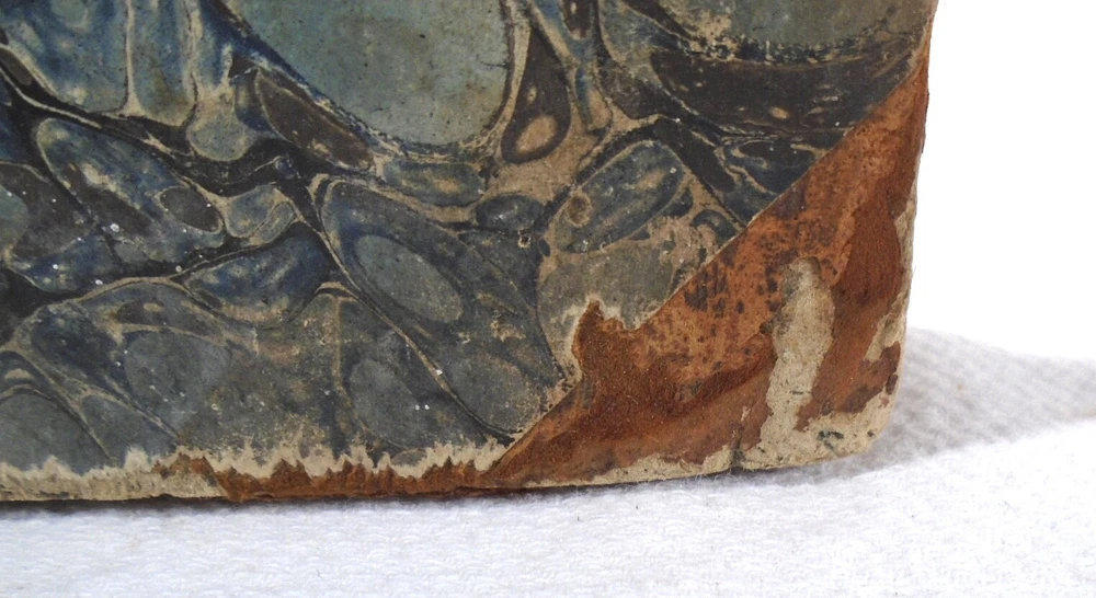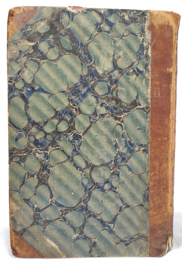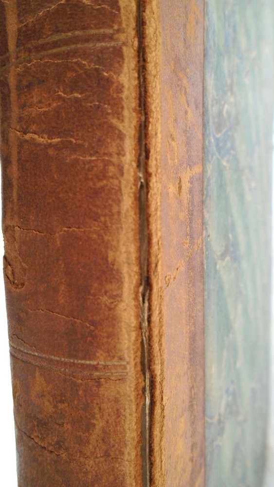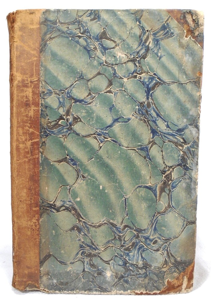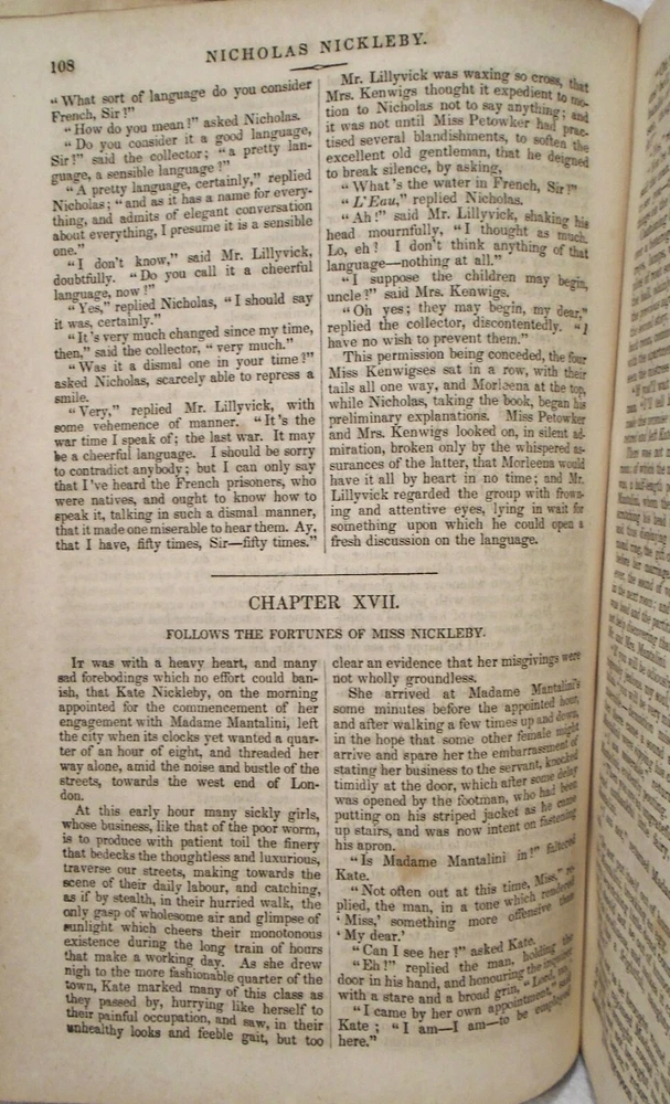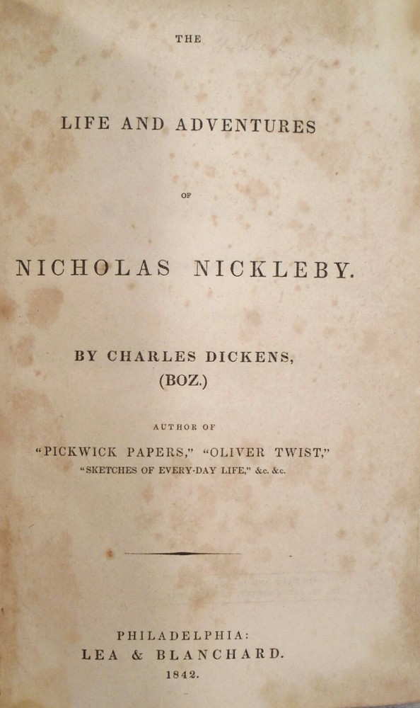 "The Life and Adventures of Nicholas Nickleby" by Charles Dickens. Three quarter leather over marbled boards. Gilt stamping to spine. With bookplate of "Wm. Spotten & Co. Successors to Dunbar Dickson & Co." to front pastedown. Pencil signature of previous owner to first free endpaper. Fading to spine. Heavy rubbing to spine tail with erosion to leather and some erosion to binding. Rubbing to spine head. Cracking to front hinge but attached by binding strings. Rubbing to all four corners will erosion to leather of front corners. Some soiling and fading to front and rear covers with wear to leather. Heavy foxing to endpapers, moderate foxing throughout text block. Good.