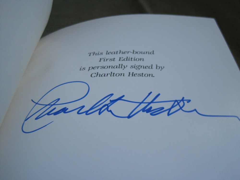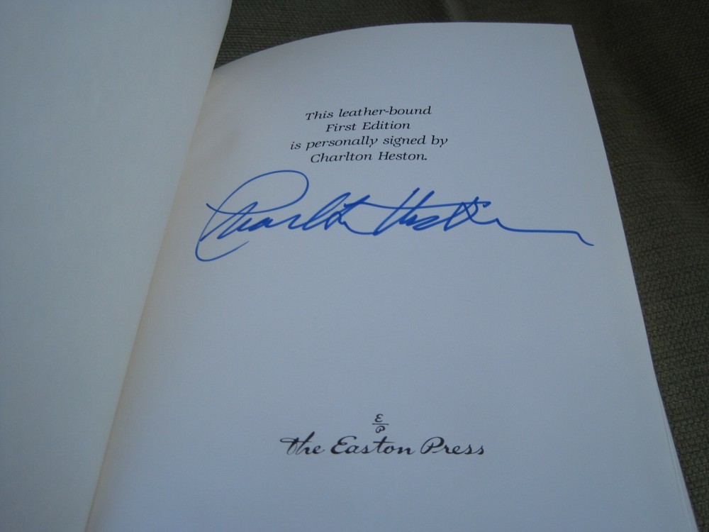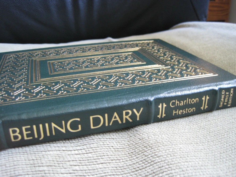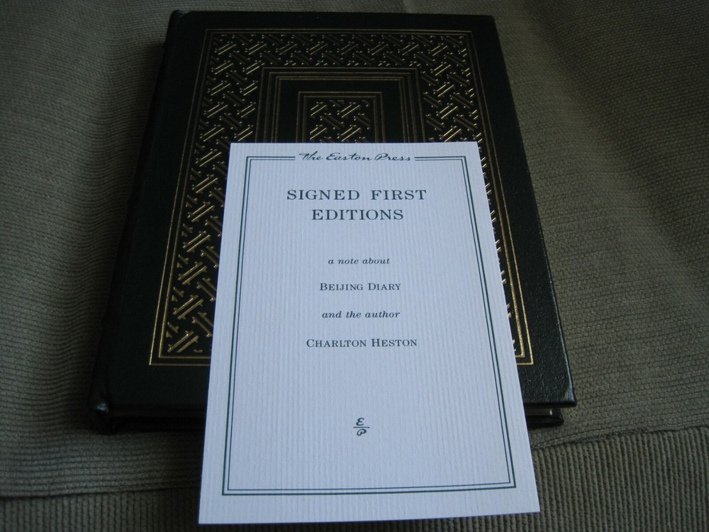 This is a leather bound signed first edition of Charlton Heston's best-seller - "Beijing Diary", the fascinating story of a remarkable cultural exchange that took the famous Hollywood star and Academy Award winning actor to Beijing, China. The book is unread and in excellent condition. Signed by the late Hollywood star on the limitation page, it also includes the publisher's note card. Easton Press books are the golden standard in the publishing industry, highly collectible and lasting generations. Easton Press Full Genuine Leather Dubbed Spine Accented Wit 22 kt. Real Gold Satin Ribbon Page Marker Distinctive Cover Design Gilded Page Edges To Protect Against Humidity High Quality Acid - Free paper Smyth-Sewn Pages Silk-Moire Endleaves I combine multiple items for savings on shipping charges. I ship worldwide. Please ask about international shipping charges and/or different shipping options. Please check out my other auctions for several rare signed books for sale. Thank you!