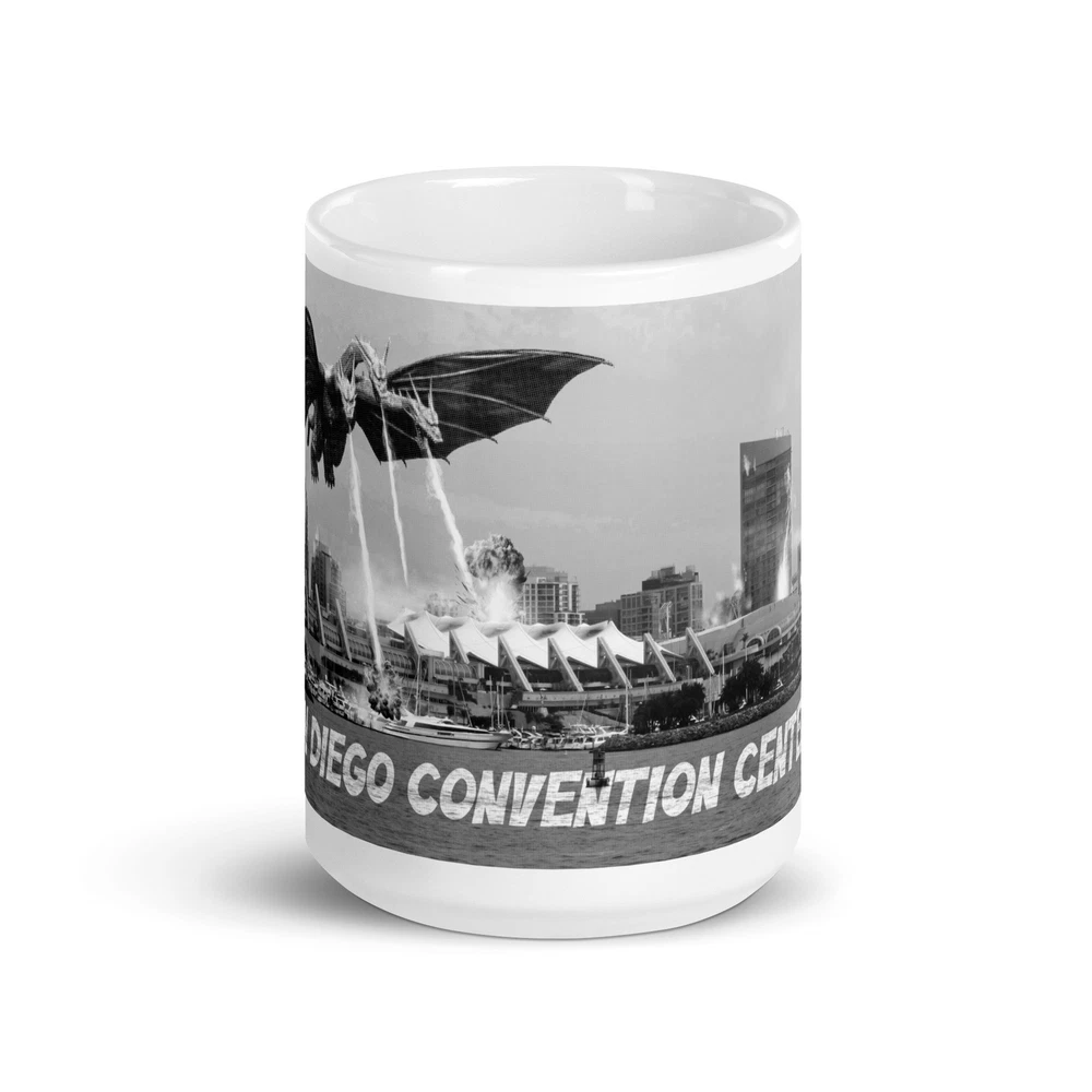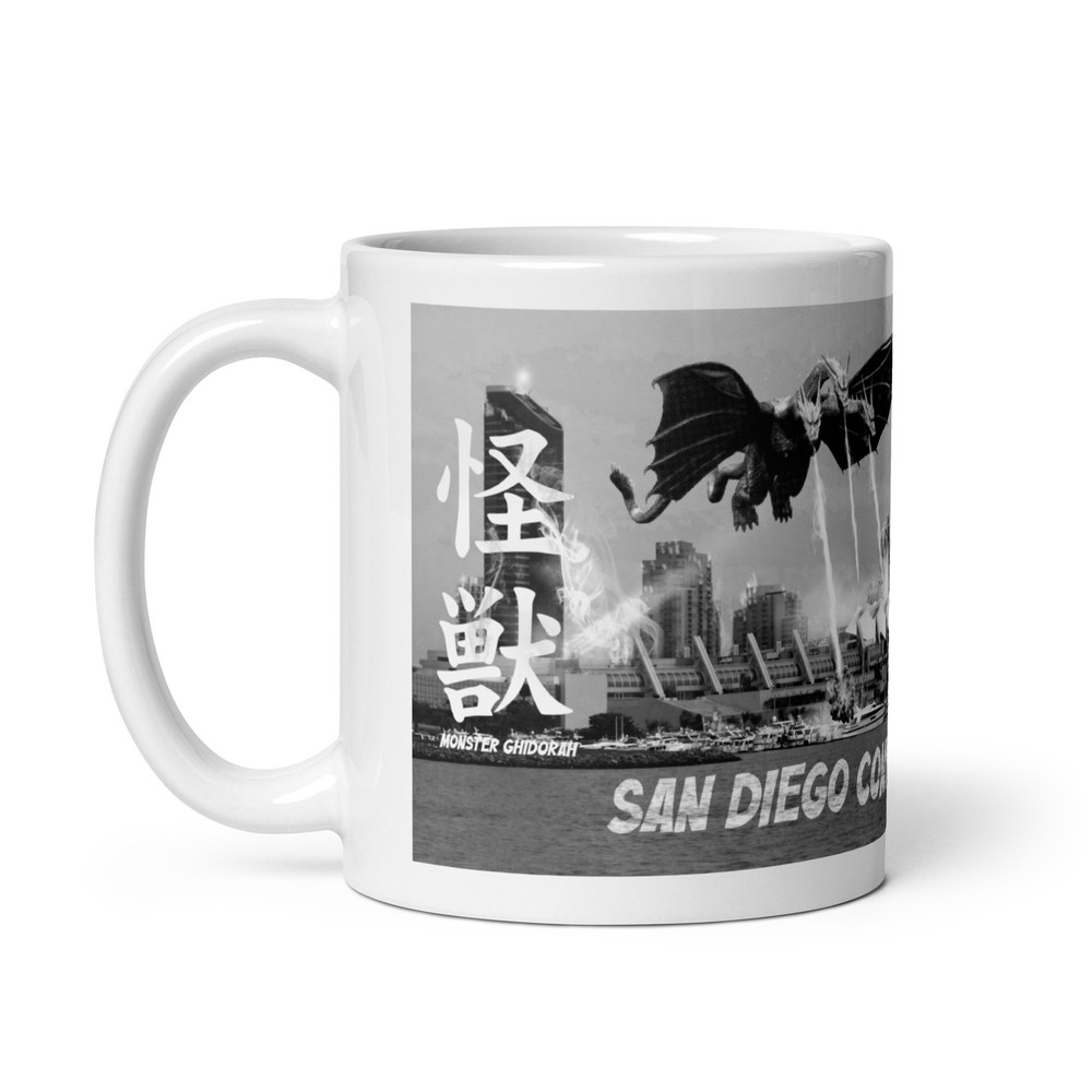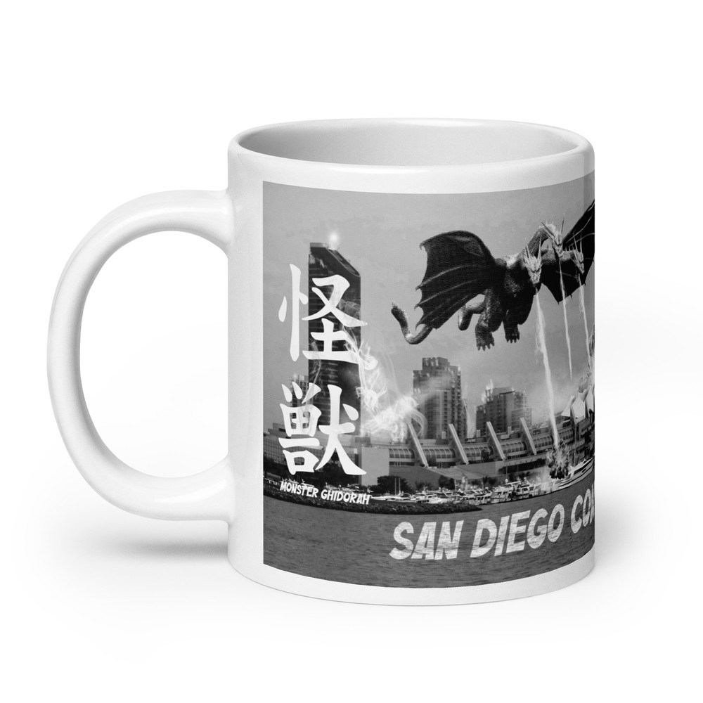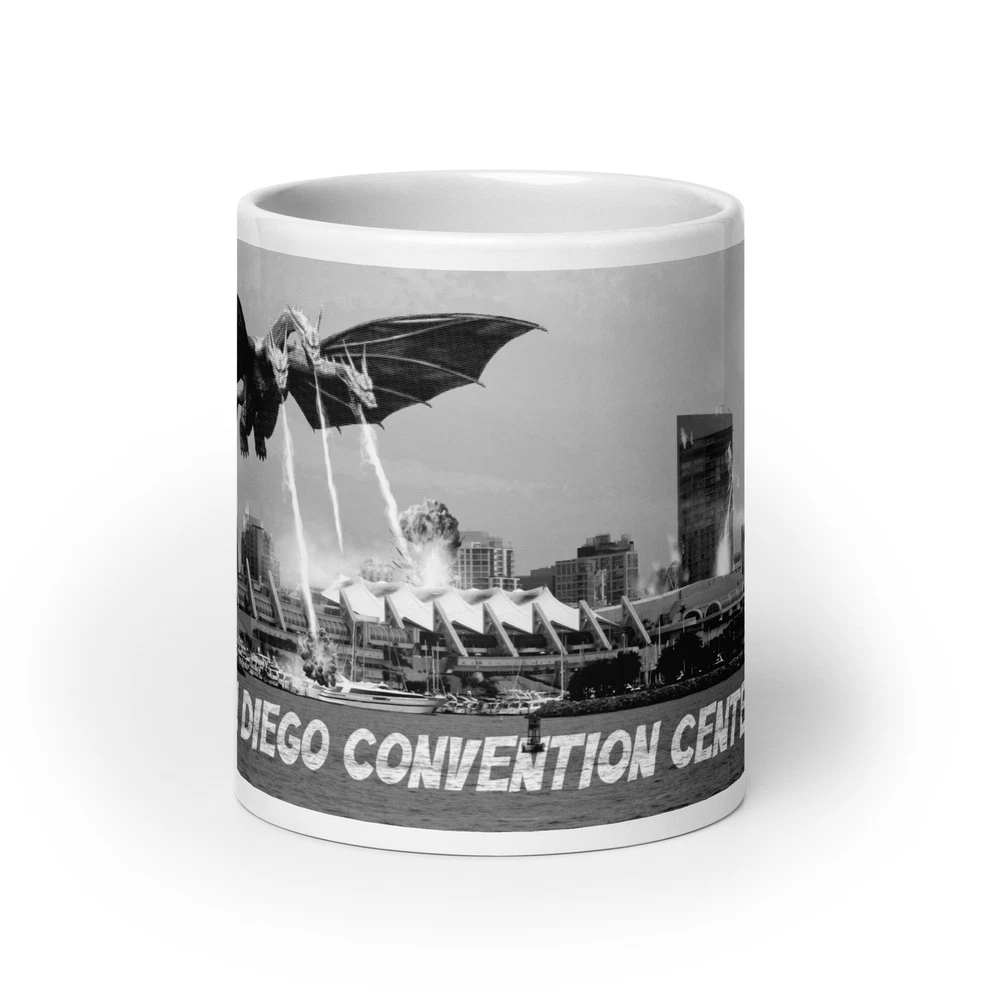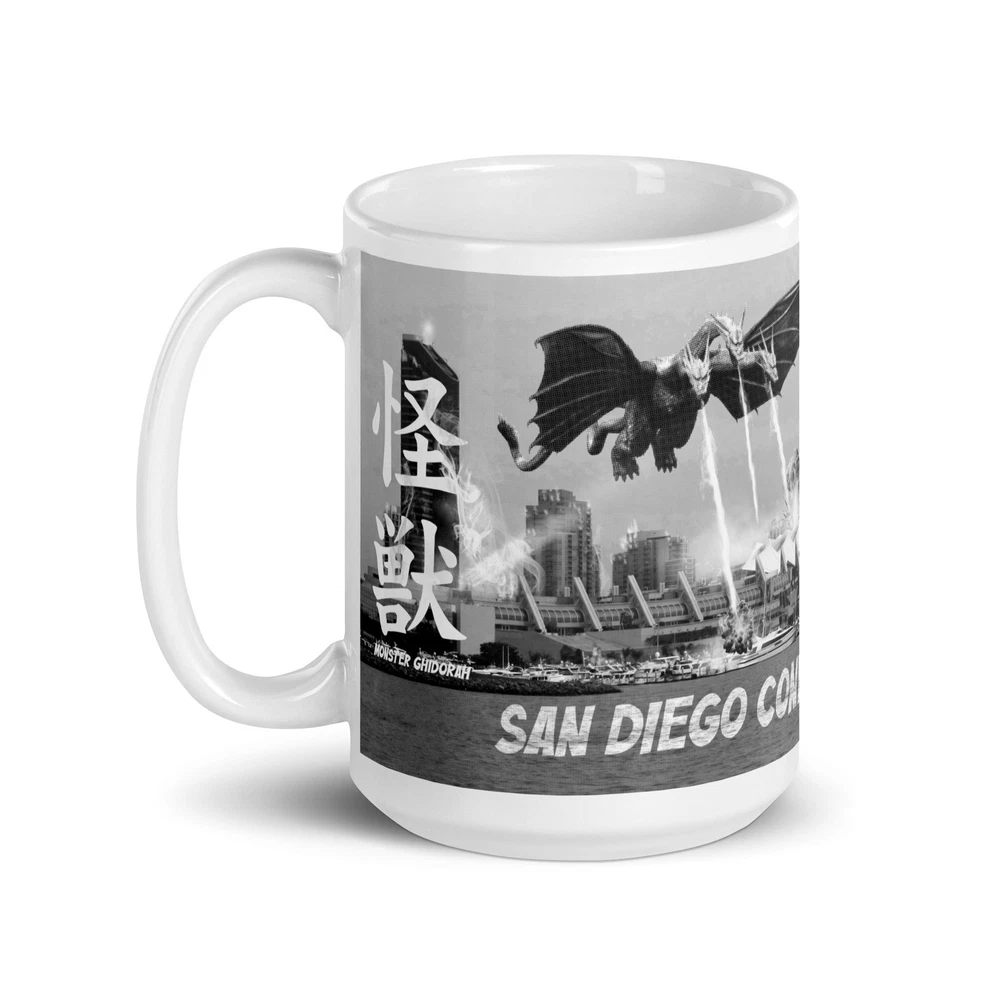 Ghidorah attack the San Diego Convention Center. Original photo composite and design. COFFEE CUP Ghidorah attacks San Diego Convention Center SDCC. Whether you're drinking your morning coffee, evening tea, or something in between—this mug's for you! It's sturdy and glossy with a vivid print that'll withstand the microwave and dishwasher. Kaiju is a Japanese word translates to Monster or strange creature in english. Ghidorah is Godzillas arch enemy. Some will say King Kong its close. Relax with your drink it will be impossible not to hear this cup.Coming soon will be the complete Kaiju universe. • Ceramic • 11 oz mug dimensions: 3.8″ (9.6 cm) in height, 3.2″ (8.2 cm) in diameter • 15 oz mug dimensions: 4.7″ (11.9 cm) in height, 3.3″ (8.5 cm) in diameter • 20 oz mug dimensions: 4.3″ (10.9 cm) in height, 3.7″ (9.3 cm) in diameter • Lead and BPA-free material • Dishwasher and microwave safe This product is made especially for you as soon as you place an order, which is why it takes us a bit longer to deliver it to you. Making products on demand instead of in bulk helps reduce overproduction, so thank you for making thoughtful purchasing decisions!