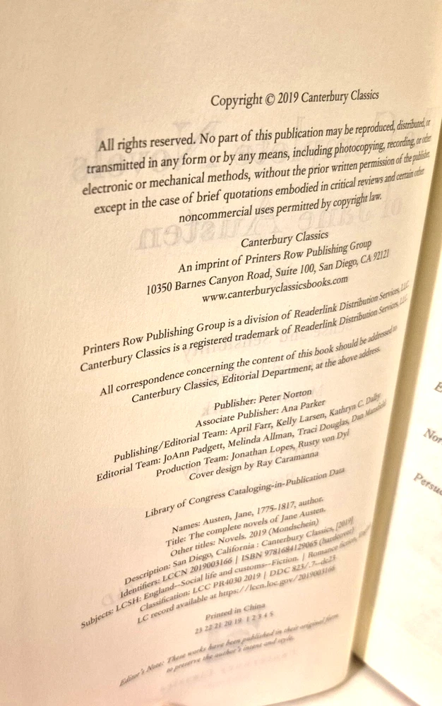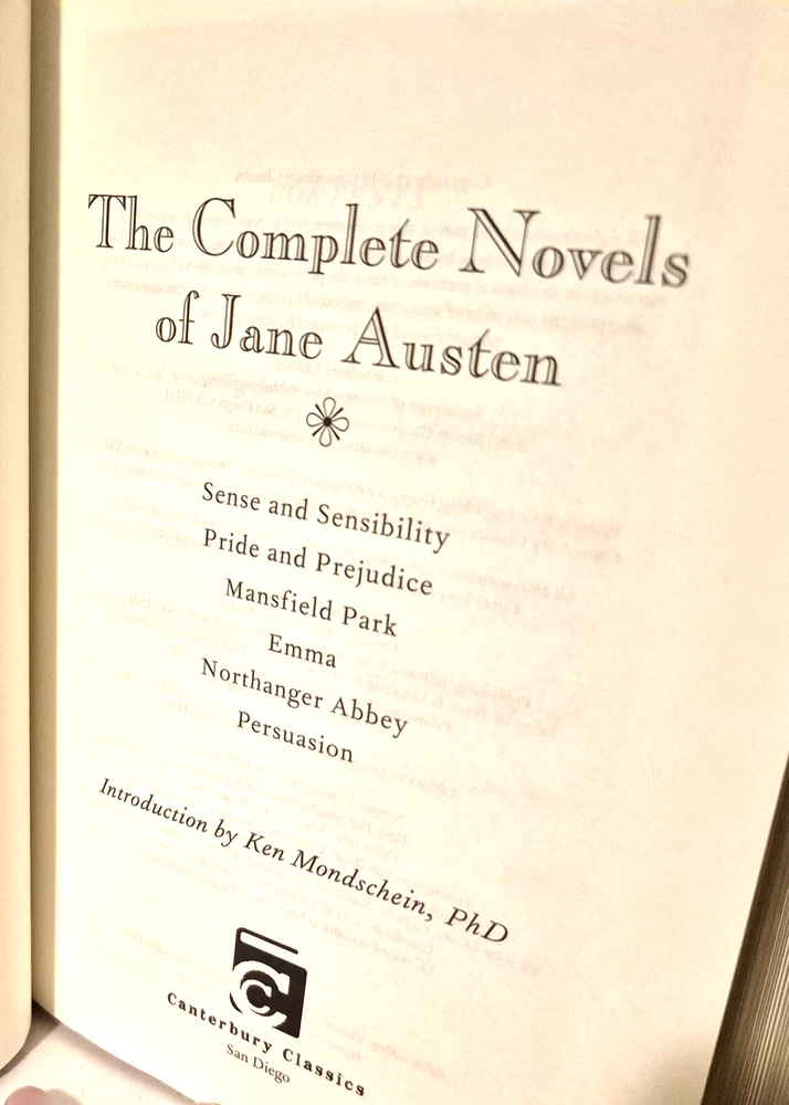 THE COMPLETE WORKS OF JANE AUSTEN ***************** THE COMPLETE WORKS OF JANE AUSTIN .... Published by Canterbury Classics in 2019... …… Includes PRIDE AND PREJUDICE, EMMA, PERSUASION, SENSE AND SENSABILITY, MANSFIELD PARK, LADY SUSAN and NORTHANGER ABBY .... DESCRIPTION - The b ook is bound in with full genuwine bonded leather, with gold letterin' on spine and cover ....... The pages are tipped in gold - - - and it has ribbon page marker....It mearuses 9 1/4 high, and 6 inches across front.......Mercy ...!!! ..... CONDITION - The ol' gal is in overall very good condition ....... The pages are good, with some scratches and dents on the edges….....The cover is solid, with some wear and use, with the cover corners bumped......And the book has a lean to it, which goes away when it is placed on the shelf with other books........This is a good, solid used book - great for display and readin'......... I think you will be pleased with it ... PAYMENT AND SHIPPIN ' - 'Course the thrilled winner is gonna hafta pay $6.95 for postage and handlin'........Multiple purchases save on shippin' ... ...Now while you're here, why don't you give my other auctions a look-see...Why, I 'spect I got a wagon load of mighty good books over yonder in my Book Barn... Thanks a heap....!!! - - - ol' arkee