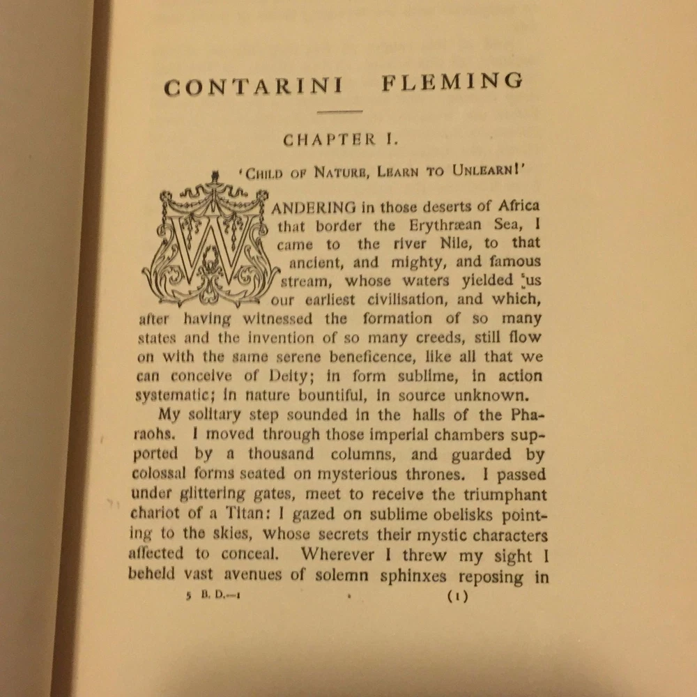 Up for sale is a gorgeous leather antique book by Benjamin Disraeli Earl of Beaconsfield. CONTARINI FLEMING The Works of Benjamin Disraeli Volume I. Published by M. Walter Dunne NY/London. 375 pages. Beautiful Saint Dunstan Binding (stated on spine), distributed only to subscribers. Gilt upper edges, uncut page ends, navy colored ribbon bookmark. Bright blue, light brown and gilt elaborate decoration to front cover, gilt title to spine. Dark brown back cover. Minor tears along spine edges, corners worn moderately. Frontis by Frederick Morgan with tissue protector. No markings on end papers or within textblock. A beautiful very collectible antique book! <a href="http://www.macromedia.com/shockwave/download/index.cgi?P1_Prod_Version=ShockwaveFlash"> To view the showcase you need Flash 6 or higher. Click here to Install it now.</a><br>--or--<br> <a href="http://stores.sellersourcebook.com/redbird18a">View Other Listings for redbird18a</a>