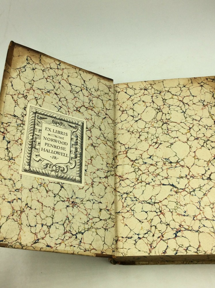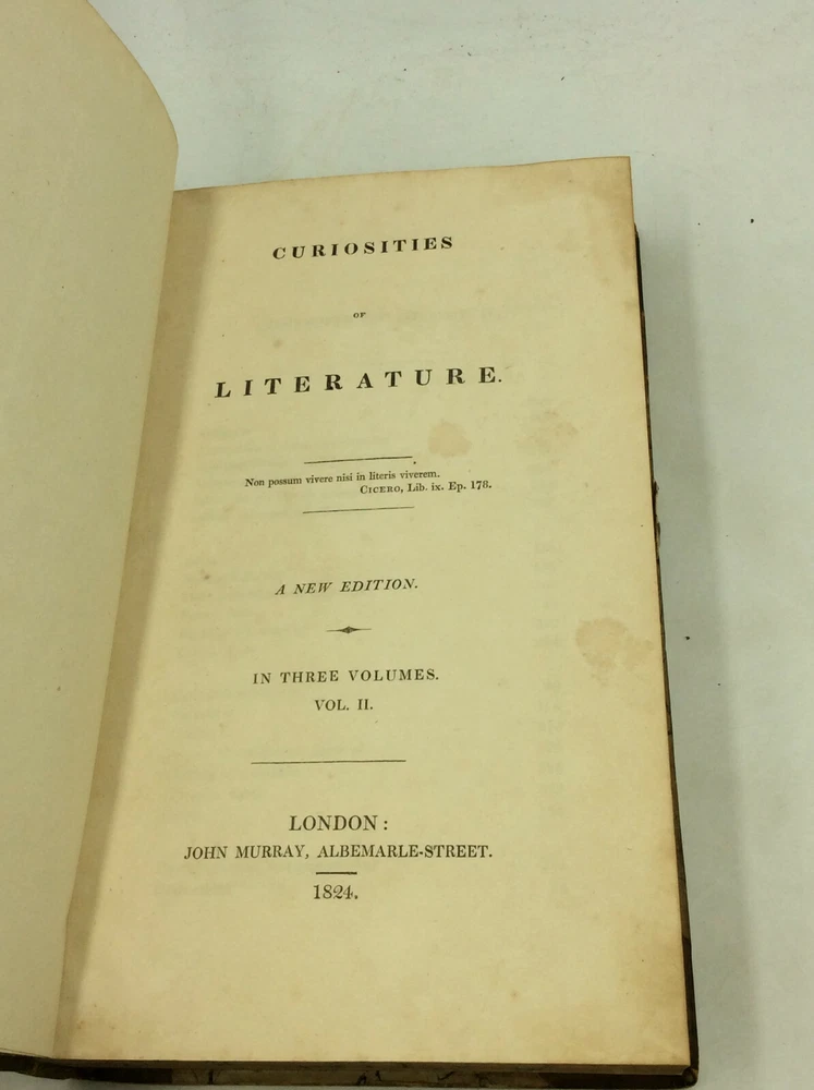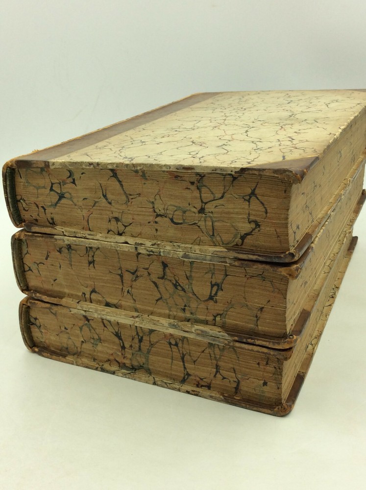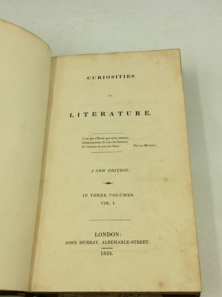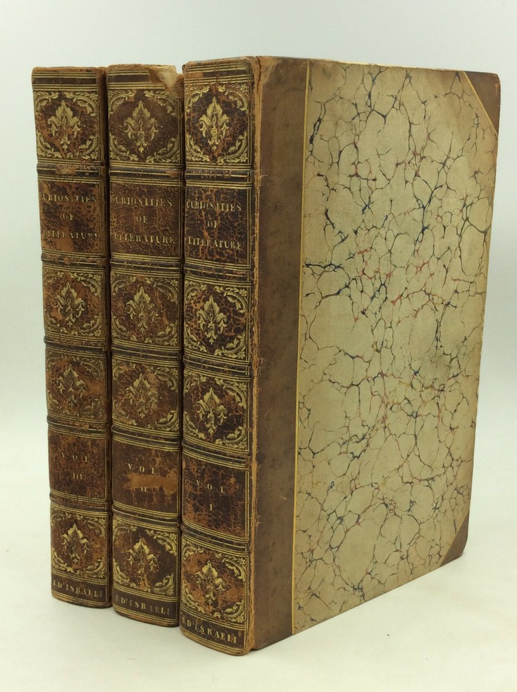 [Isaac D'Israeili] CURIOSITIES OF LITERATURE, Volumes I-III London: John Murray, 1824. Leather. 3 vols. 512p; 511p; 472p. A set of three hardcover books bound with golden-brown leather spines and corners. The boards, endpapers, and foredges are all marbled. The spines and edges are scuffed, marring the gilt decorations on the spines and making the lettering a bit difficult to read. Small chip off the head of volume II's spine. Pages mildly age-toned and faintly foxed. Otherwise, text unmarked and binding secure across the set. Item #176999 Each volume contains the bookplate of Norwood Penrose Holloway, Jr., of Massachusetts. Volume II contains a foldout facsimile of Pope's manuscript of Homer; this foldout has a small closed tear and some mild foxing.