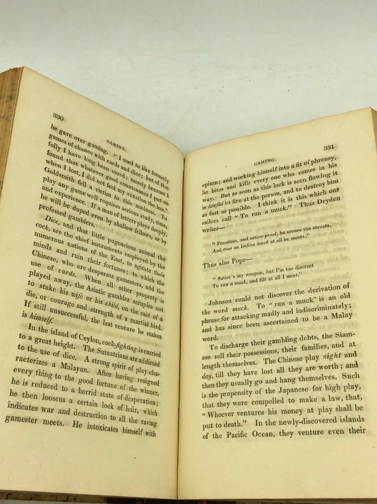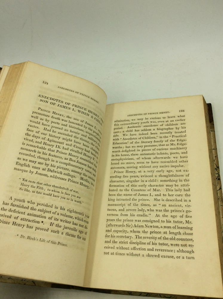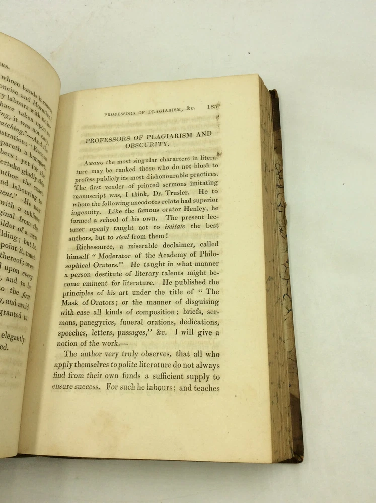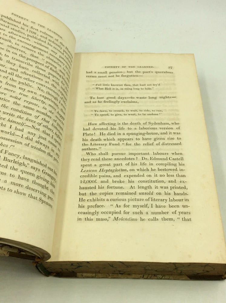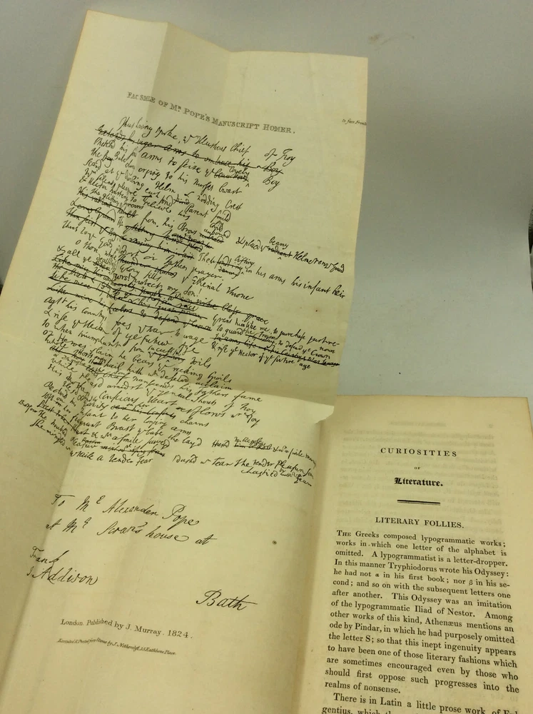[Isaac D'Israeili] CURIOSITIES OF LITERATURE, Volumes I-III London: John Murray, 1824. Leather. 3 vols. 512p; 511p; 472p. A set of three hardcover books bound with golden-brown leather spines and corners. The boards, endpapers, and foredges are all marbled. The spines and edges are scuffed, marring the gilt decorations on the spines and making the lettering a bit difficult to read. Small chip off the head of volume II's spine. Pages mildly age-toned and faintly foxed. Otherwise, text unmarked and binding secure across the set. Item #176999 Each volume contains the bookplate of Norwood Penrose Holloway, Jr., of Massachusetts. Volume II contains a foldout facsimile of Pope's manuscript of Homer; this foldout has a small closed tear and some mild foxing.