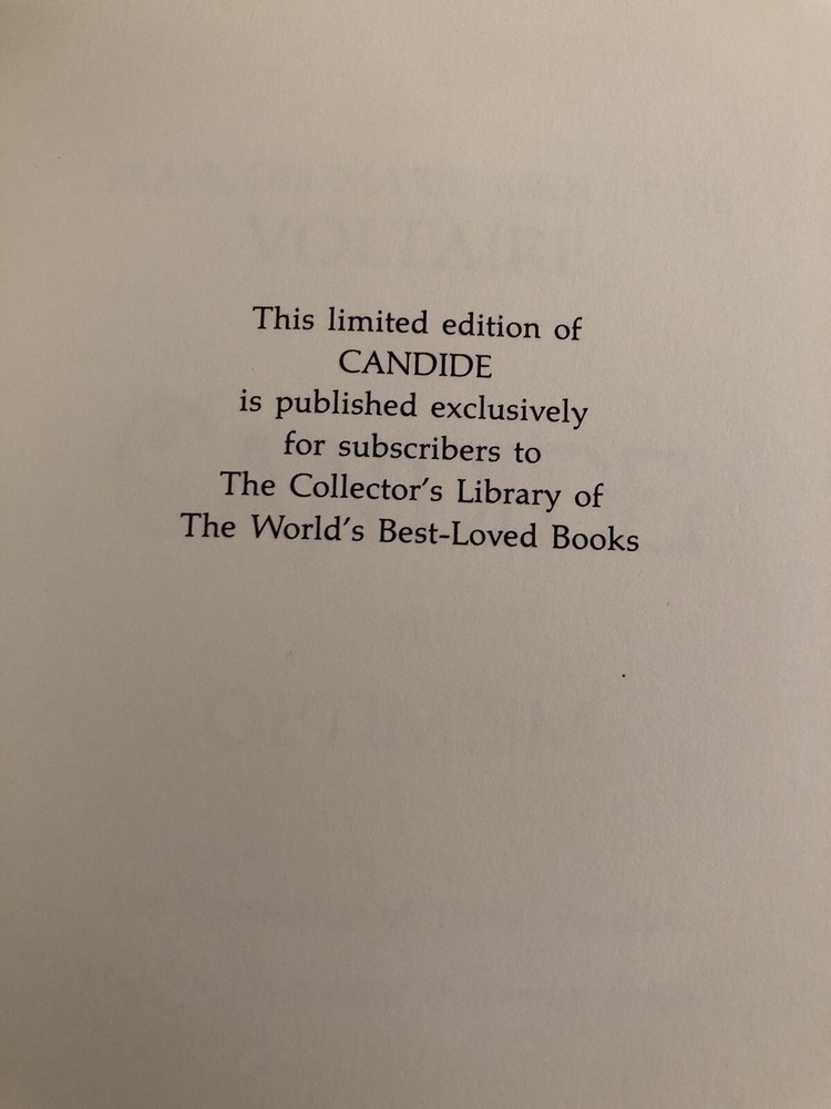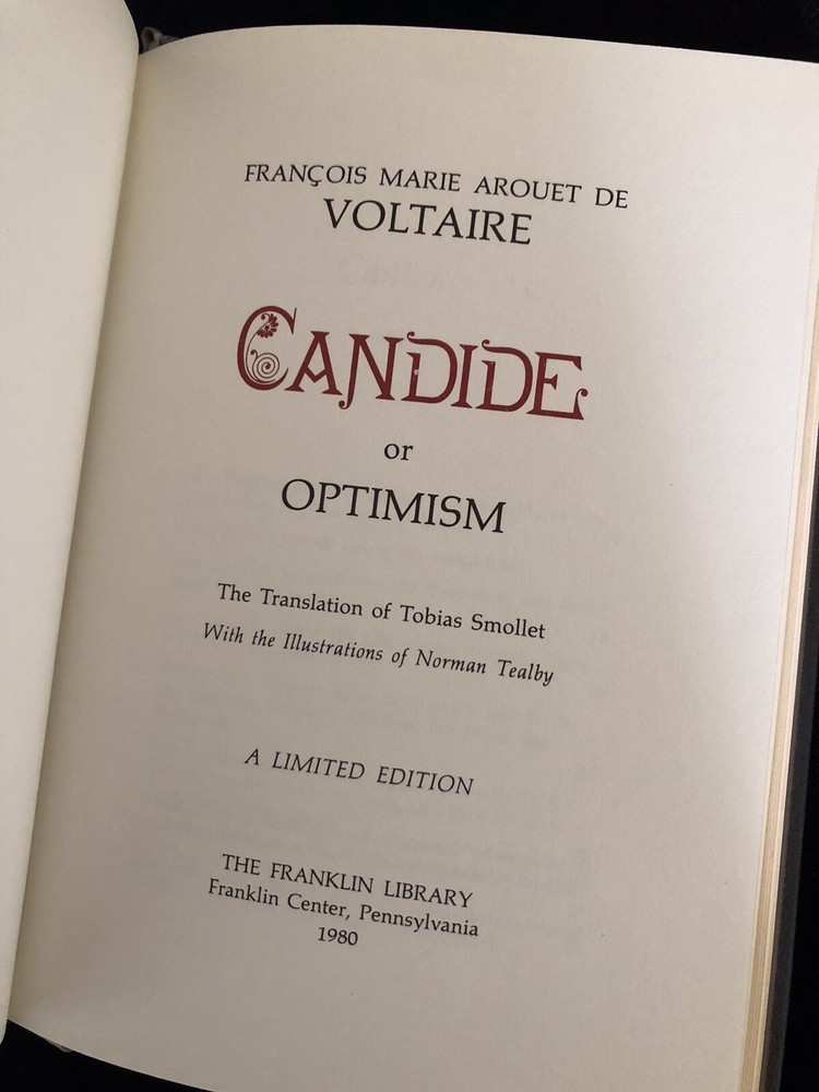 Candide, or, Optimism, by François Marie Arouet de Voltaire (Franklin Center, Pennsylvania: The Franklin Library, 1980) This is an as new limited edition from The Franklin Library series The Collector's Library of the World's Best-Loved Books. Leather binding with gilt decoration. Silk moiré endpapers. Gilt page edges all around. Unread and in pristine condition with no marks or bookplate.