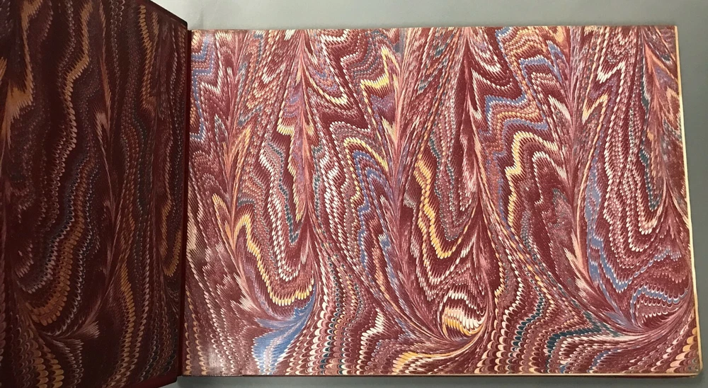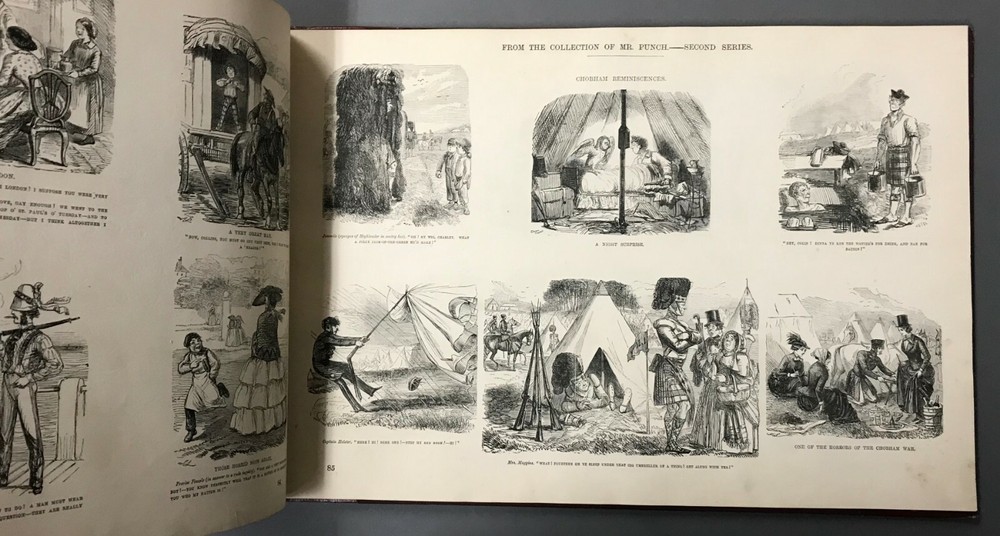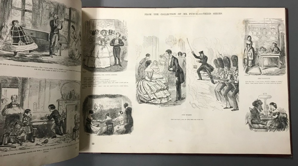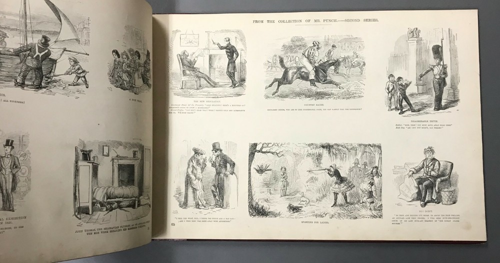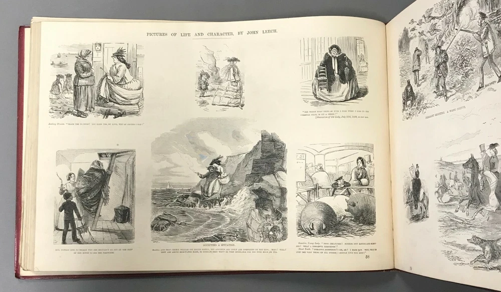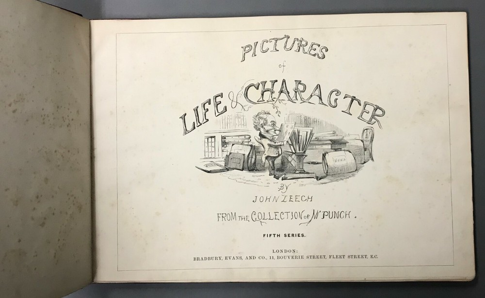 [Caricature] John Leech Pictures of Life & Character (Fifth Series) c.1870 John Leech. Pictures of Life & Character by John Leech: from the Collection of Mr. Punch (Fifth Series.) London: Bradbury Evans and Co., no date, circa 1870. No stated edition. Oblong folio. Mixed pagination. Index. Contemporary half leather over pebbled cloth boards, spine and front cover in gilt, top edge gilt, marbled endpapers. Rubbed and edgeworn, scattered foxing, some torn pages. Still, very good. JJA-00133A