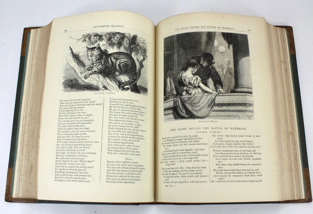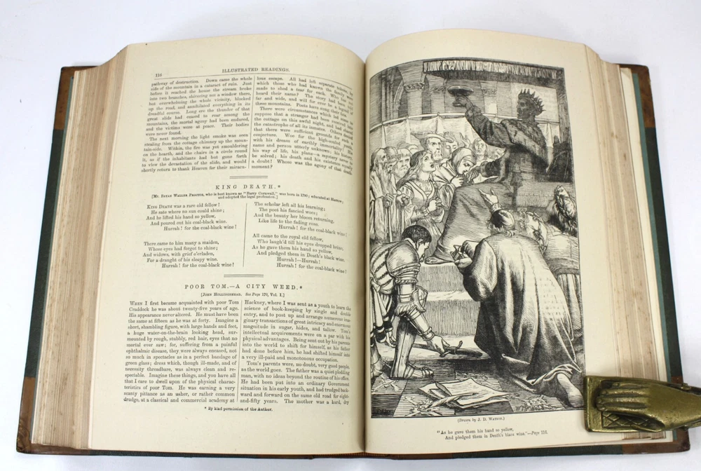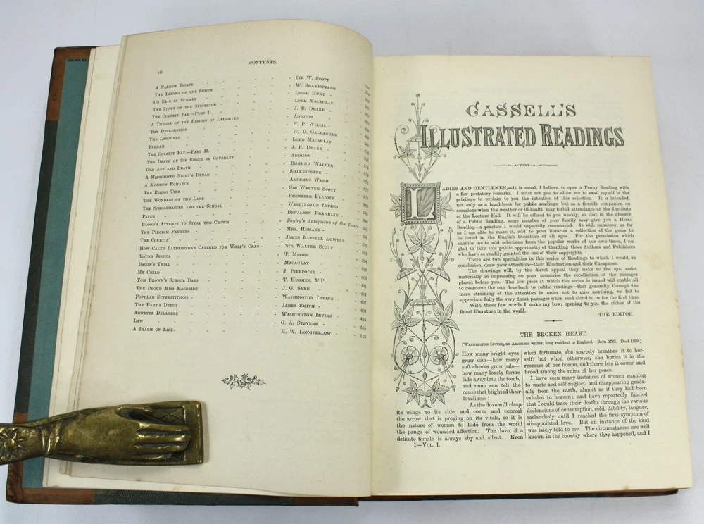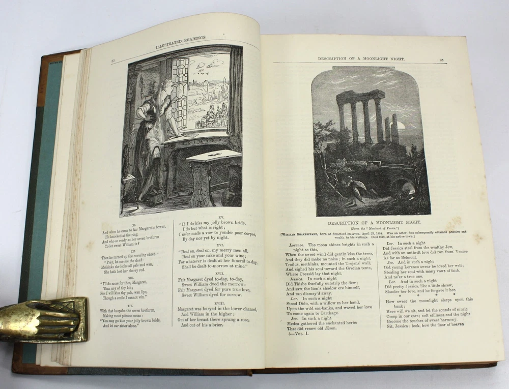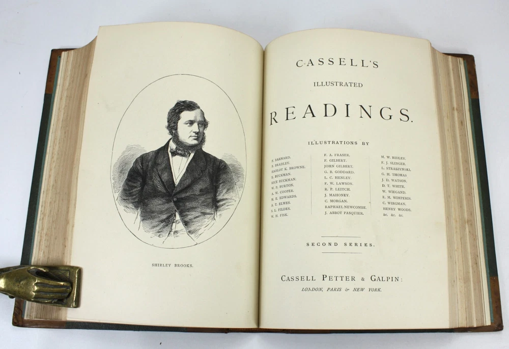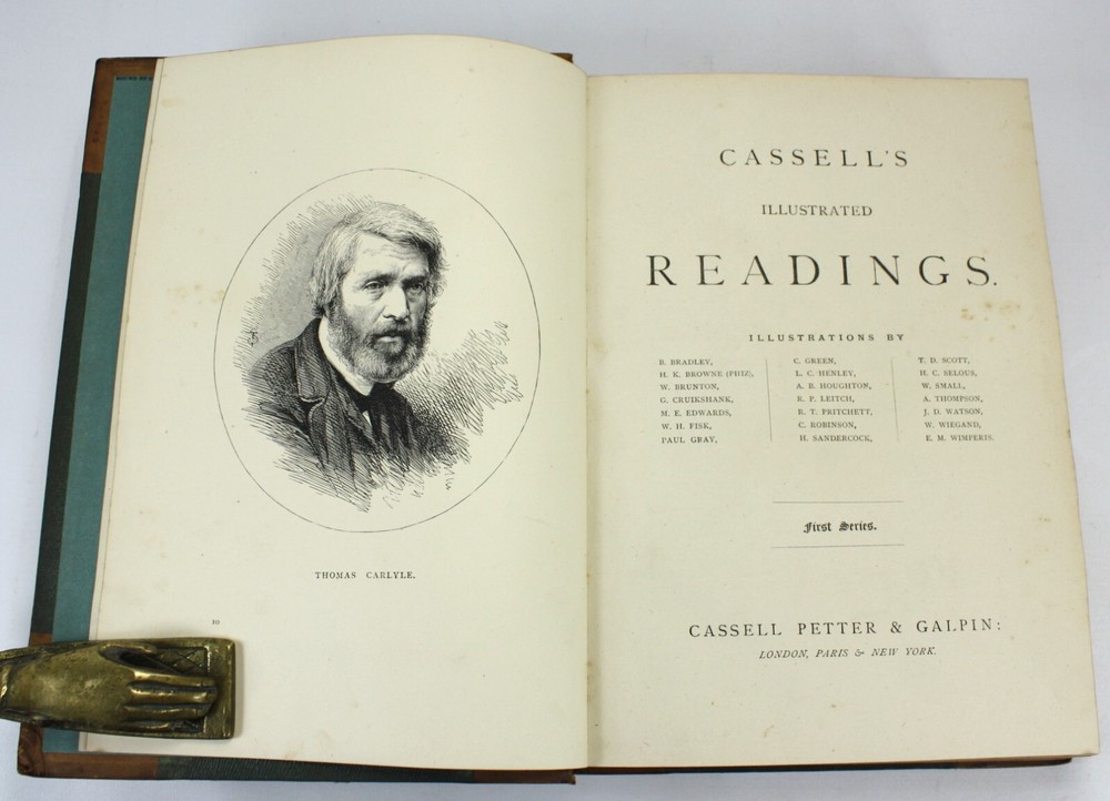 Cassell's Illustrated Readings, First and Second Series bound as one. An illustrated compendium of 'Penny Readings' to be read and shared with the family or a wider audience. Such writings would presumably have been originally published as smaller, regular issues, sold for a Penny. Contains the writings of popular literary figures of the day, including fiction and poetry. Authors include, Washington Irving, Benjamin Franklin, Sir Walter Scott, William Shakespeare, Leigh Hunt, Byron, Longfellow, Swift and Defoe, amongst many others. Copiously illustrated. Published by Cassell, Petter & Galpin, London, Paris & New York. Undated, but from appearances, c. 1870. A very good hardback volume with brown leather spine and corners with raised bands, and tooled gilt design and black morocco title label. Buckram cloth over boards. Leather is scuffed and bumped, and boards lightly worn with a few marks. Binders ink stamp to first pastedown. Some age spotting to first few pages, but text otherwise bright, clean and soundly bound. An attractive volume with its copious illustrations. Text in English. viii + 416pp + vii + 384pp + Plates. Dimensions: Approximately: 273mm x 203mm x 51mm. Substantial - weighs approximate 2.13kg unpacked.