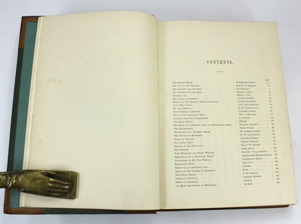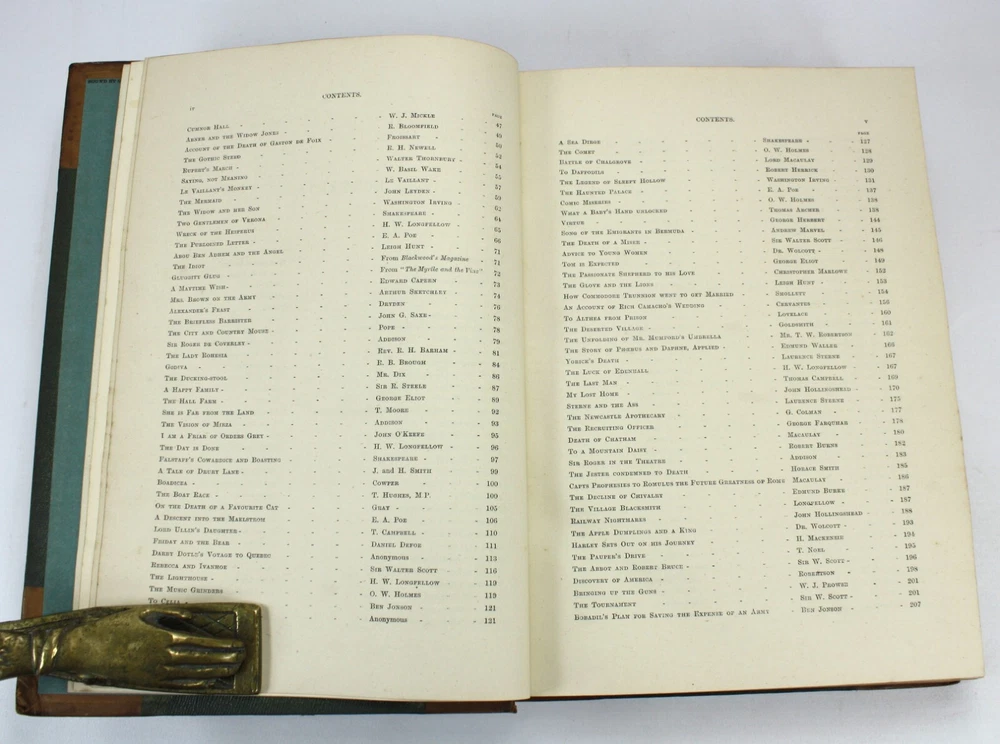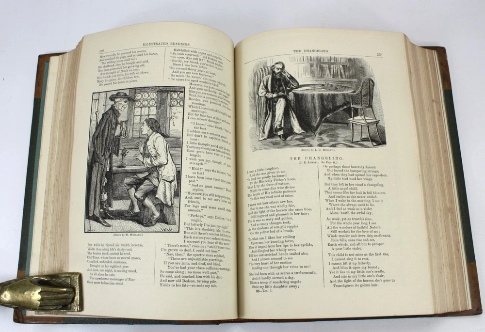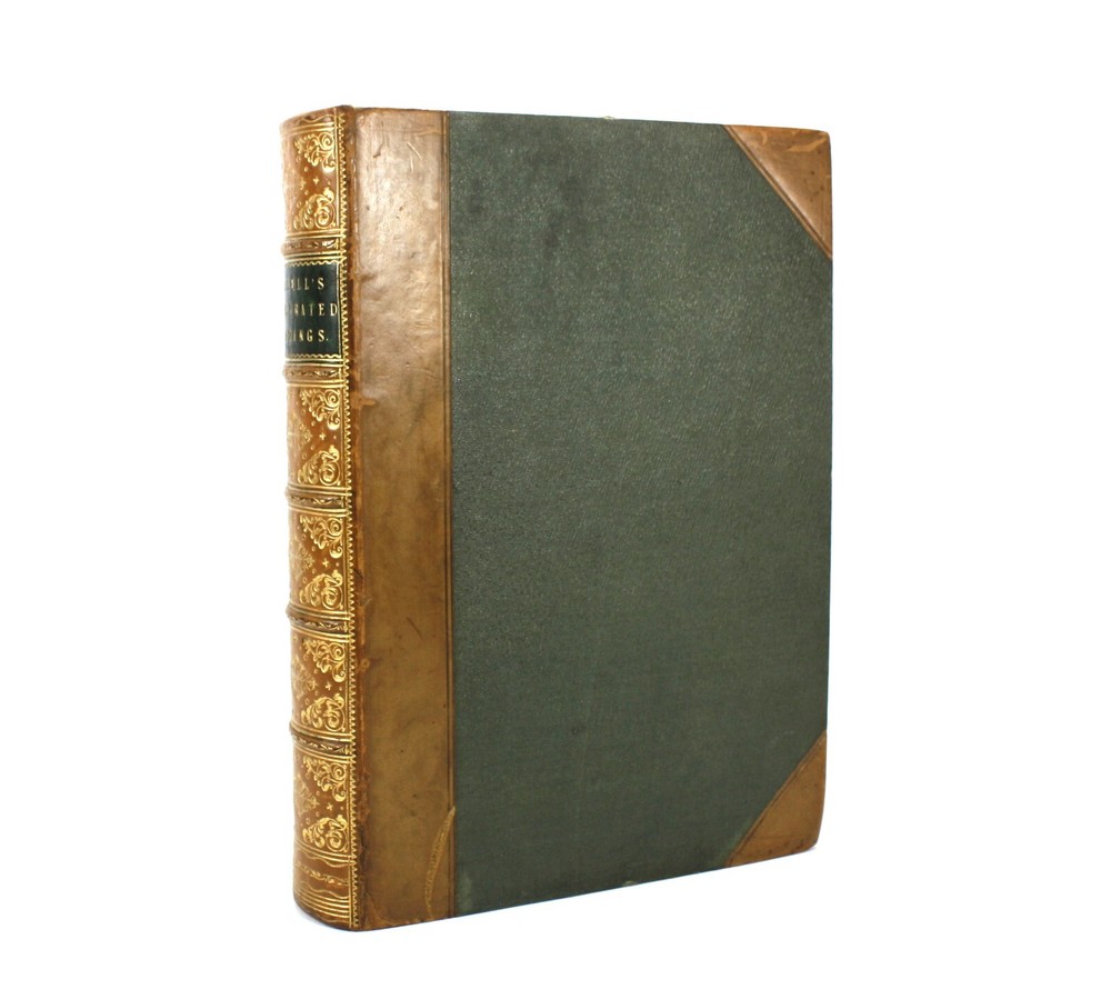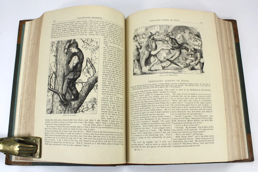 Cassell's Illustrated Readings, First and Second Series bound as one. An illustrated compendium of 'Penny Readings' to be read and shared with the family or a wider audience. Such writings would presumably have been originally published as smaller, regular issues, sold for a Penny. Contains the writings of popular literary figures of the day, including fiction and poetry. Authors include, Washington Irving, Benjamin Franklin, Sir Walter Scott, William Shakespeare, Leigh Hunt, Byron, Longfellow, Swift and Defoe, amongst many others. Copiously illustrated. Published by Cassell, Petter & Galpin, London, Paris & New York. Undated, but from appearances, c. 1870. A very good hardback volume with brown leather spine and corners with raised bands, and tooled gilt design and black morocco title label. Buckram cloth over boards. Leather is scuffed and bumped, and boards lightly worn with a few marks. Binders ink stamp to first pastedown. Some age spotting to first few pages, but text otherwise bright, clean and soundly bound. An attractive volume with its copious illustrations. Text in English. viii + 416pp + vii + 384pp + Plates. Dimensions: Approximately: 273mm x 203mm x 51mm. Substantial - weighs approximate 2.13kg unpacked.