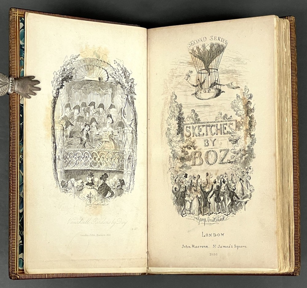 SKETCHES BY BOZ. Second Series Author: Dickens, Charles [1812 - 1870] Title: SKETCHES BY BOZ. Second Series Publication: London: John Macrone St James's Square, 1837 Edition: 1st edition, 2nd issue (Smith 2) Description: [3], ii - iii, [2], viii,377, [21] pp. Lacks half-title leaf. Msipaginations corrected. 19 page publisher catalogue, dated December 1836, follow text. 10 plates by George Cruikshank, including frontispiece & engraved title [with the required 1836 date]. List of illustrations names "Vauxhall Gardens by Day" as the final plate, vice the correct: "Mr. Minns and his Cousin." 8vo. 8" x 4-7/8". Late 19th C. / early 20th C. full brown morocco binding with gilt decorated spine & marbled eps. Minor extremity wear. Usual age-toning to paper, with a smattering of light foxing. Withal, a handsome VG+ volume. Contains the first publication of "Our Next-Door Neighbours" & "The Drunkard's Death" Seller ID: 51867 Subject: Dickens Tavistock Books, ABAA Reno, NV Established in 1989, Tavistock Books has recently moved from its former long-time Alameda CA location to Reno NV. We are a general antiquarian business, with material ranging from Aviation to Zoology, from the 16th C to the 21st. We have specialties in Dickens, History of Nursing, Children’s Serial Fiction & Western Americana. Visits may be arranged by appointment, generally 10 am to 3 pm, Pacific Time. Guarantee We guarantee everything we sell and any item may be returned for any reason within 30 days of receipt. If the return is due to an error on our part, we will reimburse you the cost of your return. Please do exercise the same care in packaging, as we do in shipping all items purchased from us. We are members of the Antiquarian Booksellers' Association of America (ABAA), and the International Online Booksellers Association (IOBA). Shipping We are happy to ship to buyers outside of the United States. Please contact us for an exact shipping quote. All books shipped to US destinations are usually sent US Post Office Media Mail, with despatch usually within 72 hours of payment receipt. Delivery typically takes a week, but may be longer, especially during the holidays. Faster shipping is available, please contact us for a price quote. We will combine shipping on items purchased at the same time. We prefer PayPal. Feedback We leave feedback for buyers once they have posted feedback for us. If you are unhappy with any aspect of a transaction with us, please contact us immediately. We work hard to keep buyers happy and to promptly resolve the rare problem that may arise. This listing was created by Bibliopolis.