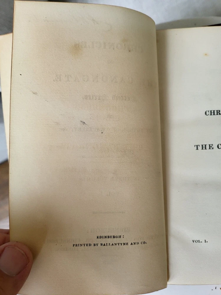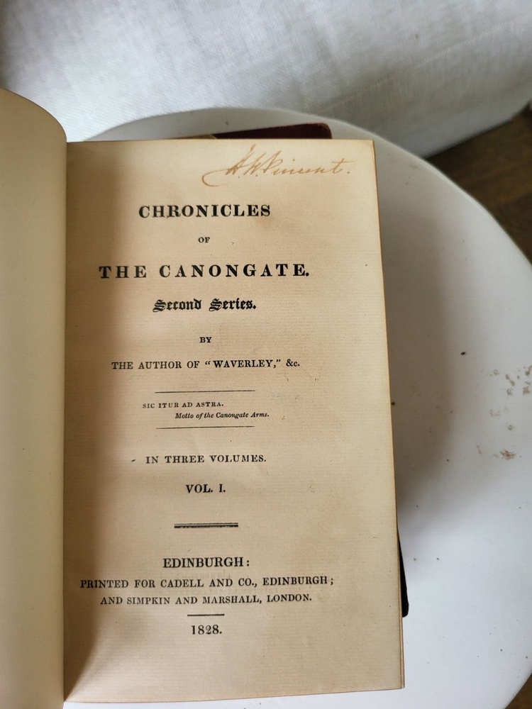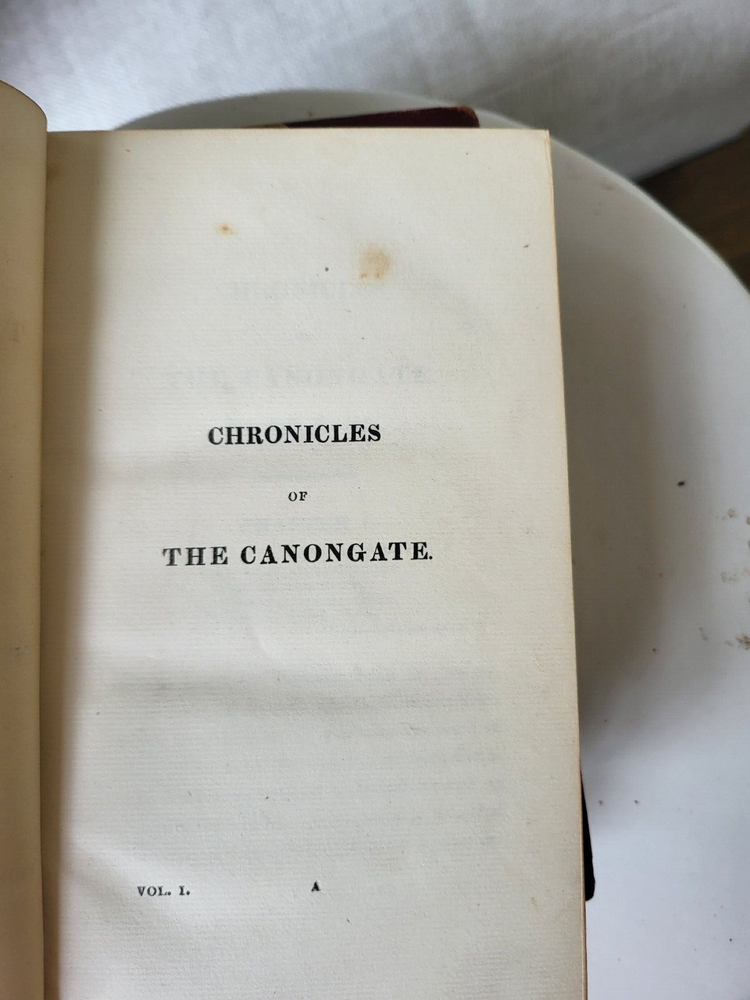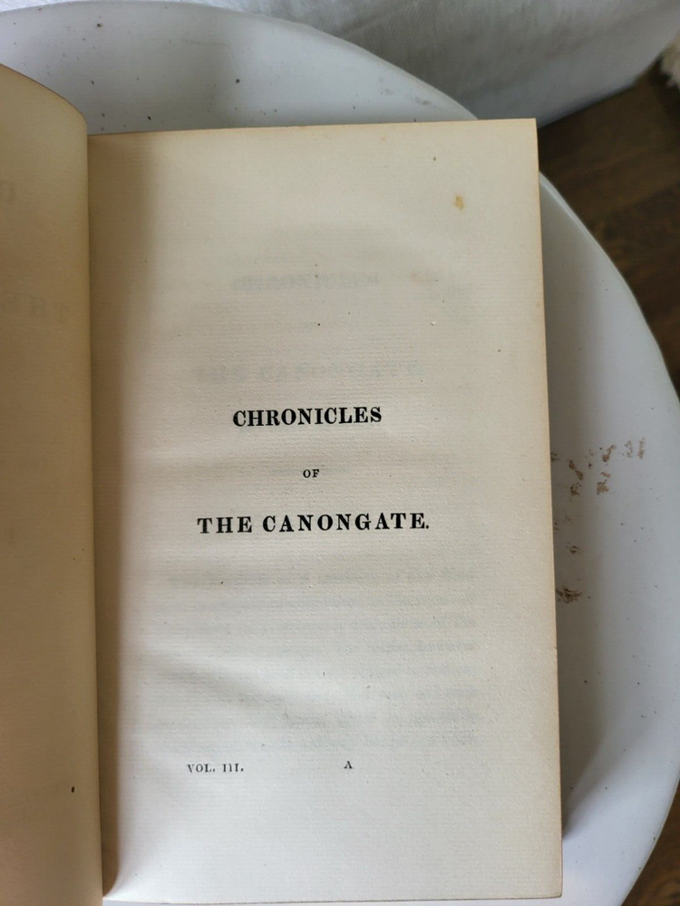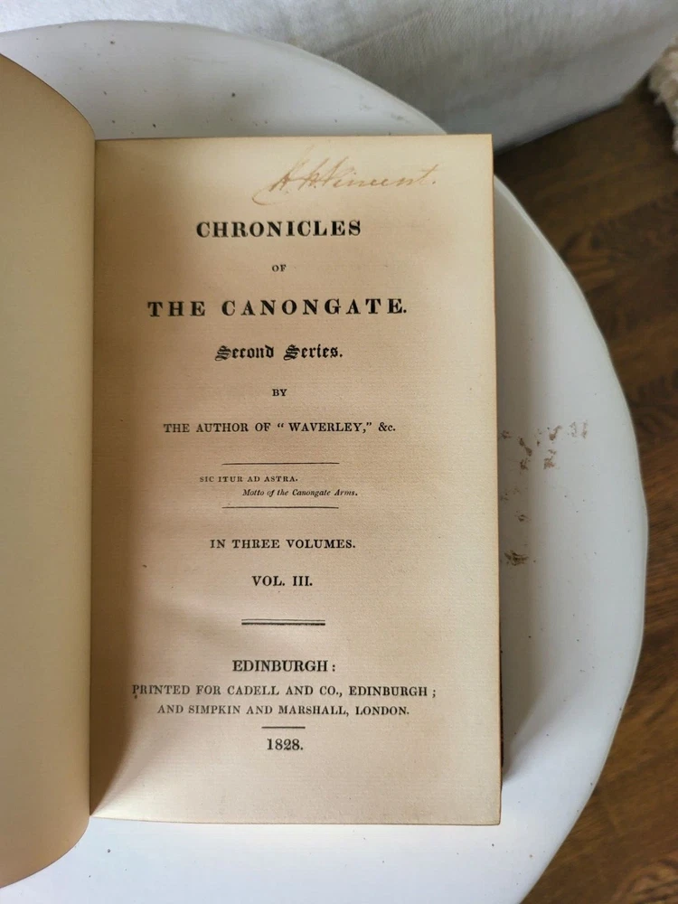 Up for sale is a first edition of Sir Walter Scott's Chronicles of the Canongate. 2nd Series. Published 1828. Three volumes. All three volumes contain half titles. Nice copy in 19th century partial leather. Gold gilt to page edges. Some small dings to boards particularly at edges. Minor wear to pages and light browning in places. Previous owner antique signature. Overall VG/VG+ This is one of sixteen different 1st editions of Scott's work we are listing. Additionally we have one listing for 20 volumes of various first edition volumes from broken / incomplete sets of his work for sale. All came from a single estate and all have matching bindings. Please email with questions and see our store for other great items.