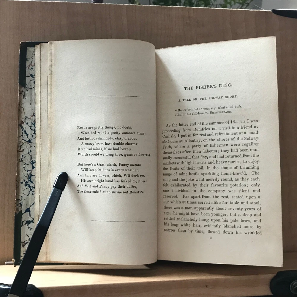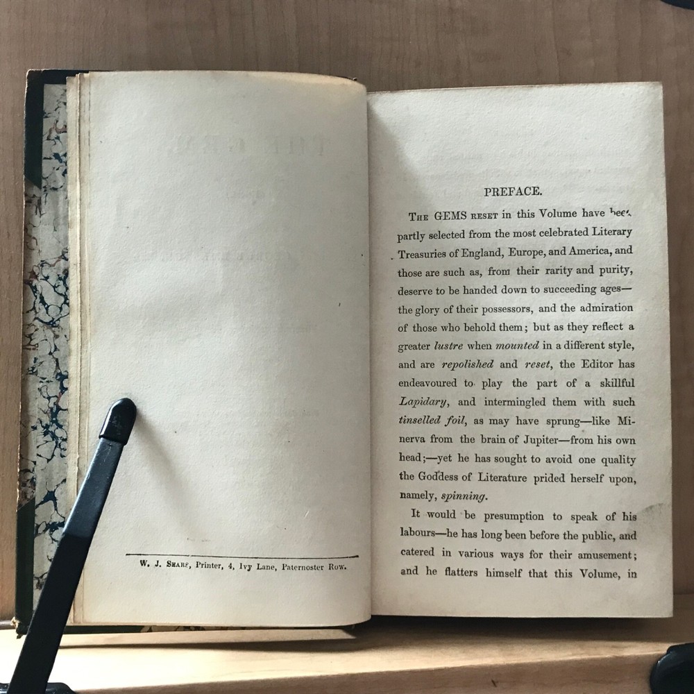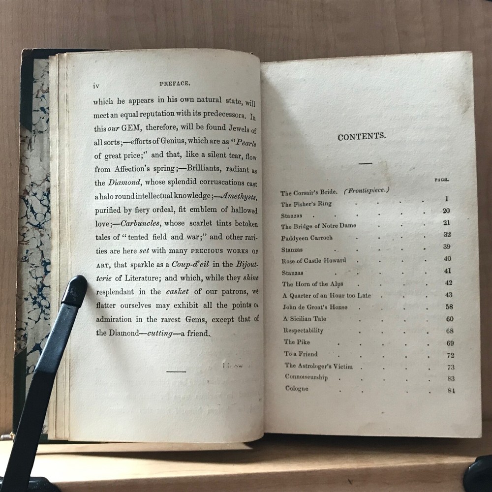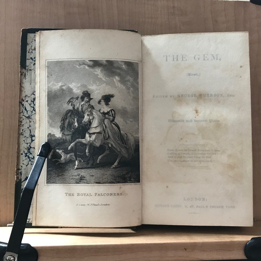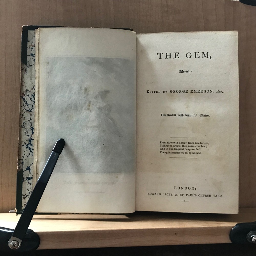 The Gem, Re-Set, Edited by George Emerson, Esq., Illustrated with Beautiful Plates, Edward Lacey, London, Circa 1840, 312 pp, later 3/4 leather, 6.5 x 4”, 12mo. In good condition. Finely bound in late Victorian binding. Light wear to extremities with minor scuffing and rubbing to corners. Hinges lightly creased. Interiors are lightly toned with scattered splotchy foxing. Free of ownership or markings. Missing plates (?), only frontis is present. Binding tight and intact. Lovely! Please see photos. COLI1840ABCN