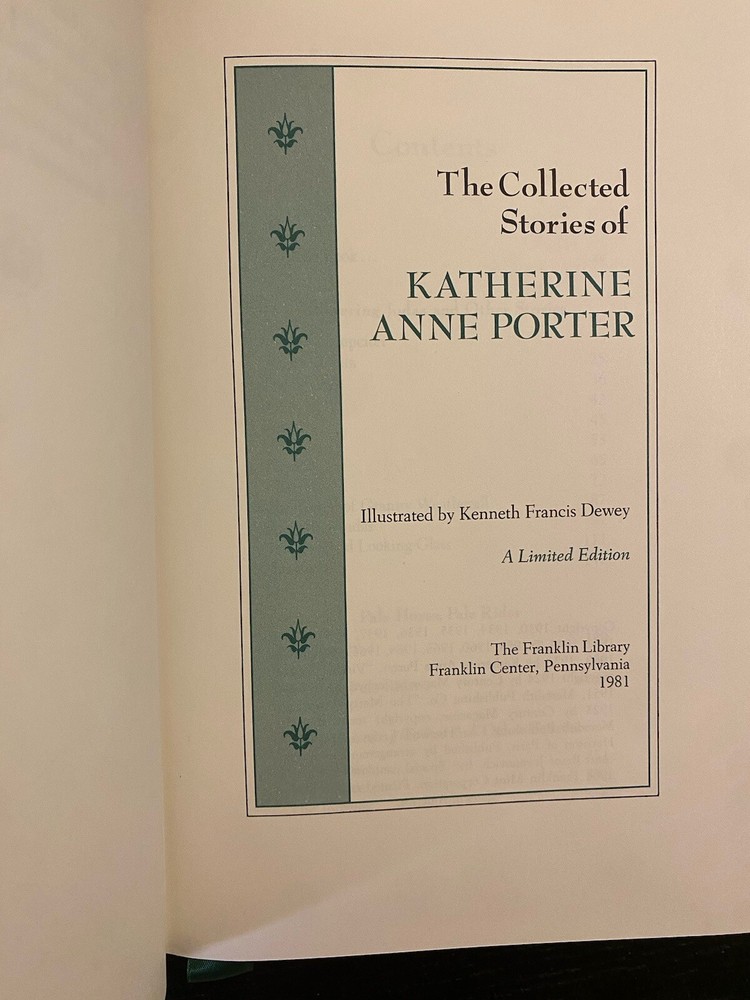 The product is "Collected Stories of Porter" by Katherine Anne Porter, published by Franklin Library in Philadelphia in 1981. It is a full leather, luxury edition collector's item featuring the author's literature and fiction works. The book is in English and illustrated by Katherine Porter, making it a special addition to any classics collection. This original edition showcases the author's character family and is a North American publication.