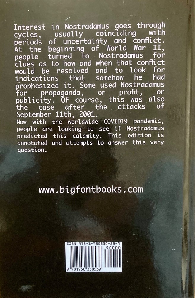 Up for sale is Complete Prophecies of NOSTRADAMUS by Michel de Nostredame. This is a hardcover book with 147 pages. Published in 2020 by Ancient Wisdom Publications with ISBN 978-1-950330-53-9. In new condition. Pages are clean. Payment will be through eBay. Shipping is free for a USPS Media Mail shipping and handling or $9.65 for a USPS Priority shipping and handling. Browsers welcome! Buyers adored! Buy it now. Good luck on reading the prophecies of Nostradamus.