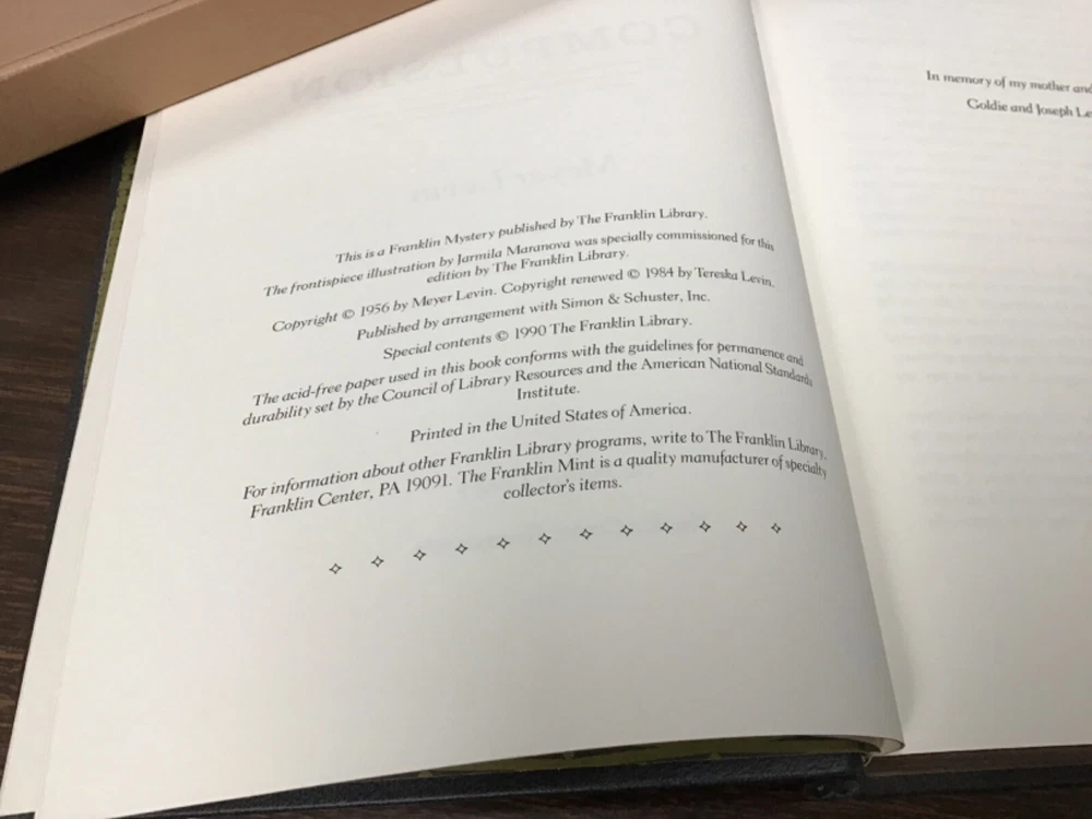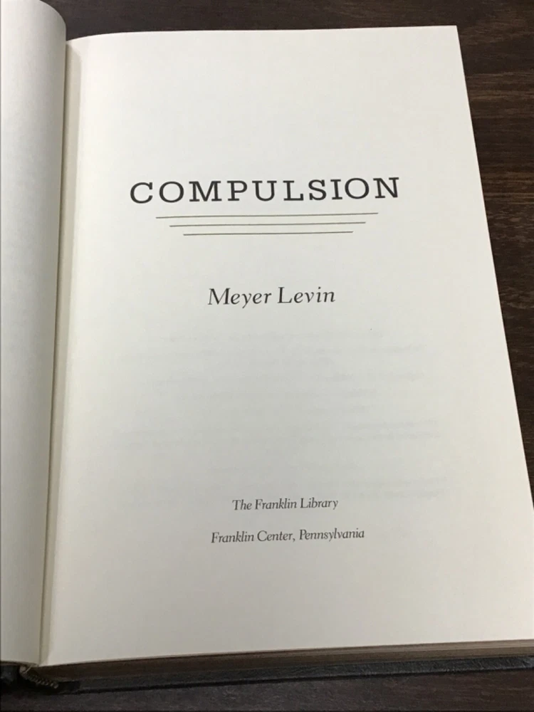 Compulsion by Meyer Levin The Franklin Library, 1990 6 1/4 by 9 1/4 inches, hardcover, 474 pages. We usually ship by media mail. For priority or other special services, please e-mail us for rates. We have many other items listed, and we will combine shipping for multiple purchases. If you need more information about any of our items, please contact us. We are a Friends of the Library group, and our income benefits our county libraries. Thanks for looking!