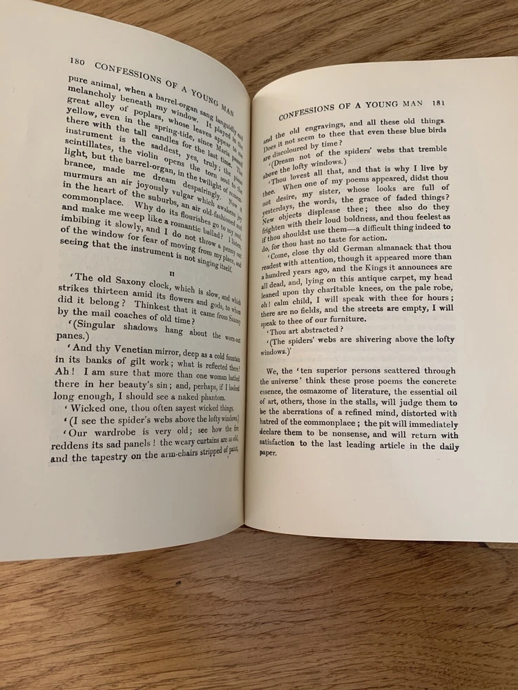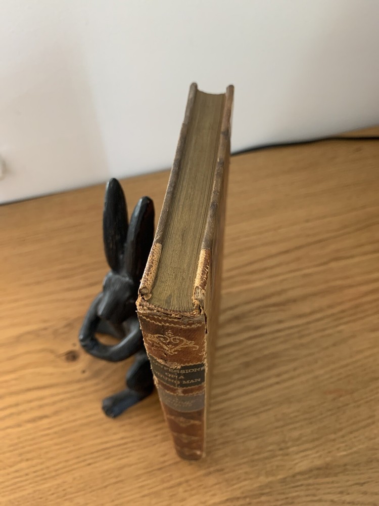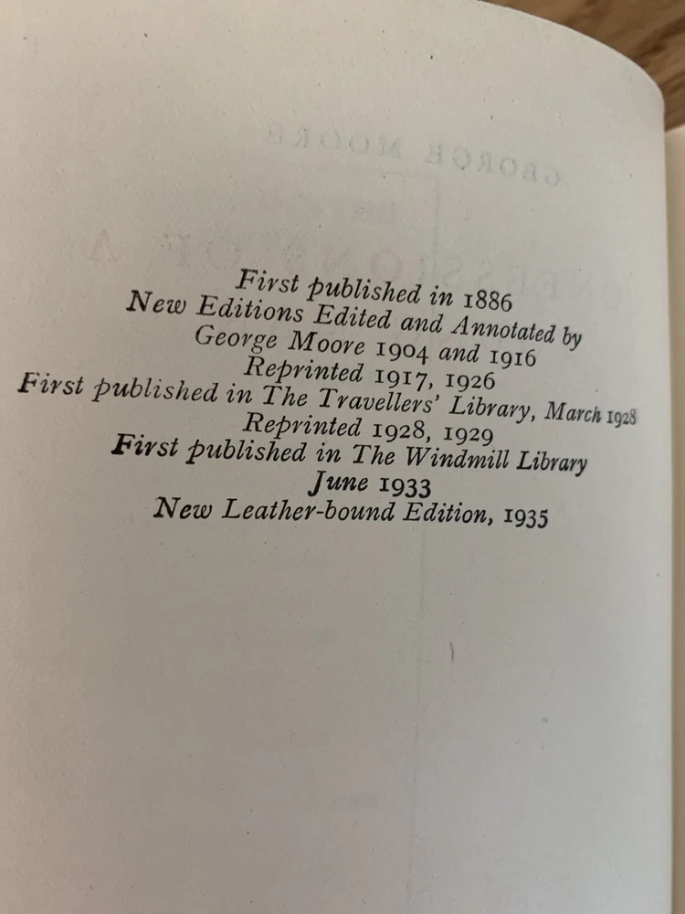 We are pleased to offer for sale the Following Item: Confessions of a Young Man We have a wide variety of interesting book for sale - please follow us to receive updates… Publisher: William Heinemann ltd Author: George Moore Date: 1935 Edition: first edition – The New Leather-bound edition Dust Jacket: n/a Description: Half leather-bound hardcover in good condition. Top edged guilt. Tan and Marble effect with bright gilt lettering to the spine. Nicked and frayed spine ends, edges, and leading corners. Marble endpapers with no marking. Interior very good for age with sound binding and clear text throughout. . xiii, 301pp Condition: Very good Our Opinion: Clean and sound copy of this edition of works by this neglected Irish writer. We are genuine bibliophile’s who have been collecting books for over 30 years. As our collection has grown, we have run out of space and decided to sell books as well as just buy – hence the formation of Huntsman’s Books - Please pop into our E-bay shop to review other books for sale . We specialise in illustrated books from the late 19 th to the early 29 th Century including, Arthur Rackham, Edmund Dulac, Willy Pogany, Kay Nielsen, Kate Greenaway, Beatrix Potter, Louis Wain, Harry Clarke, Aubrey Beardsley, Florence Upton, etc. Contact Us We can also source individual books if you have specific requirements. Please contact us if you require any further information via E-bay . If you want to keep an eye on what is coming up, just add us to your followed seller’s or favourites list. Postage UK postage is charged as stated. International postage is only an estimate. Specific Postage quotes can be provided to any given location once country and weight are known. Rough Guide for a 1KG (packed) book is – Europe £15.00, USA £19.50, Rest of World £23.00 Combined shipping costs. The highest stated shipping cost first, plus any others at minus 30% of the stated price up to a MAXIMUM 4 BOOKS. Our Grading We conservatively grade each book in an honest and objective manner. Mint/Fine: - Like new, No faults, Appears unread. Like New: - Appears unread, May have the slightest marks. Very Good: - Clean condition with no significant faults. May have a few defects. Good: - Book condition reflects its age, will have some faults, foxing, bumping, scuffing, inscriptions etc Acceptable: - Well read. Reading copy only. May have significant wear and tear, may have loose pages, plates missing, or external damage.
