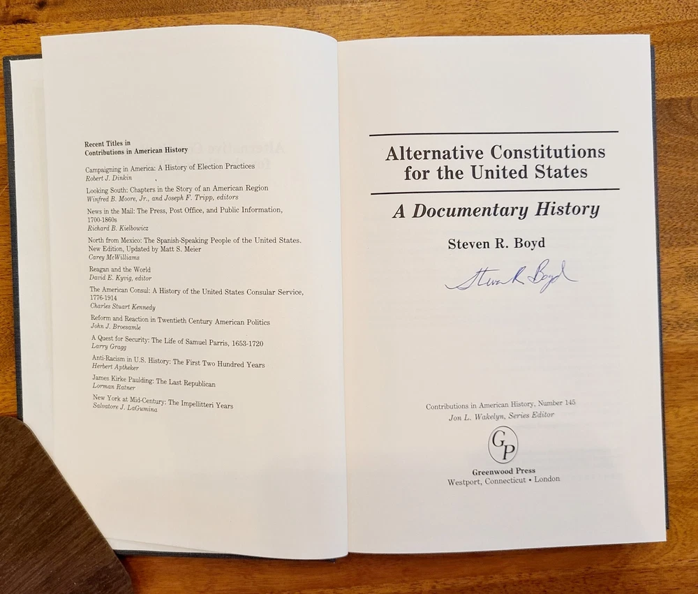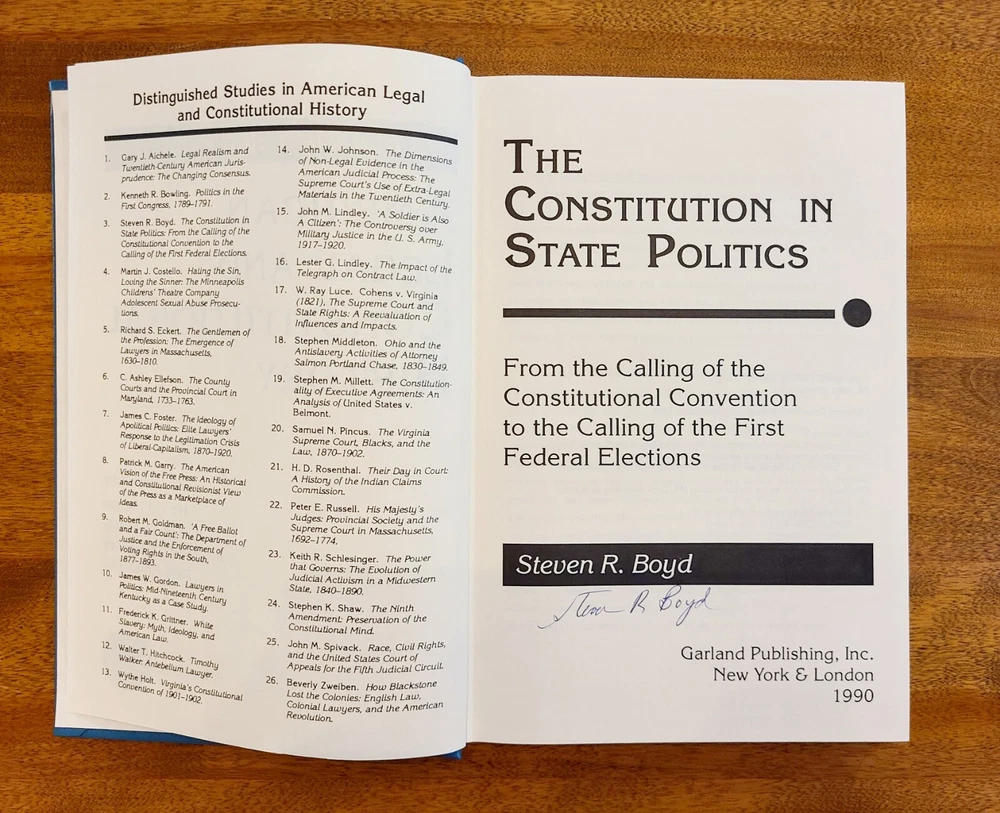 This lot of three signed hardcover books about Constitutional Political History of The United States by Steven R. Boyd is a great addition to any history buff's collection. The books are mixed in publishers. Two of the books are cloth bound, and one has a faux leather cover, making them a durable and unique resource. The books cover a range of subjects, including law, government, American history, history, legal history, modern history, and political science. They are all first editions signed by the author/editor. Condition: I strive to take excellent photos so you can accurately see the condition of the books. Shipping: I ship in boxes and not padded envelopes to ensure your new books get to you safely.