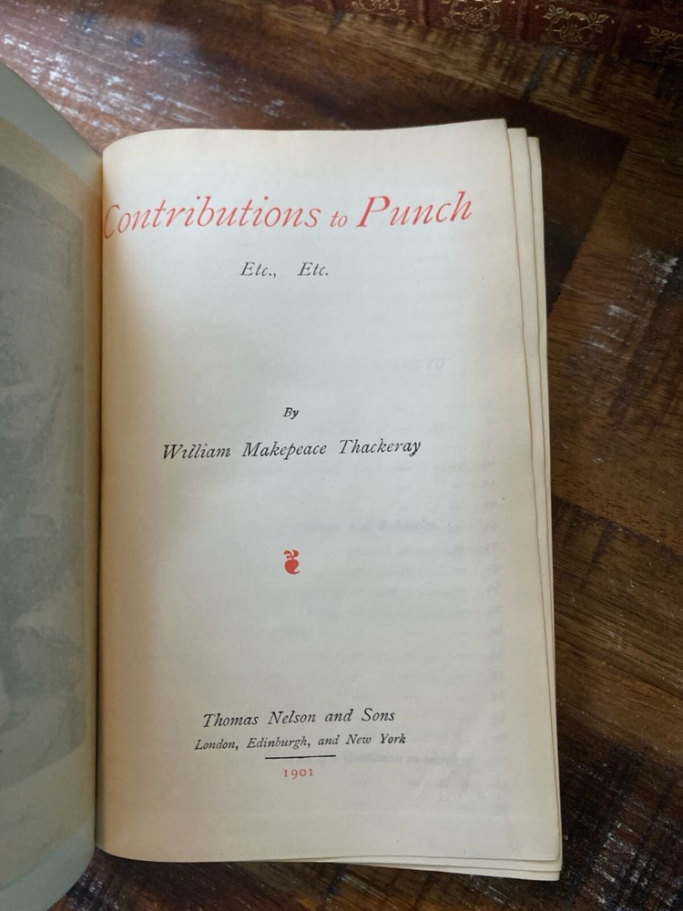 Contributions to Punch, Etc., Etc. by W.M. (William Makepeace) Thackeray 1901 Thomas, Nelson and Sons leatherbound. New Century Library Volume XIV. We use the industry standards when grading our books. New- Brand spanking new, an unread, uncirculated copy. Like New- A book with minimal wear all around, possibly unread. Very Good- A book with some minor cosmetic defects. A remainder mark may be present. Minimal writing, if any, on the interior. Good- A book that is completely intact but may show signs of heavier wear, especially the spine. May have writing on the interior, though not extensive throughout. Acceptable- A book that is intact but shows signs of heavy wear. May have extensive writing or highlights throughout. The book is complete, but that may be all that it has going for it. Though we strive for our books to all be in very good to like new condition, some rare and eclectic volumes may be lower condition. I am happy to answer any questions you may have about printings, publication years, bindings, etc. If you would like to see a picture, or additional pictures, just ask me and I will prioritize your request. Combined shipping on books! An extra $1.00 per additional book past the first. I am constantly getting new books, comics, and other ephemera. Check out my other items!