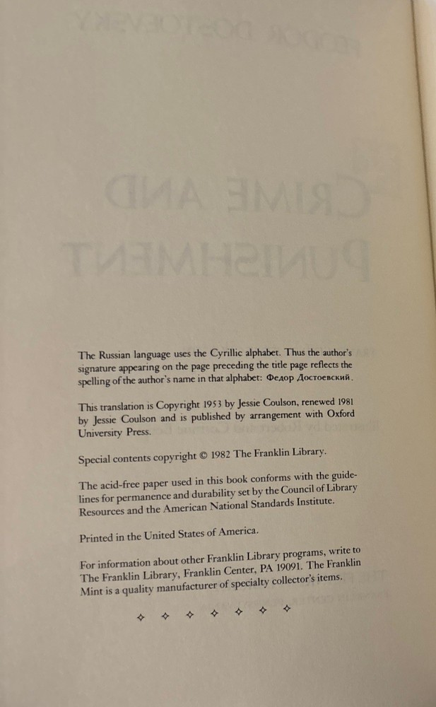 The product is a 1982 hardcover edition of "Crime and Punishment" by Feodor Dostoevsky, published by Franklin Library as part of their Franklin Library Edition series. This edition features leather binding, gilt details, a hubbed spine, and illustrations by Robert and Corinne Borja. The book is written in English and falls under the subject of literature and fiction, specifically focusing on the topic of crime. This collectible item was manufactured in the United States and is a valuable addition for book collectors and enthusiasts of Dostoevsky's works.