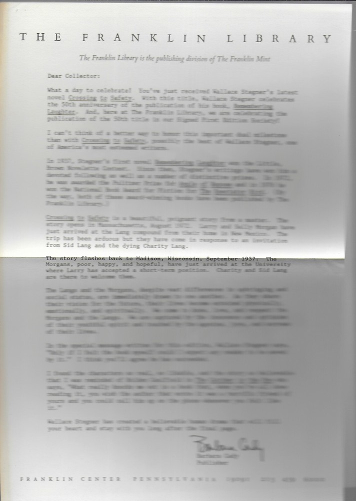 C r ossing to Safety by Walace Stegner , Signed 1 st Edition, Franklin Library, Illustrations by William Low Franklin Library , Franklin Center, PA published the book, special contents copyright 19 8 8 . Alison Lurie signed the front flyleaf. The book is part of Franklin Library’s series The Signed First Edition Society . The interior, beautiful leather cover, decorative end papers, and attached bookmark are in f ine condition. There are no marks, tears or bookplates . The page edges are richly gilded to seal out moisture. The book is 6 1/2 ” x 9 1/2 ” and 290 pages, plus a 1 page colophon . Laid in the front is the Franklin Library letter about the book and author. Please if you need any additional information and photos, eBay message me. Combine Shipping Discount!!!!! Save money when you buy more than one item (lot) from us! Except in rare cases, s & h to a U. S. address via media mail in the same box is $1.35 for each additional book. eBay may automatically send a combine invoice with the wrong s & h. Please wait to pay until you receive my combine invoice with the correct s & h. PLEASE CHECK OUT MY eBAY STORE AND OTHER AUCTIONS!!! 1 4 20241 0 2024