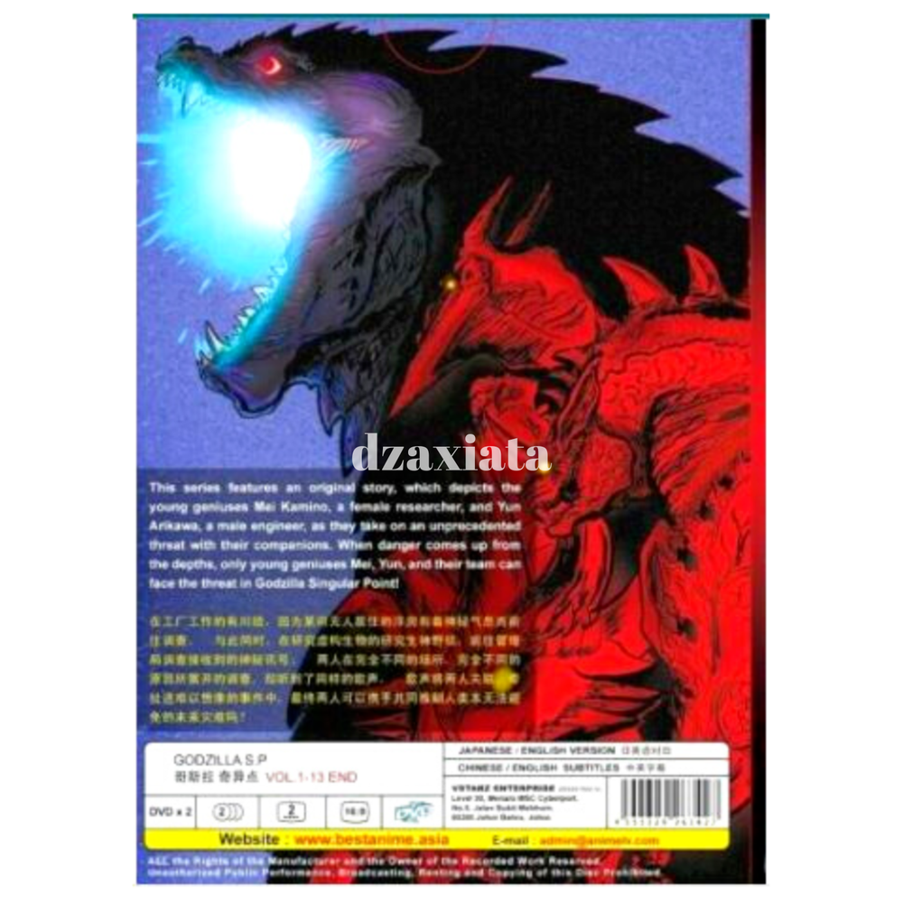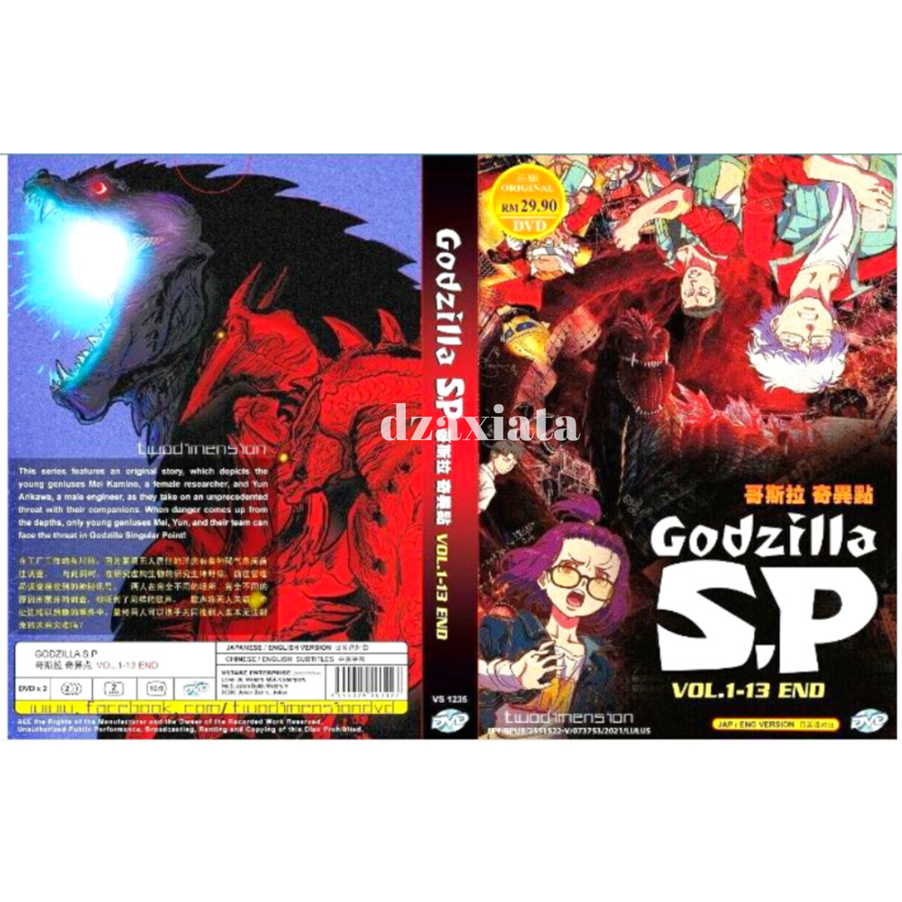 Anime DVD Godzilla S.P/Singular Point Complete TV Series (1-13 End) PRODUCT INFORMATION: Title : Godzilla S.P/Singular Point Numbers of episode : 1 - 13 (End) Numbers of discs : 2 Language : Japanese / English Subtitles : English / Chinese Format : ALL Region Condition : NEW, Original & Licensed Item STORYLINE: This series features an original story, which depicts the young geniuses Mei Kamino, a female researcher, and Yun Arikawa, a male engineer, as they take on an unprecedented threat with their companions. When danger comes up from the depths, only young geniuses Mei, Yun, and their team can face the threat in Godzilla Singular Point!
