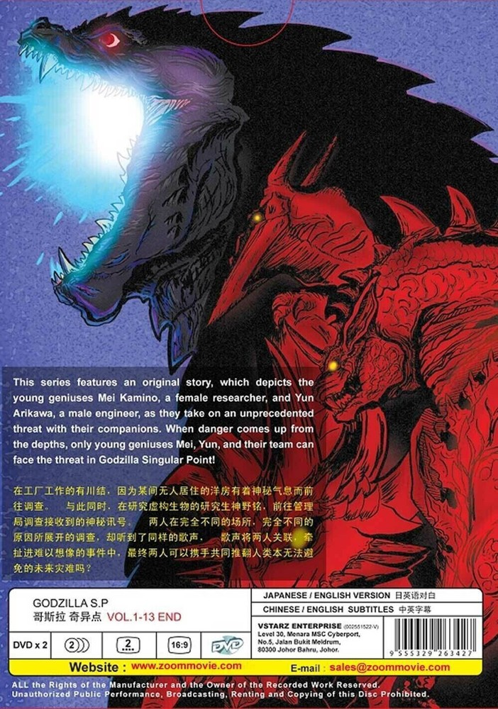 DVD Anime Godzilla: Singular Point SP (Ep. 1-13 End) All Region English Dubbed Shipping From USA Product Description: *NEW! English Audio Dubbed Version ALL Region / Region Free Optional: English Subtitle Condition: Authentic Brand NEW, Original Factory Sealed. Episode: Vol. 1-13 End No. of Discs: DVD x 2pcs Region Code: ALL Region, Region FREE "0" (Able to play on DVD Players throughout the World) Audio Language: English / Japanese Subtitles: English / Chinese Synopsis: In Nigashio City, Chiba Prefecture in the year 2030, engineer Yun Arikawa of the local "do-it-all" shop Otaki Factory investigates happenings in a Western-style mansion, long thought abandoned. Mei Kamino, a graduate student studying imaginary creatures, investigates mysterious signals received from Misakioku, the former Tsuguno district's administrative building. These two strangers, investigating mysteries in two different locations, both hear the same song. As they are brought together by this common mystery, they are led into a battle against an unprecedented threat to the universe. Episodes List: (EP.1) "Terzetto" / "A Distant Road Home" Transliteration: "Haruka Naru Ieji" (Japanese: はるかなるいえじ) (EP.2) "Gamesome" / "Midsummer Oni Festival" Transliteration: "Manatsu Oni Matsuri" (Japanese: まなつおにまつり) (EP.3) "Tigerish" / "Nobae's Terror" Transliteration: "Nobae no Kyōfu" (Japanese: のばえのきょうふ) (EP.4) "Gadabout" / "The Future Not Yet Seen" Transliteration: "Mada Minu Mirai wa" (Japanese: まだみぬみらいは) (EP.5) "Theorist" / "As Swift as the Wind" Transliteration: "Hayaki Koto Kaze no" (Japanese: はやきことかぜの) (EP.6) "Enfatico" / "Numbers Without Theory" Transliteration: "Riron Naki Sūji" (Japanese: りろんなきすうじ) (EP.7) "Omniarch" / "The Question Mark of Time" Transliteration: "Jikan no Gimonfu" (Japanese: じかんのぎもんふ) (EP.8) "Graftage" / "Phantom Figure" Transliteration: "Maboroshi no Sugata" (Japanese: まぼろしのすがた) (EP.9) "Erumpent" / "Those Who Fall" Transliteration: "Taore Yuku Hito no" (Japanese: たおれゆくひとの) (EP.10) "Encipher" / "Principles of Mechanics" Transliteration: "Rikigaku no Genri" (Japanese: りきがくのげんり) (EP.11) "Relaunch" / "Irrational Sheet Music" Transliteration: "Rifujin na Gakufu" (Japanese: りふじんながくふ) (EP.12) "Explorer" / "End of the Battle" Transliteration: "Tatakai no Owari" (Japanese: たたかいのおわり) (EP.13) "Together" / "The Two of the Beginning" Transliteration: "Hajimari no Futari" (Japanese: はじまりのふたり) _____________________________ We Only Sell Original/Genuine DVDs. All DVDs I'm selling are from Licensed Publisher in Malaysia. All our product come with original seal Authentication from Malaysia government and authorized by National Film Development Corporation Malaysia.