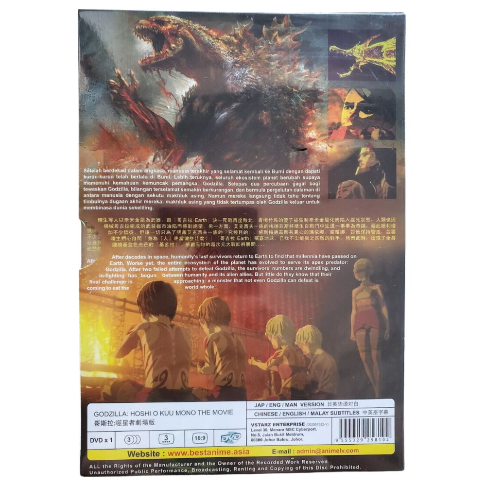 Created with Eselt - Mobile Templates for eBay Sellers Give us a call Send us a message Created with Eselt - Mobile Templates for eBay Sellers Our Store Seller Profile Feedback About us Contact Created with Eselt - Mobile Templates for eBay Sellers DVD Anime Godzilla The Movie 3 Hoshi O Kuu Mono (2019) DVD Anime Godzilla The Movie 3: Hoshi O Kuu Mono (2019) Synopsis: A door opens, and a golden seal shatters a star. It is the early 21st century. Mankind has lost the battle for planet Earth to Godzilla, and has taken to the stars in search of a new home. But the search ends in vain, forcing them and their alien allies back to Earth. But 20,000 years have passed in their absence, and the Earth is a wholly different place. The planet's flora and fauna now embody and serve Godzilla. Earth is a monster's planet, ruled by the largest Godzilla ever at 300 meters in height. Godzilla Earth. Human protagonist, Captain Haruo, yearns to defeat Godzilla and retake the planet for mankind. There, he meets aboriginal descendants of the human race, the Houtua tribe. The Houtua twin sisters, Maina and Miana, lead him to the skeletal remains of Mecha-Godzilla, an old anti-Godzilla weapon, which to everyone's surprise is still alive in the form of self-generating nanometal. Taken from the Mecha-Godzilla carcass, the nanometals have gradually been rebuilding a "Mecha-Godzilla City," a potential weapon capable of destroying Godzilla Earth. As the strategy develops, a rift forms between the humans and the Bilusaludo, one of several alien races that had joined the humans on their exodus from Earth. Their leader, Galu-gu, believes that the secret to defeating Godzilla lies in the use of superhuman powers – namely, the nanometal integration – but Haruo resists, fearing that in defeating monsters, they must not become monsters themselves. Haruo ultimately uses his means for defeating Godzilla Earth to destroy the Mecha-Godzilla city so as to prevent nanometal assimilation, killing Galu-gu. However, his childhood friend, Yuuko, has been absorbed by the nanometal integration and has fallen into a brain dead coma. The human race, once again, is lost. Metphies, commander of the priestly alien race, Exif, marvels at the miraculous survival of Haruo, he begins to attract a following. The Exif has secretly harbored this outcome as their "ultimate goal." Miana and Maina issue warnings against Metphies, while Haruo begins to question mankind's next move. With no means for defeating Godzilla Earth, mankind watches as King Ghidorah, clad in a golden light, descends on the planet. The earth shakes once again with as war moves to a higher dimension. What is Godzilla exactly? Does mankind stand a chance? Is there a future vision in Haruo's eyes? Find out in the finale. Number of Disc: 1 DVD Only Language : Japanese / English Subtitle: English / Chinese / Malay Media Type: NTSC; Widescreen 16:9, All Region Condition: NEW, Original & Licensed Item with factory sealed FREE International Shipping Created with Eselt - Mobile Templates for eBay Sellers Payment Currently we accept payment through eBay-management payment Shipping The products will be shipped via SingPost from Malaysia. Handling time is 1-3 working days. Your goods will be shipped with a valid tracking number. All our products are packed and layered with bubble wrap to reduce damages during shipment delivery. Estimated delivery process is between 11 to 23 business days after the tracking number is updated. For express shipping, the product will be shipped via DHL Express; estimated delivery process is between 7 to 11 business days after tracking is updated Returns If you have any problem with the order, please do not hesitated to contact us via eBay message. We are glad to assist you and solve the problem as soon as possible. Items can be returned within 30 days in a good condition. Other Notes: Import duties, taxes and additional charges are not included in the item price or shipping charges. Please be aware this custom import duties and taxes are buyer's responsibility Created with Eselt - Mobile Templates for eBay Sellers Links Our Store Seller Profile Feedback About us Contact More items Are you looking for something similar? See our other items! Show more items Contact Give us a call Send us a message