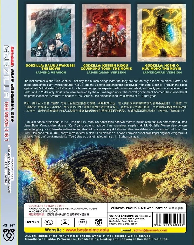 DVD Anime Godzilla The Movie 3 In 1 (Kaijuu Kessen Hoshi) Collection Set English Dubbed Description: Number of Disc: 1 DVD Audio Language: English / Japanese Subtitle: English / Chinese Disc Format: NTSC (16:9) Region Code: All Region Content: Godzilla Movie Part 1 : Kaijuu Wakusei Godzilla Movie Part 2 : Kessen Kidou Zoushoku Toshi Godzilla Movie Part 3 : Hoshi O Kuu Mono Item Condition: Brand New & Factory Seal and it is an Original Malaysian and Licensed item. All DVDs come with Original Sealed Authenticated Sticker / Hologram by Malaysia Censorship Board. Payment Method: We accept payment using eBay manage payment only. Shipping Method: Handling time is 1-3 working days. Your goods will be shipped with a valid tracking number. All products are packed, and layered with bubble wrap to reduce damages during shipment delivery. Economy Shipping : The products will be shipped via SingPost from Malaysia. Estimate delivery is between 11 to 23 business days. Expedited shipping : Approx 9-11 working days depending on location Tracking will be provided. Return Method: If you have any problem with the order, do contact us via eBay message. We are glad to assist you and solving the problem as soon as possible. Items can be returned within 30 days in a good condition. Other: Import duties, taxes, and additional charges are not included in the item price or shipping charges. Please be aware this custom import duties and taxes are buyer's responsibility.