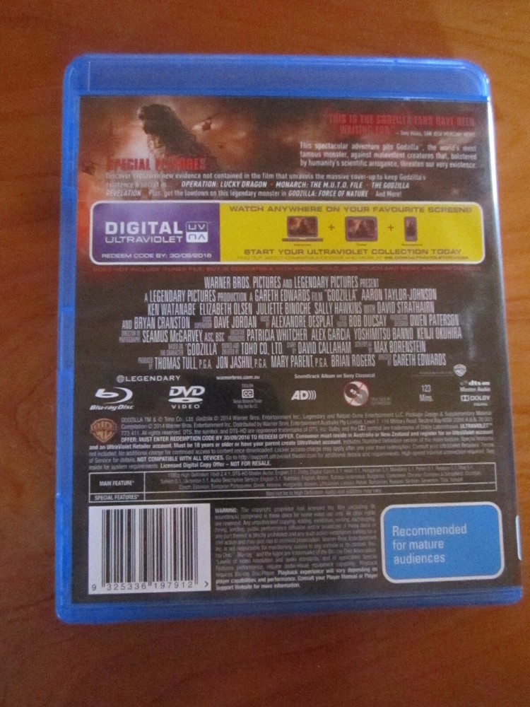 DVD BLU-RAY GODZILLA I have up for sale this great Blu-ray Dvd titled Godzilla, This is a 2 disc set. This contains special features. This is a blu-ray, plus dvd plus digital ultraviolet. This is a region B. This is in excellent condition. I will be selling heaps of other dvd's and will gladly combine postage. My son in Law and Daughter will be listing these for me as we have just lost our husband, father, and he has over 15000 dvds in his collection we will be trying to list, my son in law has been listing for 17 years with over 5000 positive feedbacks, his user name is barney-for-betty, if you would like to confirm and check out, they will be handling all my dvd listing and sales and posting. I will be selling different regions so please check out the regions, as no refunds will be given for wrong region. Highest bidder to pay postage and handling. International orders welcome and must pay postage and handling costs. Feel free to message me with any queries, I will be glad to help. Also please message with any problems once received and will also be glad to help.