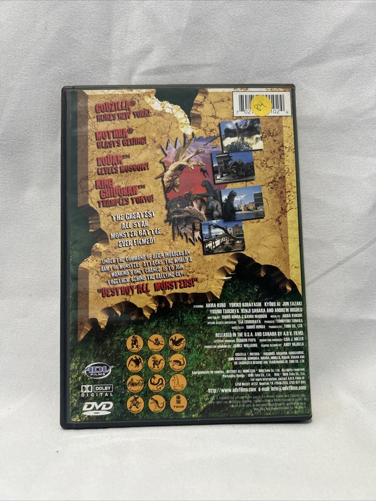 Relive the epic monster battles with the DVD "Destroy All Monsters Godzilla". This DVD features the classic science-fiction movie released in 2000, with a 16:9 aspect ratio and NTSC video format. Produced by Adv Films, the film is in English language and comes in a tall DVD case, making it a must-have for fans of the genre. Get ready to witness the ultimate showdown between Godzilla and other monsters in this thrilling and action-packed movie.