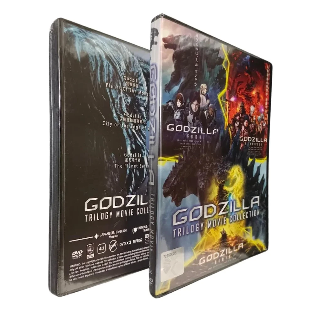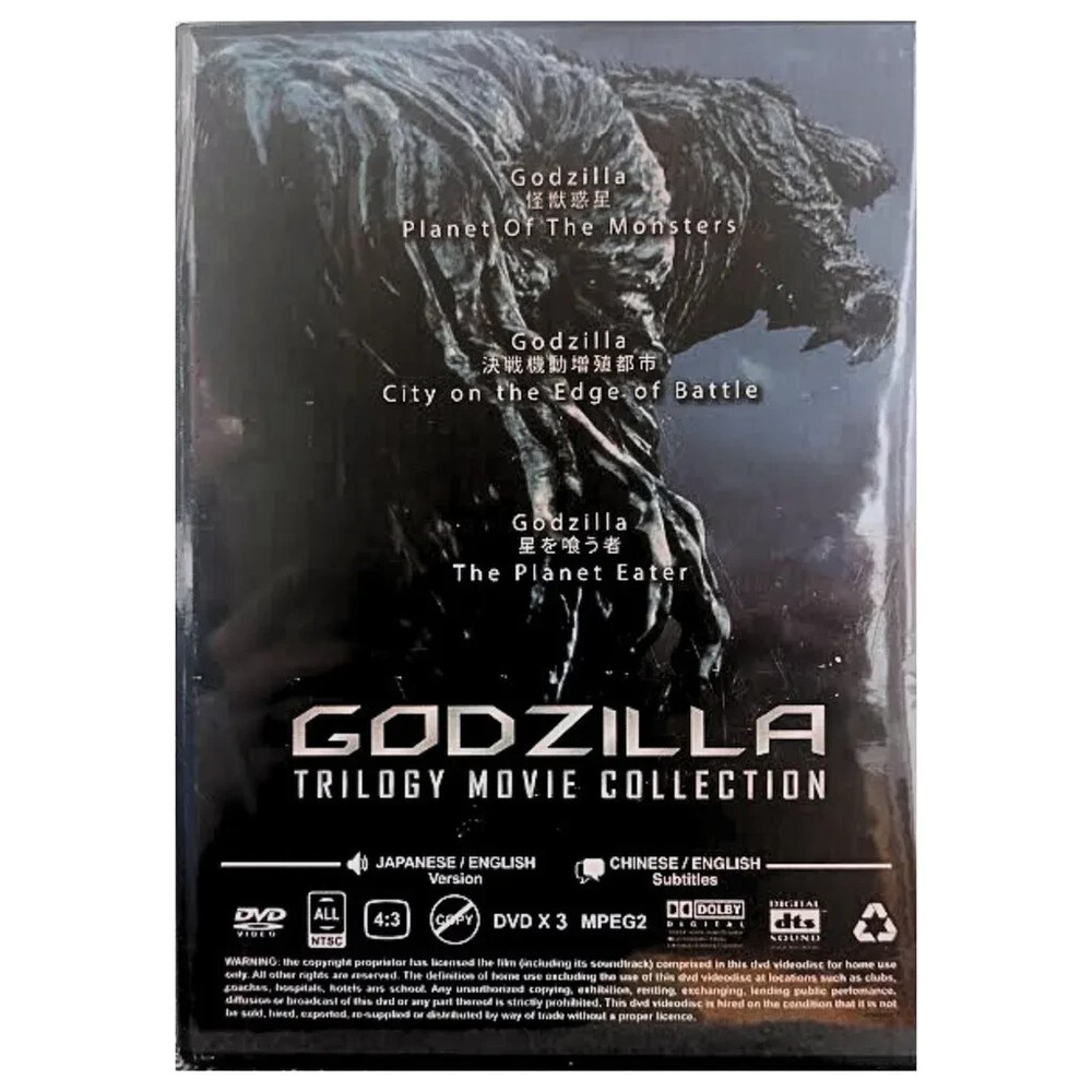 Title : DVD Godzilla Trilogy Movie Collection Anime DVD: GODZILLA *** Trilogy Movie Collection *** Language: Japanese/English Subtitle: English/Chinese Media Type: NTSC; Fullscreen 4:3, All Region DVD Edition Year: 2020 No. of Disc: 3 DVD 1. Godzilla: Planet of The Monsters 2. Godzilla: City on the Edge of Battle 3. Godzilla: The Planet Eater