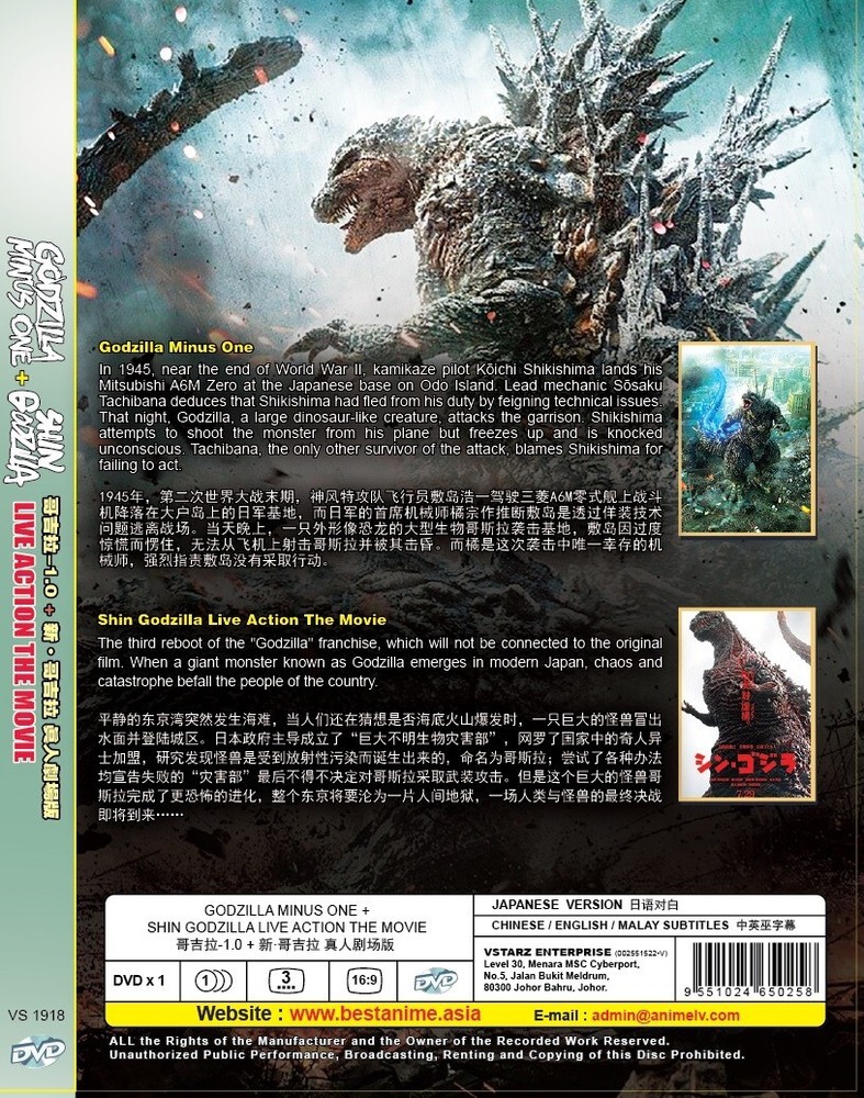 Title Name : Godzilla - 1.0 (2023 Film) + Shin Godzilla (2016 Film) No Of Disc : 1 Disc Version : Japanese Subtitle : English / Chinese Format : DVD / ALL Region *All Item Packed With Bubble Wrap *Return Accept on 14 days *Item sold are original