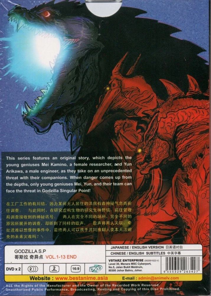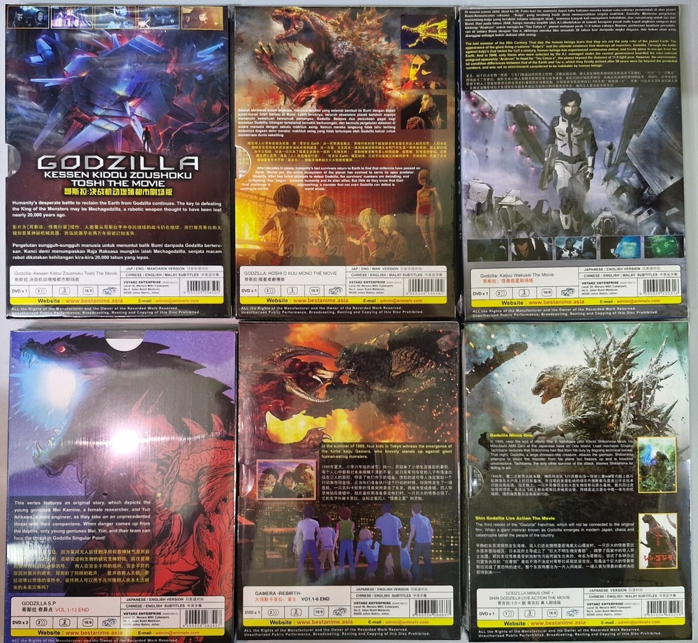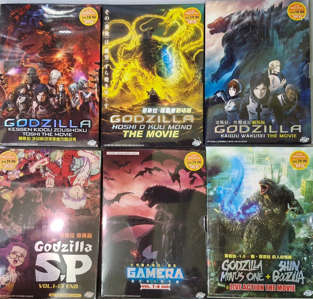 Title Name : Godzilla Live Action Movie Collection: - Godzilla - 1.0 (2023 Film) + Shin Godzilla (2016 Film) Version : Japanese Subtitle : English / Chinese Godzilla Anime Collection: 1.Godzilla Movie Part 1 : Kaijuu Wakusei 2.Godzilla Movie Part 2 : Kessen Kidou Zoushoku Toshi 3.Godzilla Movie Part 3 : Hoshi O Kuu Mono 4.Godzilla Camera - Rebirth Vol.1-6 End 5.Godzilla S.P Vol.1-13 End Version : Japanese / English Subtitle : English / Chinese No Of Disc : 6 Boxsets Format : DVD / ALL Region *All Item Packed With Bubble Wrap *Return Accept on 14 days *Item sold are original