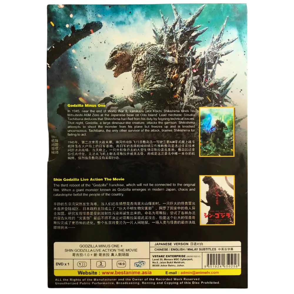 Loved this! The combo of "Godzilla Minus One" and "Shin" is amazing—intense action, cool effects, and great storytelling. English subs are clear, and the picture quality is sharp. The all-region DVD plays perfectly, and free shipping was a nice bonus. A must-have for kaiju fans!