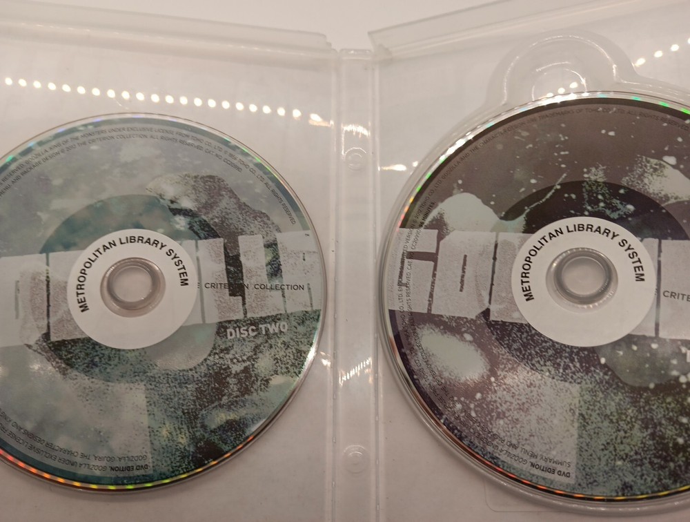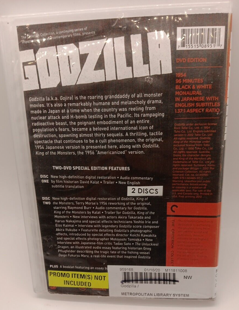 DVD Godzilla, Movie 2 disk Directed by Ishiro Honda ( Ex-lib) When the Japanese freighter Eiko-maru is destroyed near Odo Island, another ship—the Bingo-maru —is sent to investigate, only to meet the same fate with few survivors. A fishing boat from Odo is also destroyed, with one survivor. Fishing catches mysteriously drop to zero, blamed by an elder on the ancient sea creature known as " Godzilla ". Reporters arrive on Odo Island to further investigate. A villager tells one of the reporters that something in the sea is ruining the fishing. That evening, a storm strikes the island, destroying the reporters' helicopter, and Godzilla, briefly seen, destroys 17 homes and kills nine people and 20 of the villagers' livestock. Odo residents travel to Tokyo to demand disaster relief. The villagers' and reporters' evidence describes damage consistent with something large crushing the village. The government sends paleontologist Kyohei Yamane to lead an investigation on the island, where giant radioactive footprints and a trilobite are discovered. The village alarm bell is rung and Yamane and the villagers rush to see the monster, retreating after seeing that it is a giant dinosaur . Yamane presents his findings in Tokyo, estimating that Godzilla is 50 meters (160 ft) tall and has evolved from an ancient sea creature becoming a terrestrial creature. He concludes that Godzilla has been disturbed by underwater hydrogen bomb testing. Debate ensues about notifying the public about the danger of the monster. Meanwhile, 17 ships are lost at sea. Proceeds benefit the Oklahoma City Metropolitan Library System. Feedback on purchases is much appreciated. Shipping for purchases made are every Monday Wednesday and Friday. All refunds and any other issues will be addressed at that time. Expect additional delays for Holidays. Combined shipping is available; please add all items to your cart and check out all at one time for combined shipping to apply.