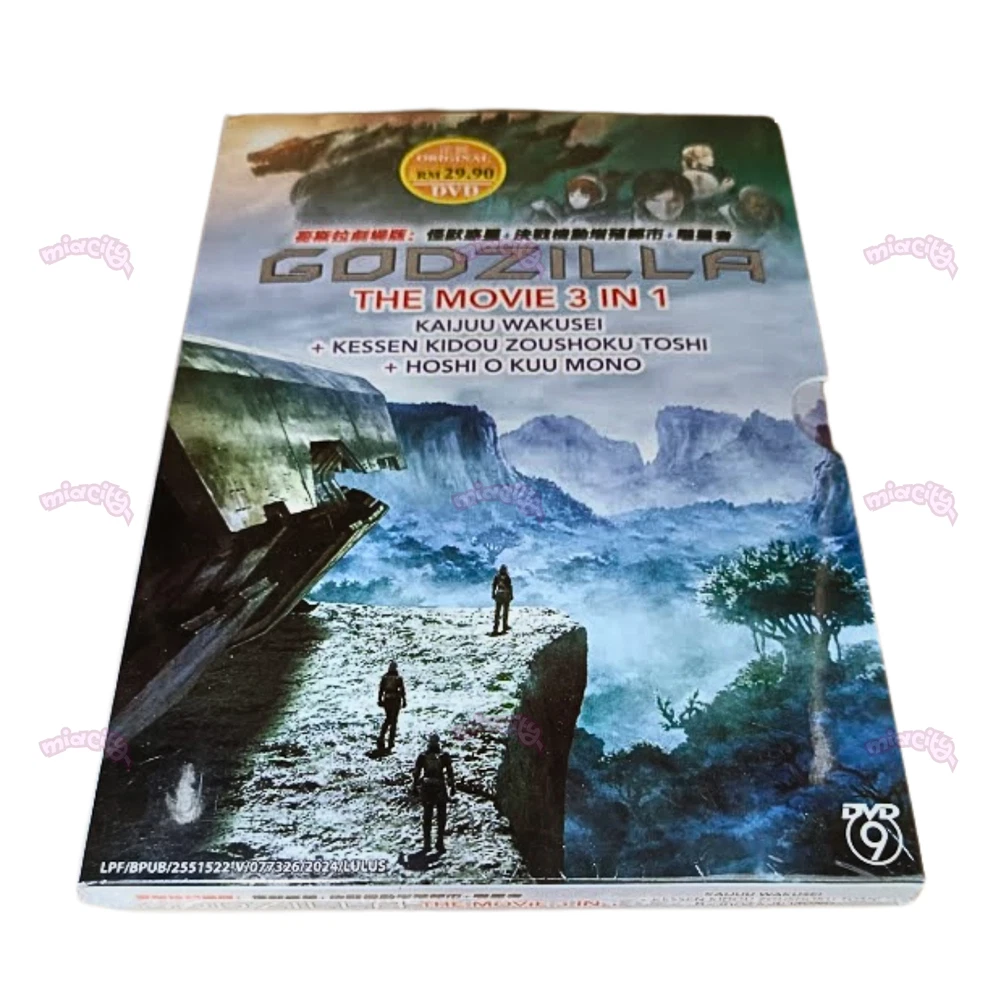 Godzilla The Movie 3 in 1: Kaijuu Wakusei / Kessen Kidou Zoushoku Toshi / Hoshi wo Kuu Mono - *English Dubbed* Product Description: Number of Disc. : 1 DVD Episodes : 3 Movies Audio (Dialogue): English / Japanese Subtitled : English / Chinese / Malay DVD Region Code : Region Free, All (NTSC) Synopsis: Godzilla 1: Kaijuu Wakusei (Planet of the Monsters): Twenty thousand years after the fall of humanity, Earth succumbed to legions of ravenous creatures who now freely roam the planet. Far away in the depths of space, the last surviving members of humanity float aimlessly in the same ship they escaped Earth with so many years ago. With the spacecraft running dangerously low on resources, the survivors' leading council must decide on their path forward: should they continue to gamble on finding another Earth-like planet to inhabit, or take to heart an anonymous essay theorizing what may be the only weakness of the "Godzilla," who forced the last remnants of humanity off their home world? The author of the controversial essay is Haruo Sakaki, a man who witnessed the death of his parents to Godzilla at a young age, which has led him to harbor an obsessive hatred for the monster. Now, he spearheads the operation aimed at reclaiming humanity's birthright from the king of monsters and slaying him once and for all. But, alongside humanity, Earth has undergone drastic change since their departure; Godzilla and its numerous spawns may pale in comparison to the darkness lurking within the hearts of this close-knit community of survivors. Godzilla 2: Kessen Kidou Zoushoku Toshi (City on the Edge of Battle): After a desperate battle and many losses, humans finally slay Godzilla—the monster that caused humanity to flee Earth 20 thousand years prior. But the creature Haruo Sakaki's troops killed was not alone; there existed another Godzilla on Earth yet to be defeated. Grievously wounded from the first conflict, Sakaki wakes up in the home of a young girl who is a member of the Houtua tribe. Bearing a shocking resemblance to humans, the Houtua have adapted to survive the changed climate of the planet that had long been abandoned. With most of their resources depleted, the remaining members of Sasaki's special forces struggle with the decision to abandon their mission and their home planet or to fight an improbable battle. Hope is not completely lost however, as the members from the Bilusaludo race of aliens discover remnants of their anti-Godzilla weapon Mechagodzilla. Even with this powerful weapon in their arsenal, victory seems impossible to grasp: Godzilla has spent all this time evolving and preparing to defeat anyone who dares to challenge its superiority. Godzilla 3: Hoshi wo Kuu Mono (The Planet Eater): With the defeat of the Bilusaludo's nanometal city, the destruction of humanity seems inevitable. Worse yet, Captain Haruo Sakaki's refusal to sacrifice his humanity has come under fire from the remaining Bilusaludo troops, who blame him for their defeat. In their darkest moment, the few surviving humans turn to the religion of the Exifs, which promises that devotion is the path to salvation from Godzilla. However, the Exif are not what they seem. As the survivors become more and more zealous in their devotion, Sasaki wonders what exactly the priest Metphies is hiding—especially regarding his relationship with the monster known as Ghidorah.