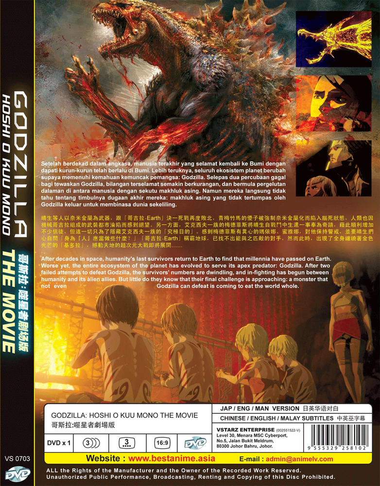 Anime DVD: Godzilla The Movie 3: Hoshi O Kuu Mono (2019) sku no: *SKCT-210923529* weight: 160g Product Description: Language: Japanese/English/Mandarin Subtitle: English/Chinese/Malay Media Type: NTSC; Widescreen16:9, All Region Production: 2019 No. of Disc: 1 DVD Synopsis: A door opens, and a golden seal shatters a star. It is the early 21st century. Mankind has lost the battle for planet Earth to Godzilla, and has taken to the stars in search of a new home. But the search ends in vain, forcing them and their alien allies back to Earth. But 20,000 years have passed in their absence, and the Earth is a wholly different place. The planet's flora and fauna now embody and serve Godzilla. Earth is a monster's planet, ruled by the largest Godzilla ever at 300 meters in height. Godzilla Earth. Human protagonist, Captain Haruo, yearns to defeat Godzilla and retake the planet for mankind. There, he meets aboriginal descendants of the human race, the Houtua tribe. The Houtua twin sisters, Maina and Miana, lead him to the skeletal remains of Mecha-Godzilla, an old anti-Godzilla weapon, which to everyone's surprise is still alive in the form of self-generating nanometal. Taken from the Mecha-Godzilla carcass, the nanometals have gradually been rebuilding a "Mecha-Godzilla City," a potential weapon capable of destroying Godzilla Earth. As the strategy develops, a rift forms between the humans and the Bilusaludo, one of several alien races that had joined the humans on their exodus from Earth. Their leader, Galu-gu, believes that the secret to defeating Godzilla lies in the use of superhuman powers – namely, the nanometal integration – but Haruo resists, fearing that in defeating monsters, they must not become monsters themselves. Haruo ultimately uses his means for defeating Godzilla Earth to destroy the Mecha-Godzilla city so as to prevent nanometal assimilation, killing Galu-gu. However, his childhood friend, Yuuko, has been absorbed by the nanometal integration and has fallen into a brain dead coma. The human race, once again, is lost. Metphies, commander of the priestly alien race, Exif, marvels at the miraculous survival of Haruo, he begins to attract a following. The Exif has secretly harbored this outcome as their "ultimate goal." Miana and Maina issue warnings against Metphies, while Haruo begins to question mankind's next move. With no means for defeating Godzilla Earth, mankind watches as King Ghidorah, clad in a golden light, descends on the planet. The earth shakes once again with as war moves to a higher dimension. What is Godzilla exactly? Does mankind stand a chance? Is there a future vision in Haruo's eyes? Find out in the finale.